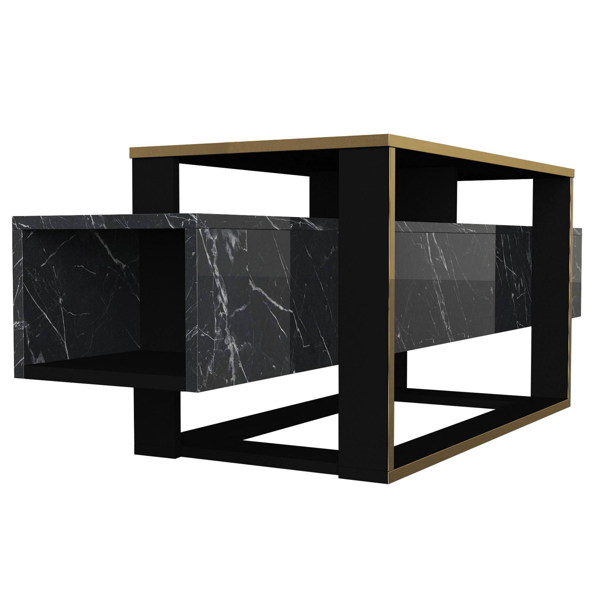 Vyrobená je z laminovaného dreveného materiálu, pre ktorý je typická ľahká udržiavateľnosť aj dlhá životnosť. Korpus prostrednej časti imituje mramorovú dosku – tá komode dodáva kontrastný rozmer a interiéru punc luxusu. Mramorový korpus obopína konštrukcia so zlatými prvkami, ktorá v spodnej časti prirodzene prechádza do stabilnej podnože.