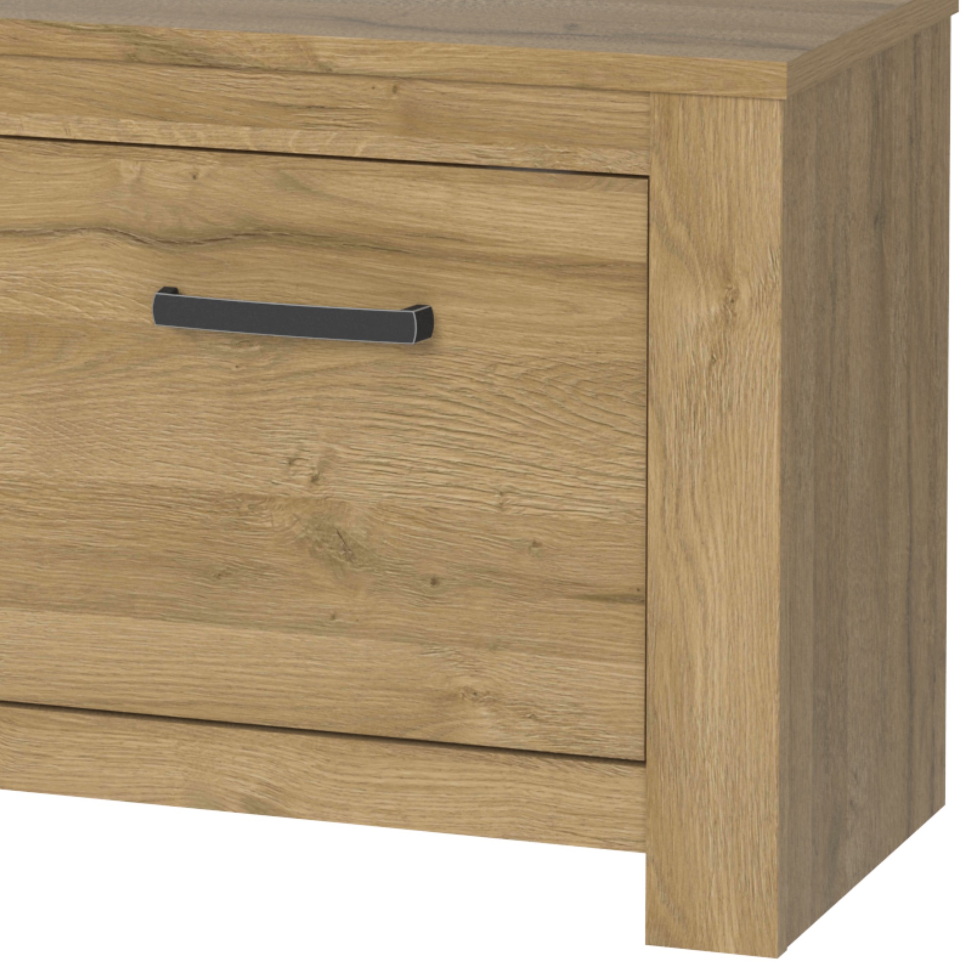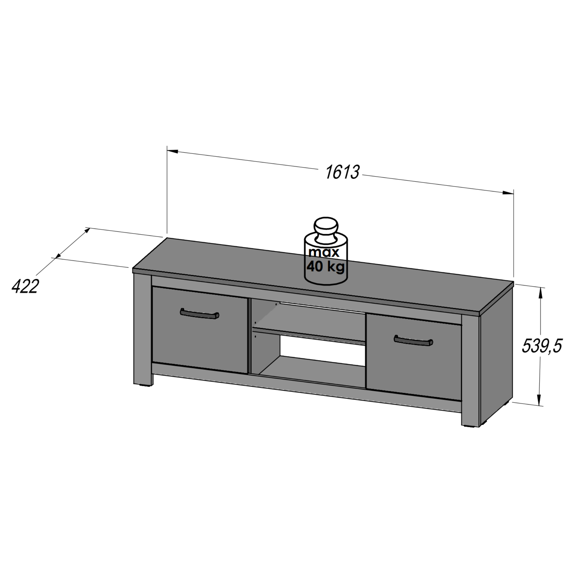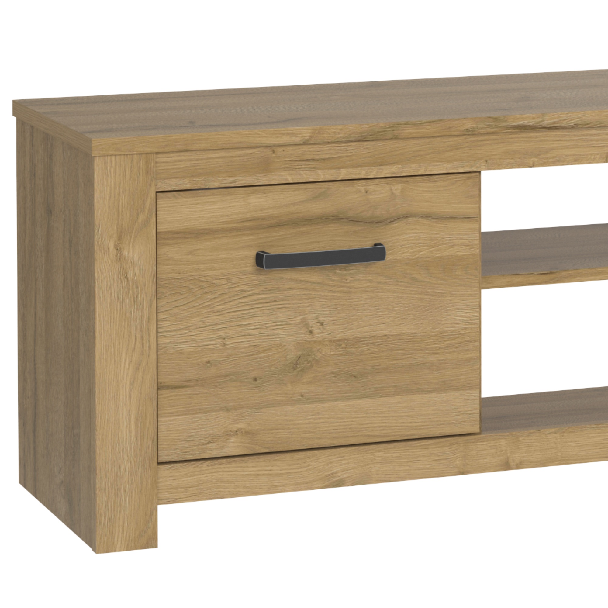 TV komoda CUBA zútulní vašu obývaciu izbu svojim elegantným vzhľadom. Priestor komody obsahuje otvorenú a uzavretú časť ponúkajúcu dostatok úložného aj odkladacieho miesta na všetko potrebné. Budete tak mať k dispozícii celkom tri police, z toho za každými dvierkami je schovaná vždy jedna polica. Pre ľahšiu manipuláciu sú dvierka vybavené decentnými rúčkami. Komoda je vyrobená z laminovaného materiálu, ktorého povrch sa vyznačuje jednoduchou údržbou. Svojím spracovaním vytvára vzhľad masívneho dreva v dekore duba.
