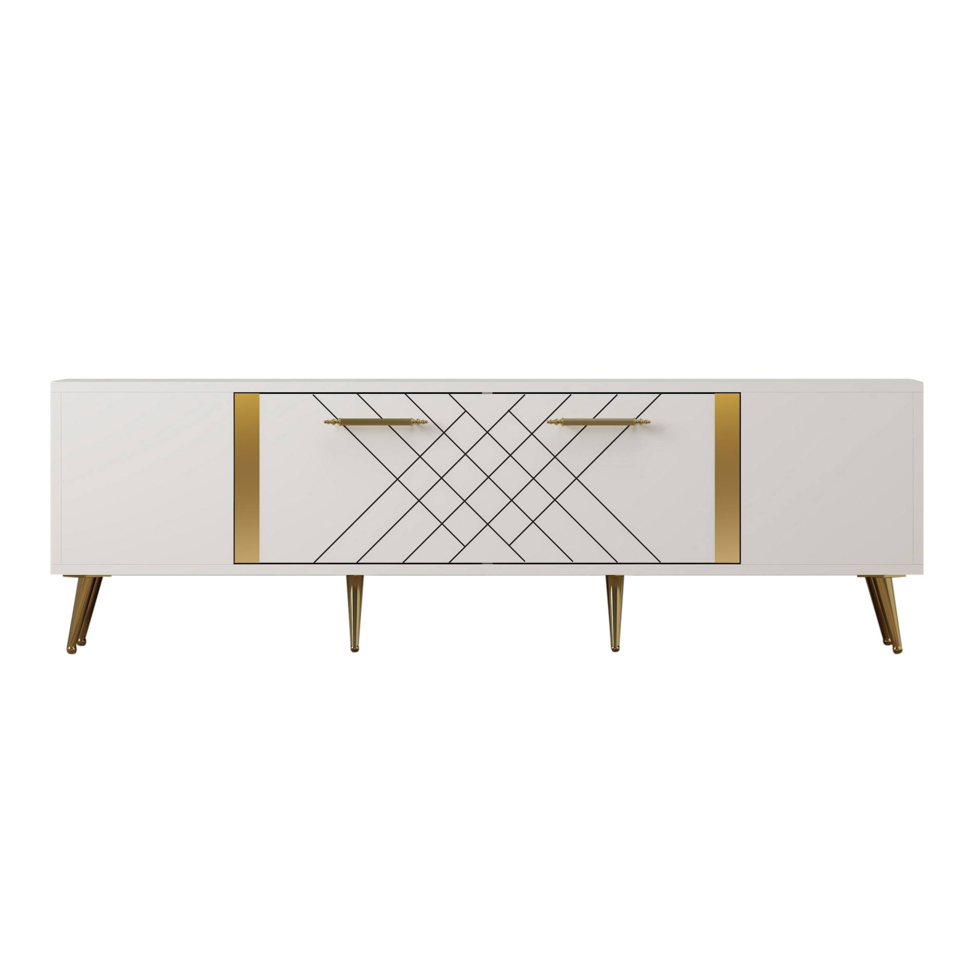 Vrchná časť komody ponúka dostatok priestoru nielen na samotnú televíziu, ale aj na TV príslušenstvo a ďalšie predmety, ktoré chcete mať po ruke. Vnútri komody sa nachádzajú dva úložné priestory, ktoré sa zakrývajú výklopnými dvierkami. Komoda stojí na vysokých nôžkach, ktoré umožňujú ľahké upratovanie priestoru pod ňou. Biely povrch umožňuje vyniknúť zlatým detailom, ktoré komode dodávajú nádych elegancie.