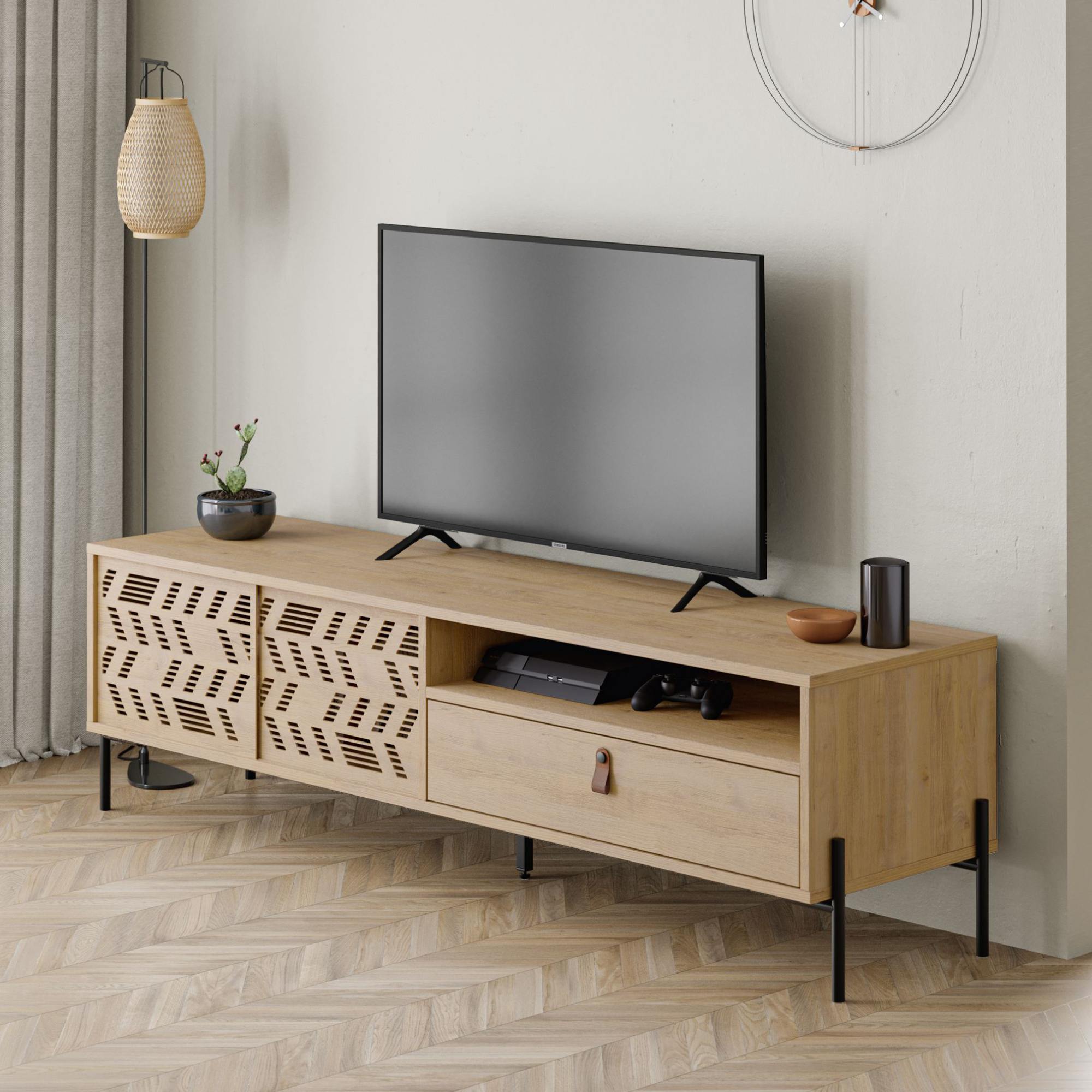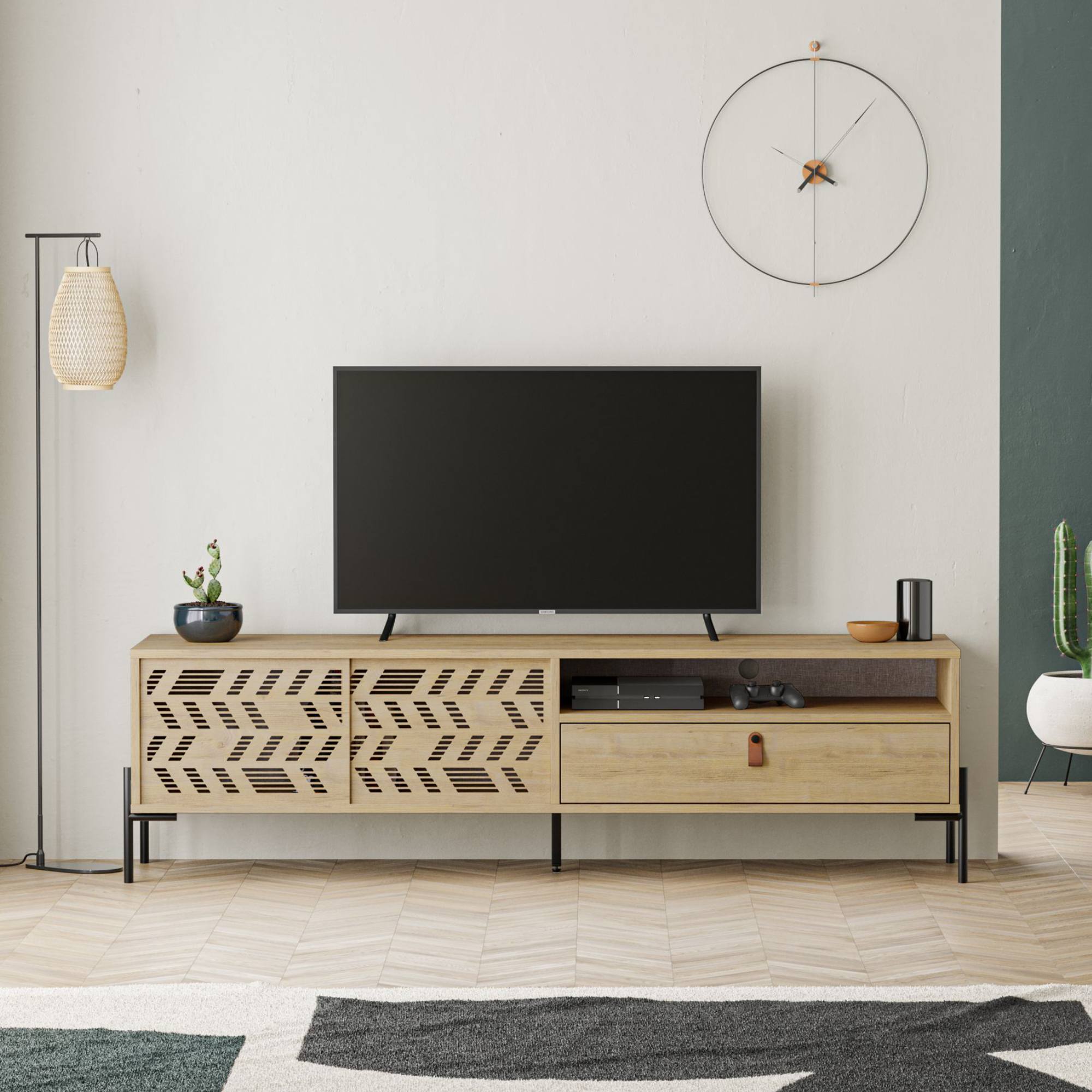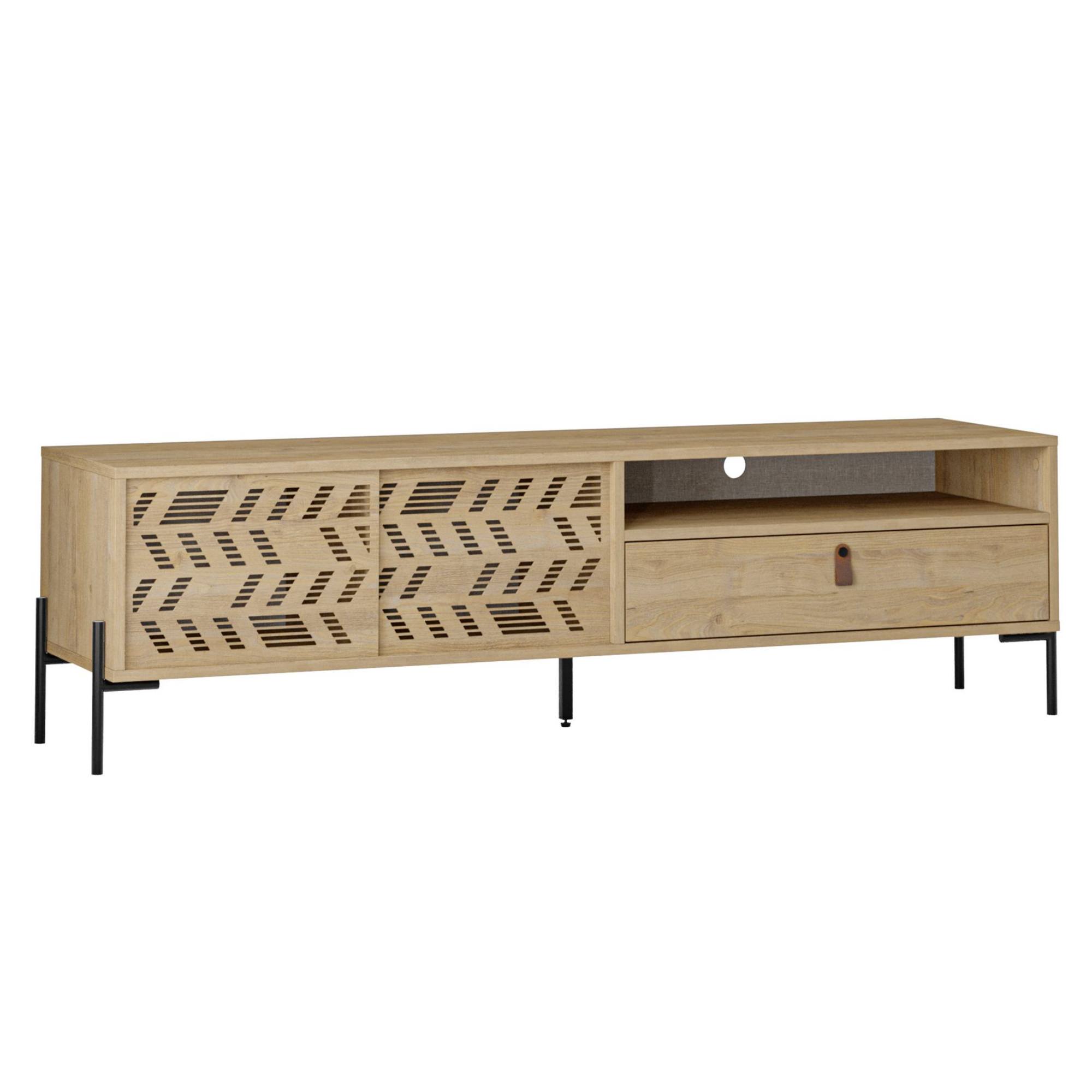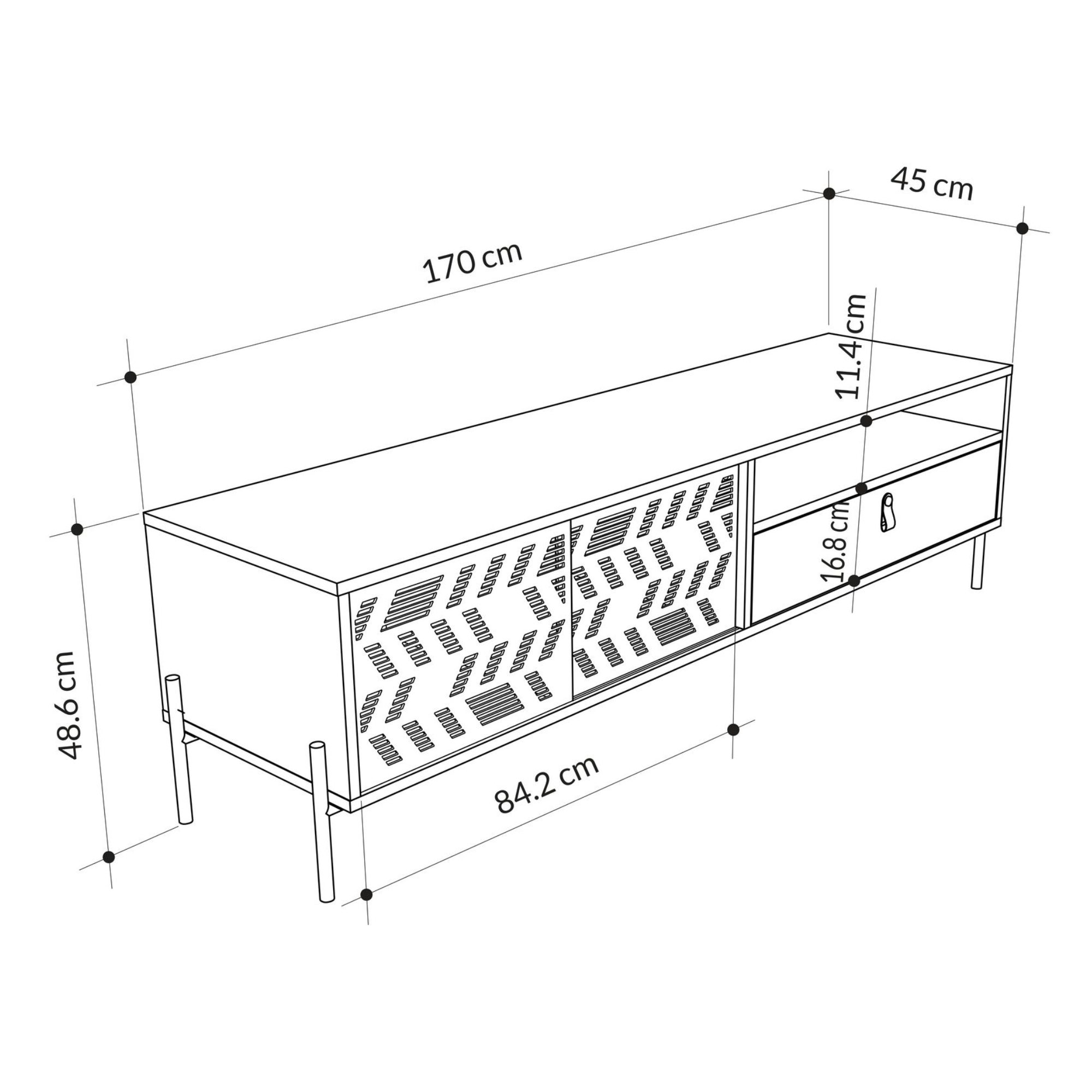 Disponuje 2 posuvnými dvierkami s úložným priestorom s dostatkom miesta na odloženie všetkého, čo potrebujete mať po ruke. Ďalej máte k dispozícii 1 zásuvku s praktickou rúčkou na menšie doplnky. Je tiež vybavená otvoreným úložným priestorom s otvorom na kabeláž, ktorý je ideálny na umiestnenie set-top boxu, DVD prehrávača či inej elektroniky. Vrchná doska so šírkou 170 cm ponúka priestor na televíziu aj dekorácie. Dvierka sú doplnené originálnym dekorom, ktorý oživuje inak jednoduchý vzhľad. Vďaka ich vyhotoveniu bez rúčok dizajn pekne vyniká.