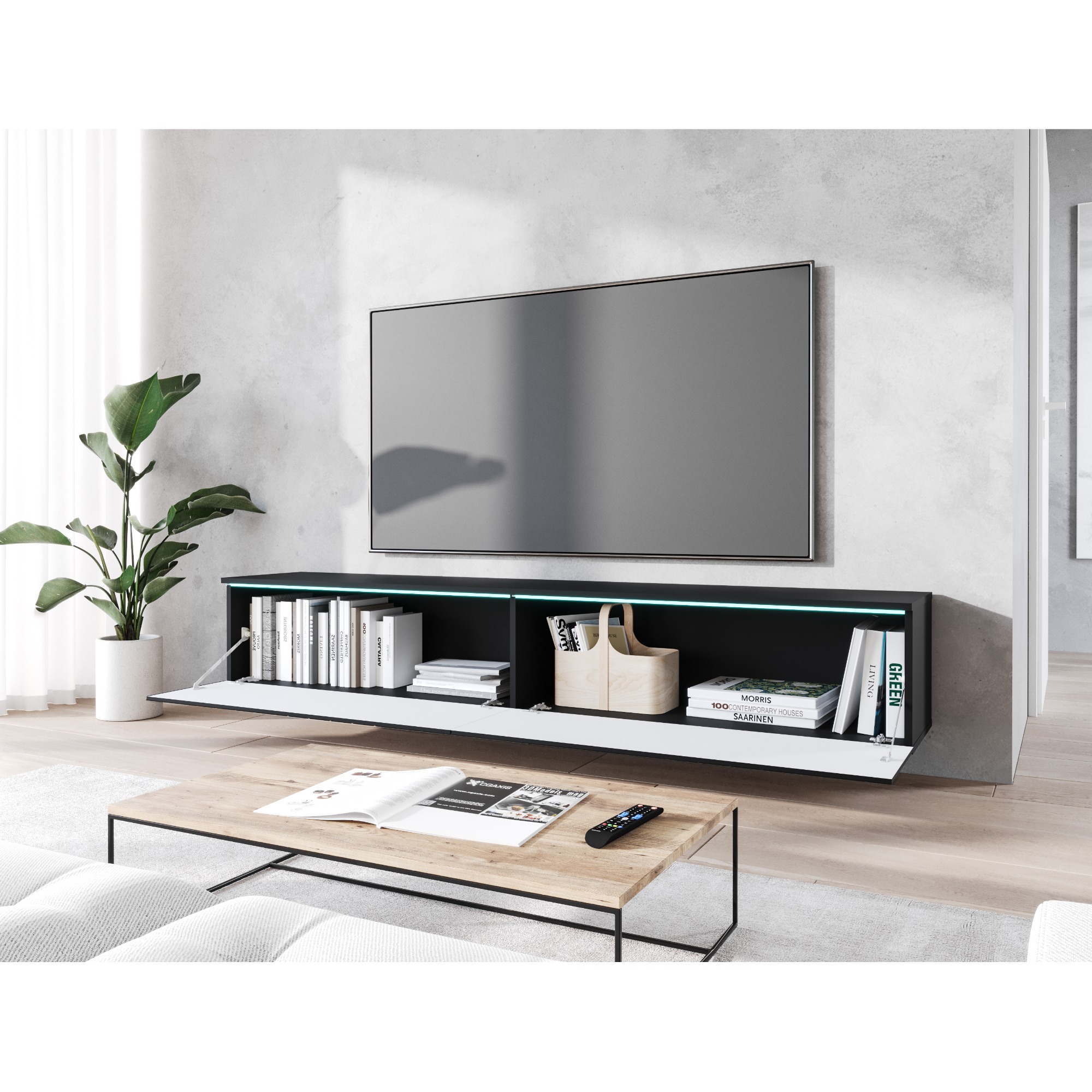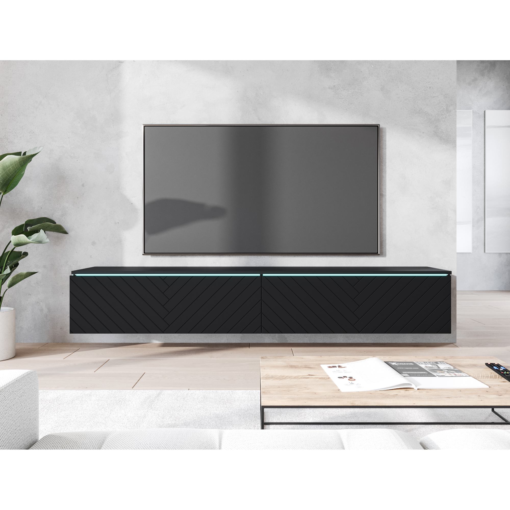 TV komoda DOROTHE 180 vybavená praktickým LED osvetlením je skvelou voľbou do každej moderne zariadenej obývacej izby.