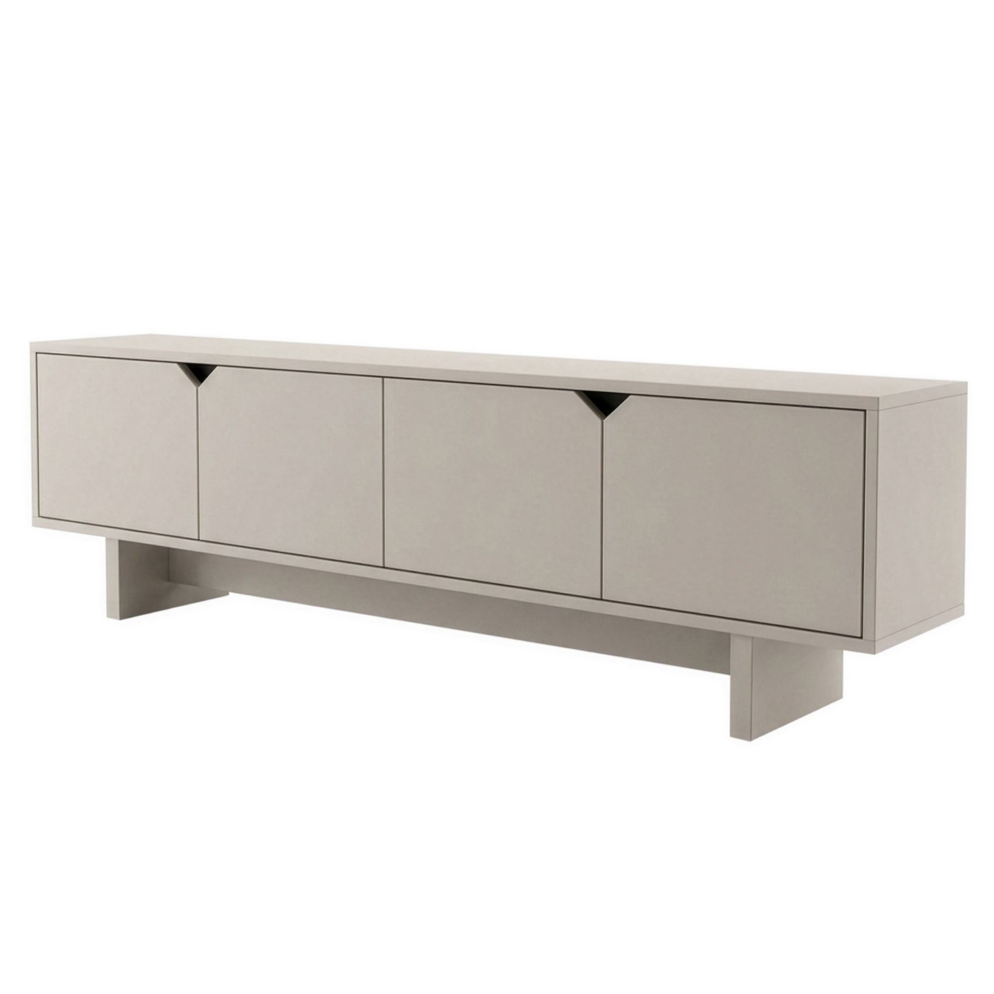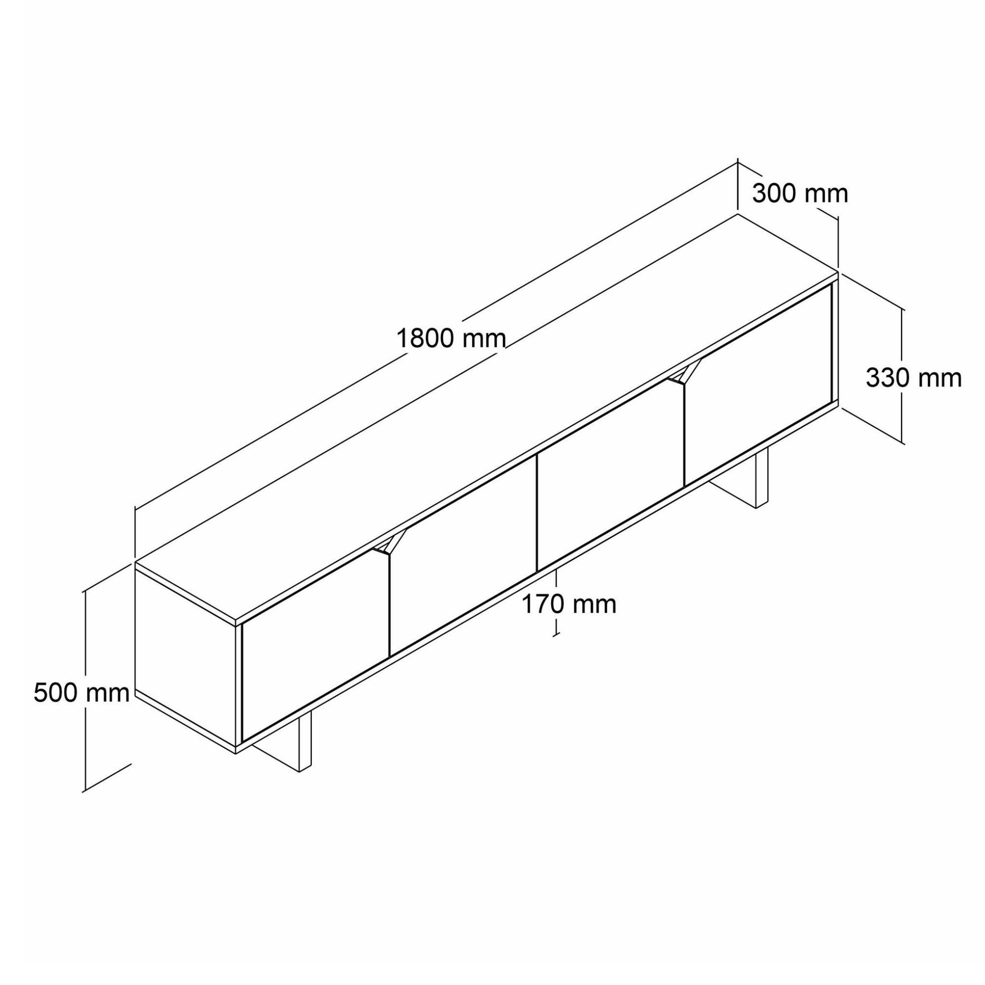 Disponuje 4 otočnými dvierkami, ktoré odkrývajú 2 oddelené úložné priestory. Tie vytvárajú dostatok miesta na odloženie všetkého, čo potrebujete mať po ruke. Vrchná doska so šírkou 180 cm ponúka priestor na televíziu, elektroniku či dekorácie. Vyhotovenie bez rúčok podčiarkuje čistý vzhľad komody, zatiaľ čo praktické otvory sa postarajú o jednoduché otváranie aj štýlový vzhľad.