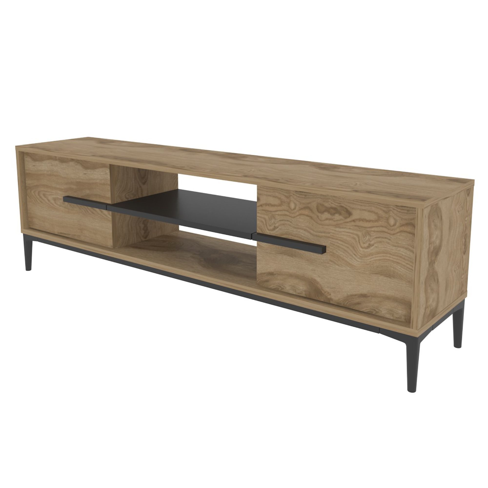Uprostred komody sa nachádza otvorený úložný priestor s 1 policou. Ten je ideálny na umiestnenie set-top boxov, DVD prehrávačov a inej elektroniky. Ďalej disponuje 2 otočnými dvierkami, za ktorými nájdete ďalší úložný priestor. Ten poskytuje dostatok miesta na odloženie všetkého, čo potrebujete mať po ruke. Vrchná doska so šírkou 120 cm ponúka priestor pre televíziu, ovládače aj dekorácie. Zaujímavým dizajnovým prvkom sú úchyty, ktoré plynulo nadväzujú na policu a ozvláštňujú inak jednoduchý dizajn komody.