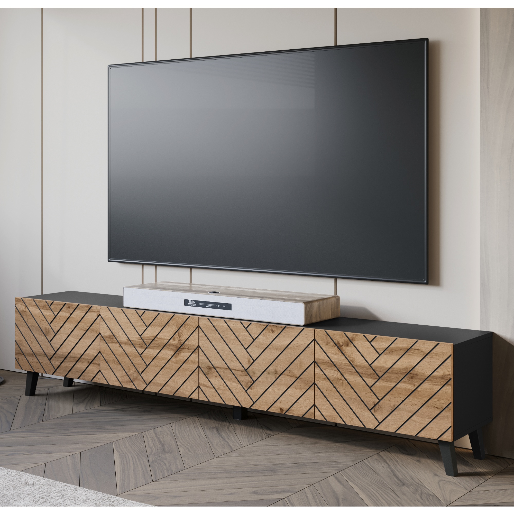 Pretože táto TV komoda ponúka dostatok úložného priestoru, je praktickým pomocníkom, ktorý nájde využitie v každej obývacej izbe. TV komoda stojí na vysokých nôžkach, ktoré uľahčujú upratovanie pod ňou.