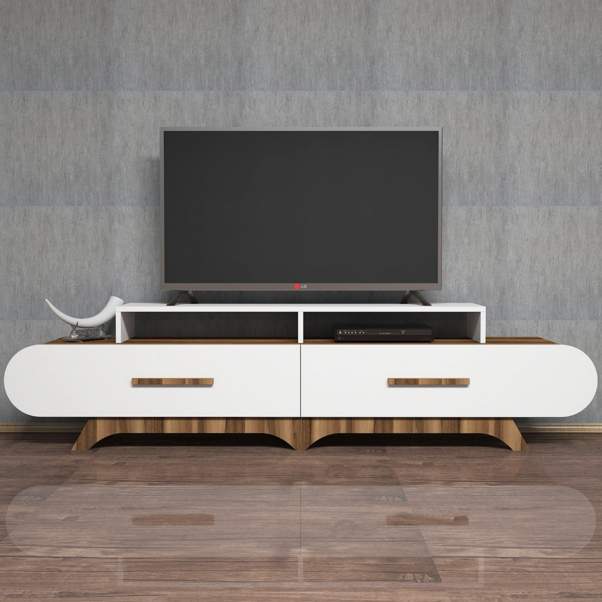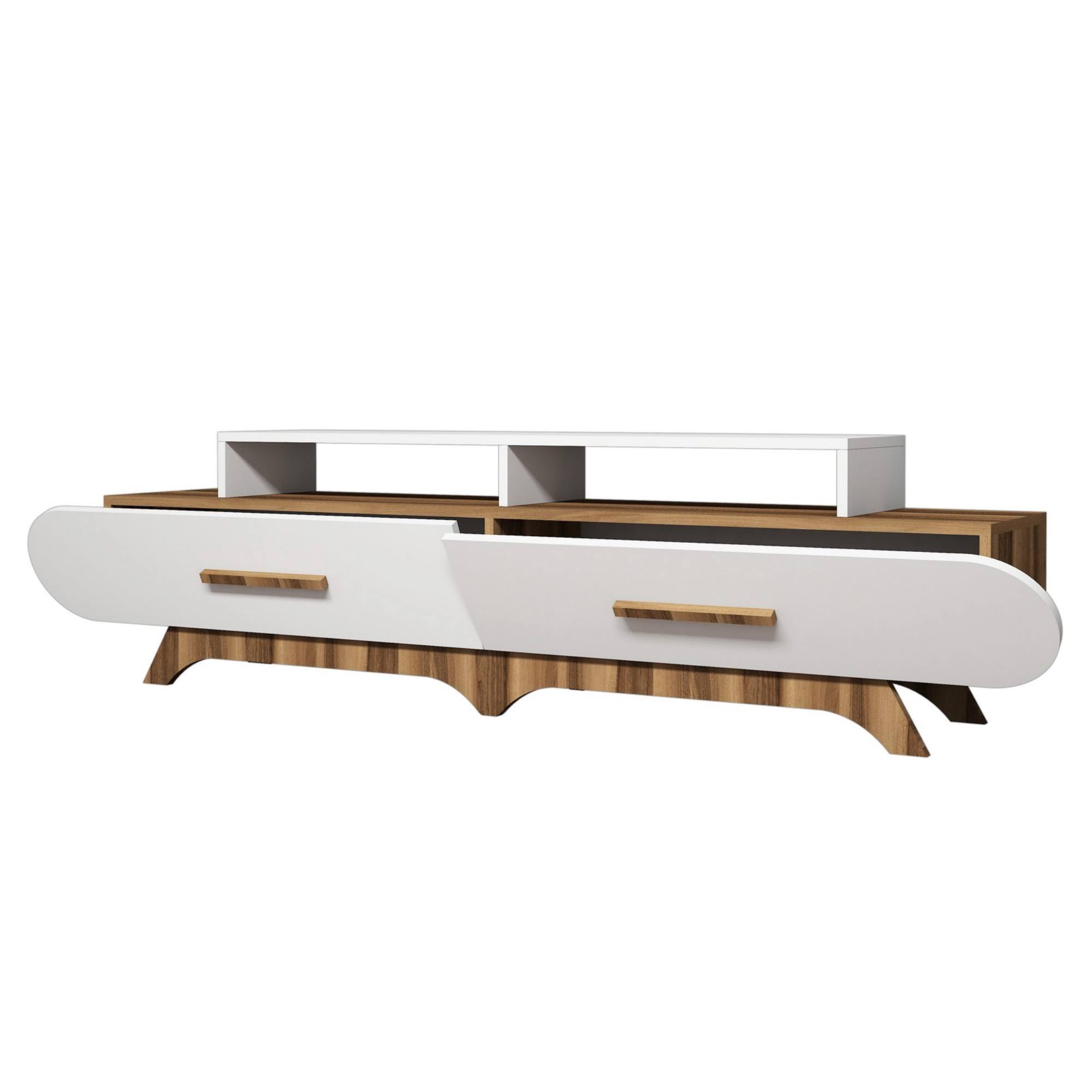 Disponuje 2 výklopnými dvierkami, za ktorými sa nachádza úložný priestor s dostatkom miesta na odloženie všetkého, čo potrebujete mať poruke. Dvierka sú vybavené praktickými rúčkami. Na vrchnej doske so šírkou 205 cm je umiestnená polica so šírkou 130 cm, ktorá slúži na umiestnenie televízora. Pod policou sa nachádzajú 2 oddelené úložné priestory, ideálne na umiestnenie set top boxov, DVD prehrávačov a inej elektroniky.