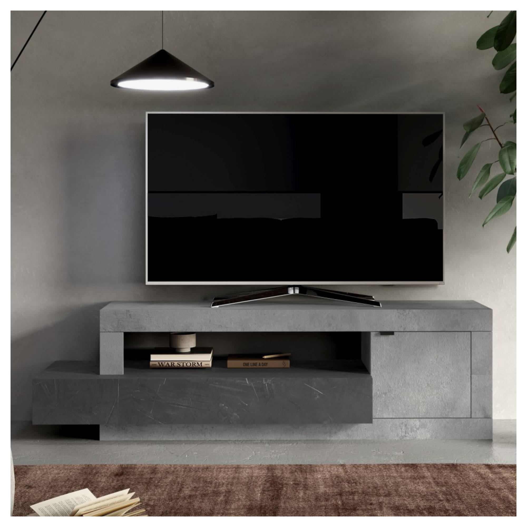 Kombinovaný úložný priestor je členený na širokú zásuvku, uzatvárateľný priestor za otočnými dverami a otvorený priestor na uloženie TV príslušenstva či vystavenie dekorácií. Jednoduchú každodennú manipuláciu umožňuje bezrúčkové otváranie zásuvky a minimalistická rúčka dverí. TV komoda je vyrobená z laminovanej drevotriesky nenáročnej na údržbu.