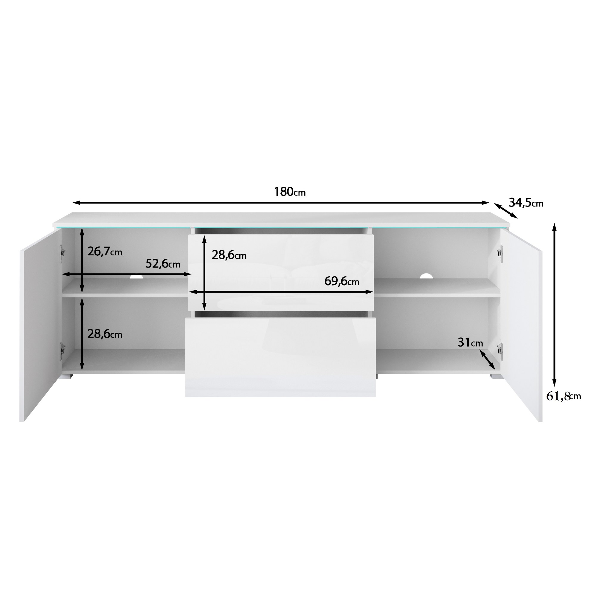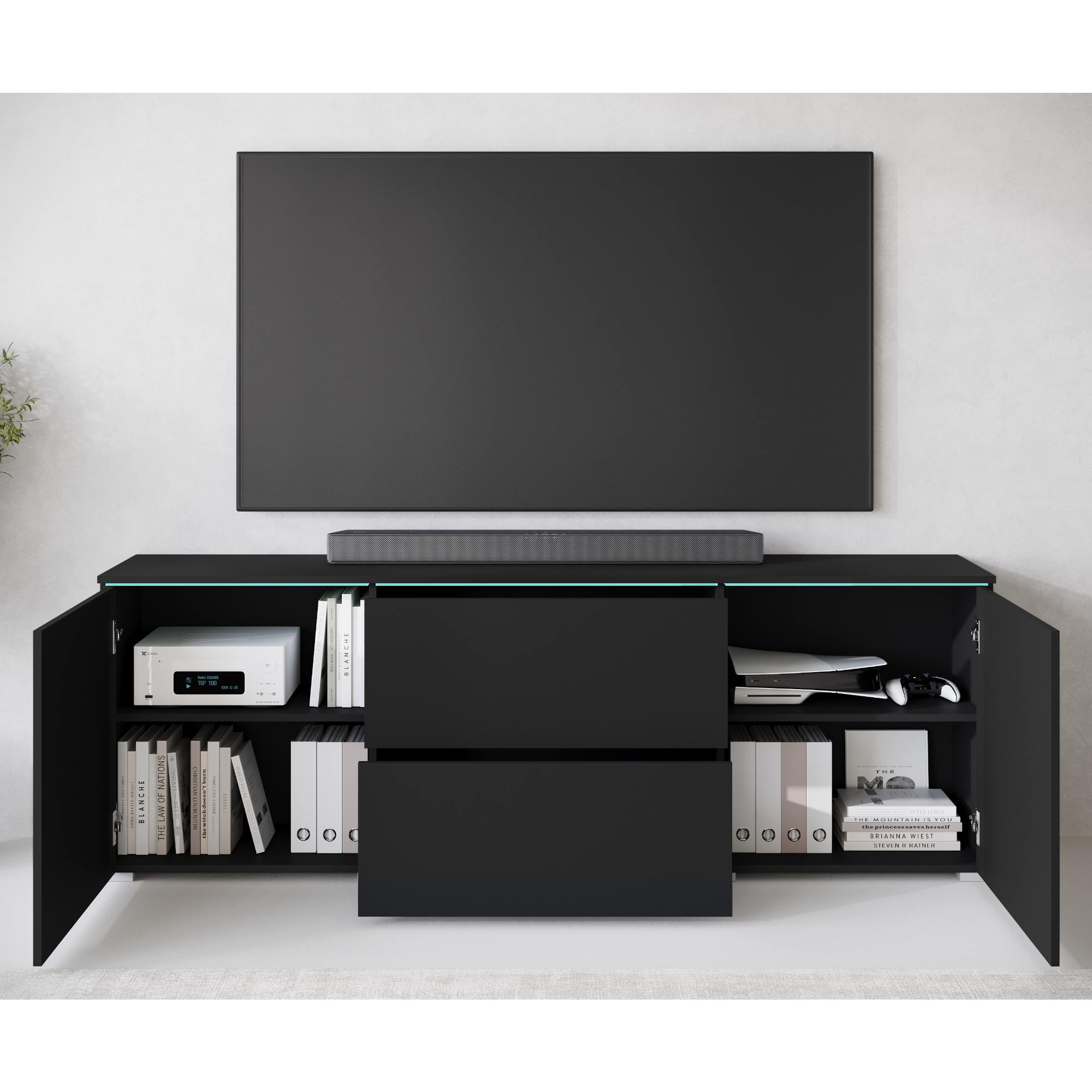 Táto TV komoda ponúka dostatok úložného priestoru. Jej súčasťou sú nielen 2 vložené police, ale aj 2 zásuvky. Nechýbajú ani 2 otvory na kabeláž a štýlové LED osvetlenie.