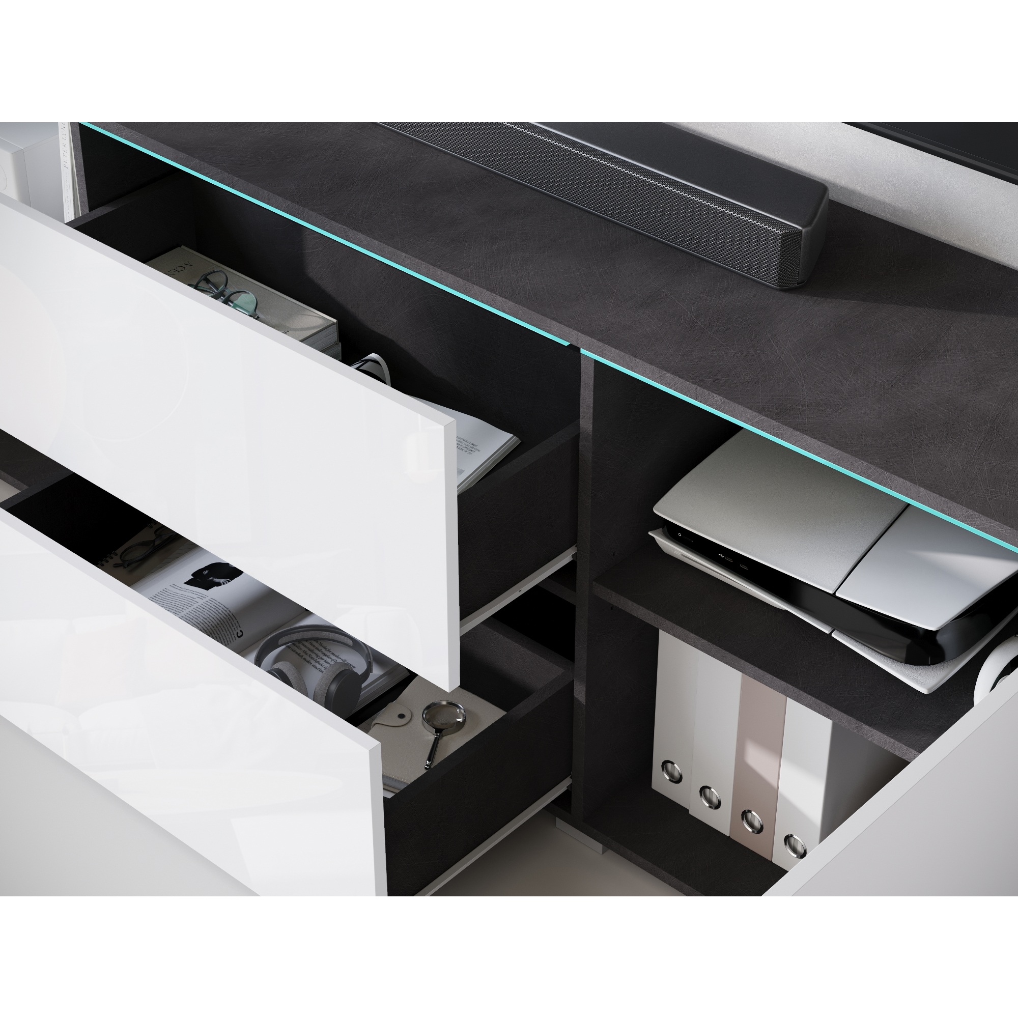 Táto TV komoda ponúka dostatok úložného priestoru. Jej súčasťou sú nielen 2 vložené police, ale aj 2 zásuvky. Nechýbajú ani 2 otvory na kabeláž a štýlové LED osvetlenie.