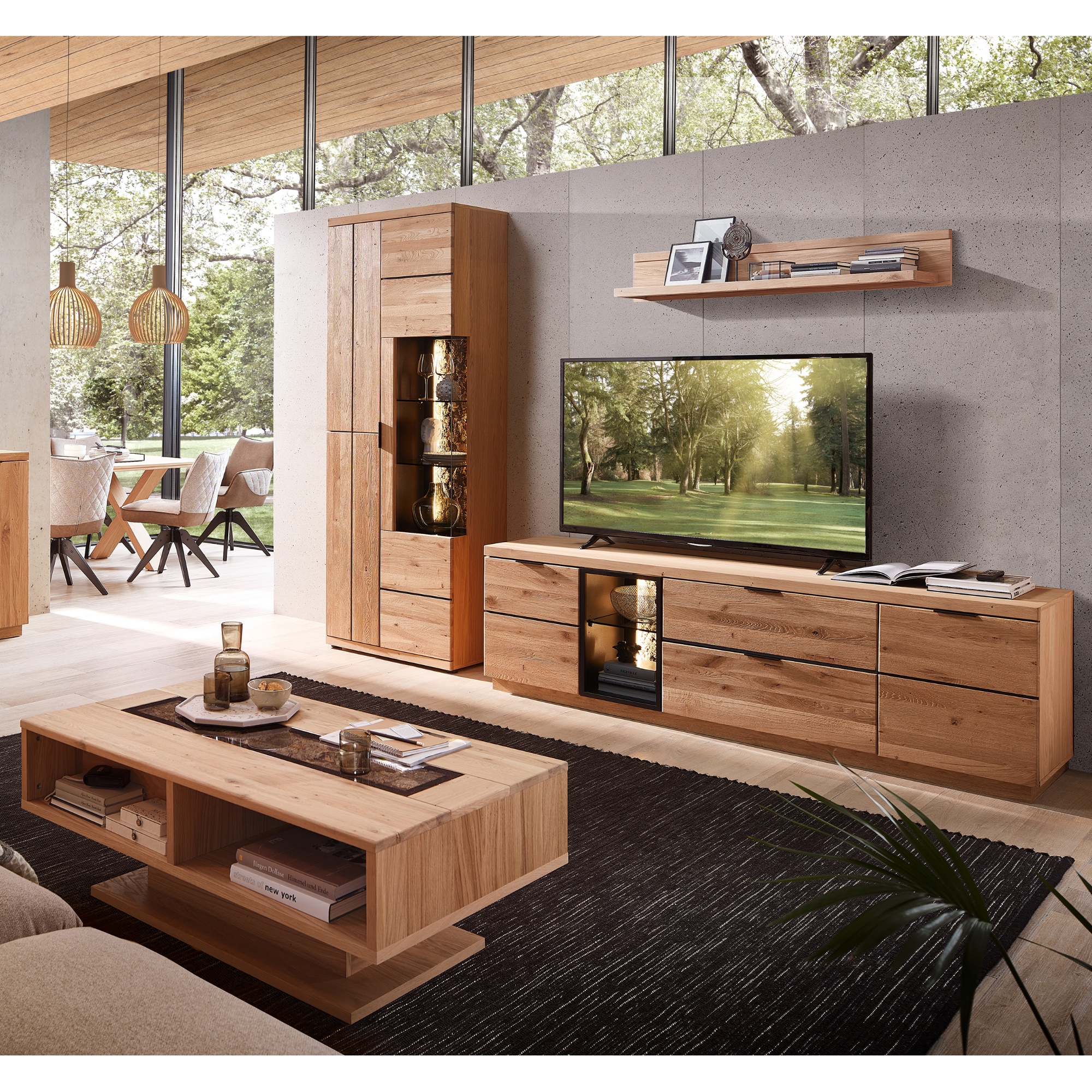 TV komoda je vybavená 3 vloženými policami, z ktorých 1 je zo skla. Nechýba ani 1 zásuvka, do ktorej si môžete uložiť rôzne maličkosti. K TV komode je možné dokúpiť i LED osvetlenie, ktoré umožní vystaveným predmetom vyniknúť.