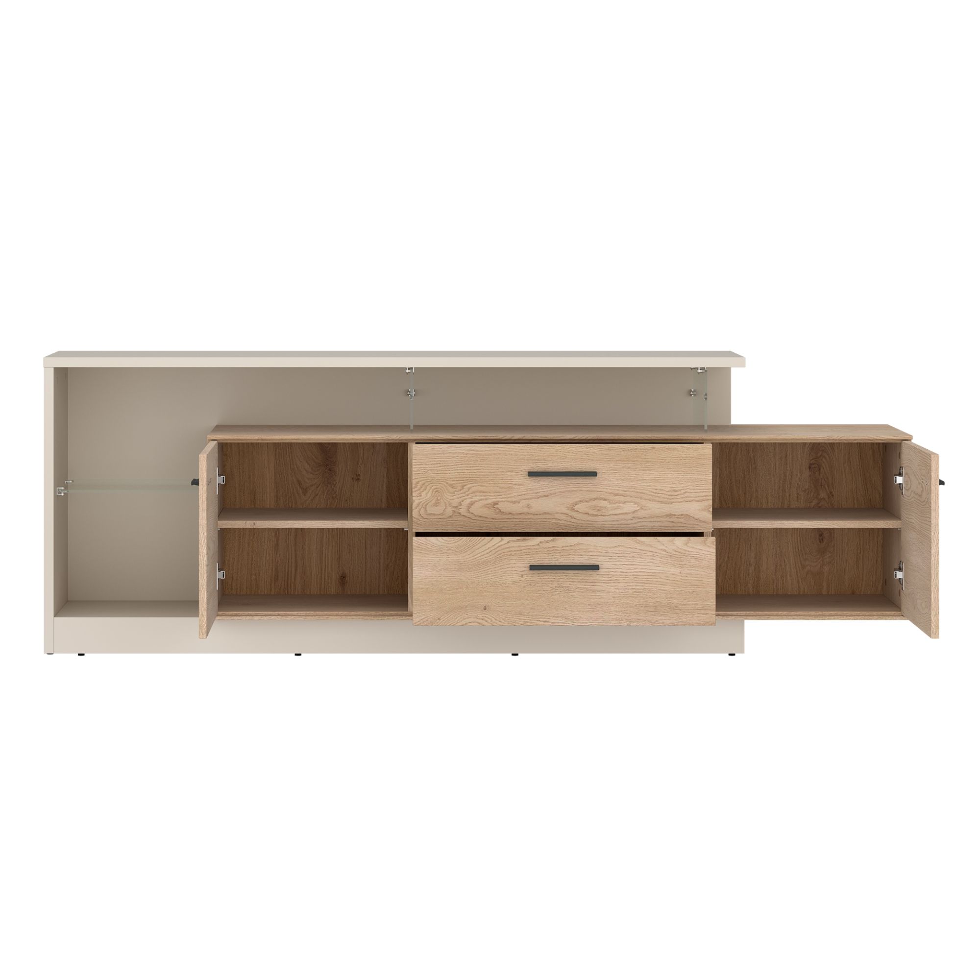 Komoda ponúka dostatok otvoreného aj uzatvárateľného odkladacieho priestoru, a tak v nej nájde miesto nielen vybavenie k TV. Okrem 2 zásuviek disponuje aj 2 vloženými policami, ktoré sa nachádzajú za dvierkami.