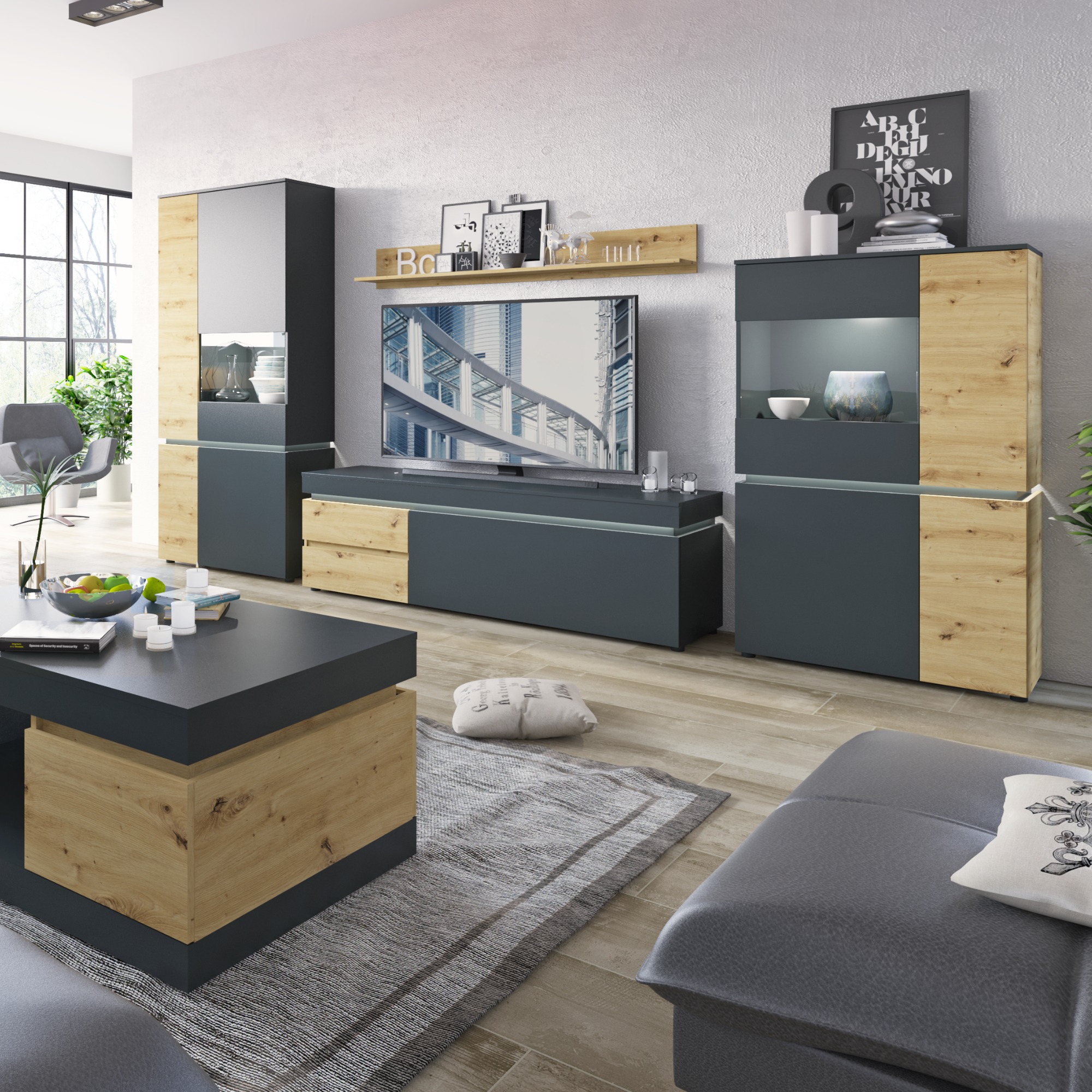 TV komoda LUCI - dub artisan/sivá, šírka 181 cm