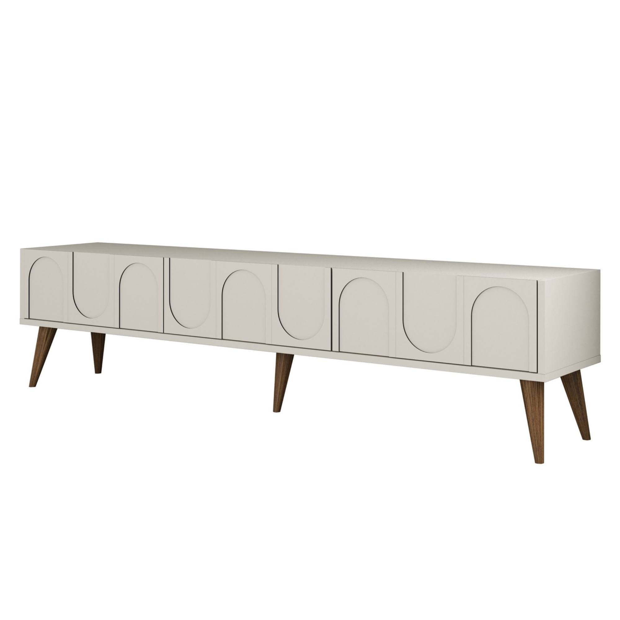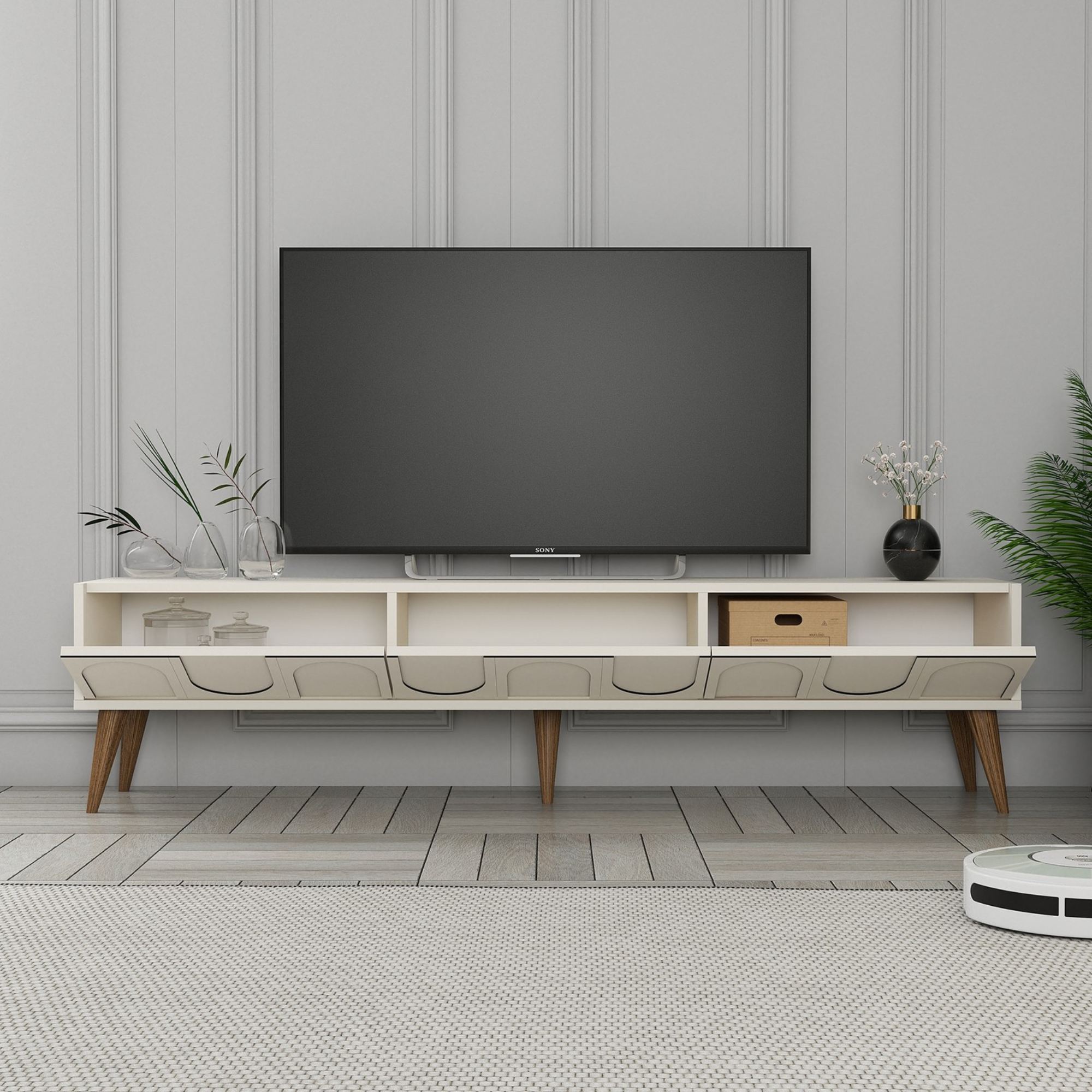 Disponuje 3 výklopnými dvierkami, ktoré odkrývajú 3 oddelené úložné priestory. Tie vytvárajú dostatok miesta na odloženie všetkého, čo potrebujete mať po ruke. Vrchná doska so šírkou 180 cm ponúka priestor na televíziu, ovládače aj dekorácie. Dvierka sú doplnené geometrickým vzorom, ktorý oživuje inak jednoduchý vzhľad. Vďaka vyhotoveniu bez úchytiek dizajn pekne vyniká. Kónické nožičky v dekore orecha dodávajú prírodný nádych.