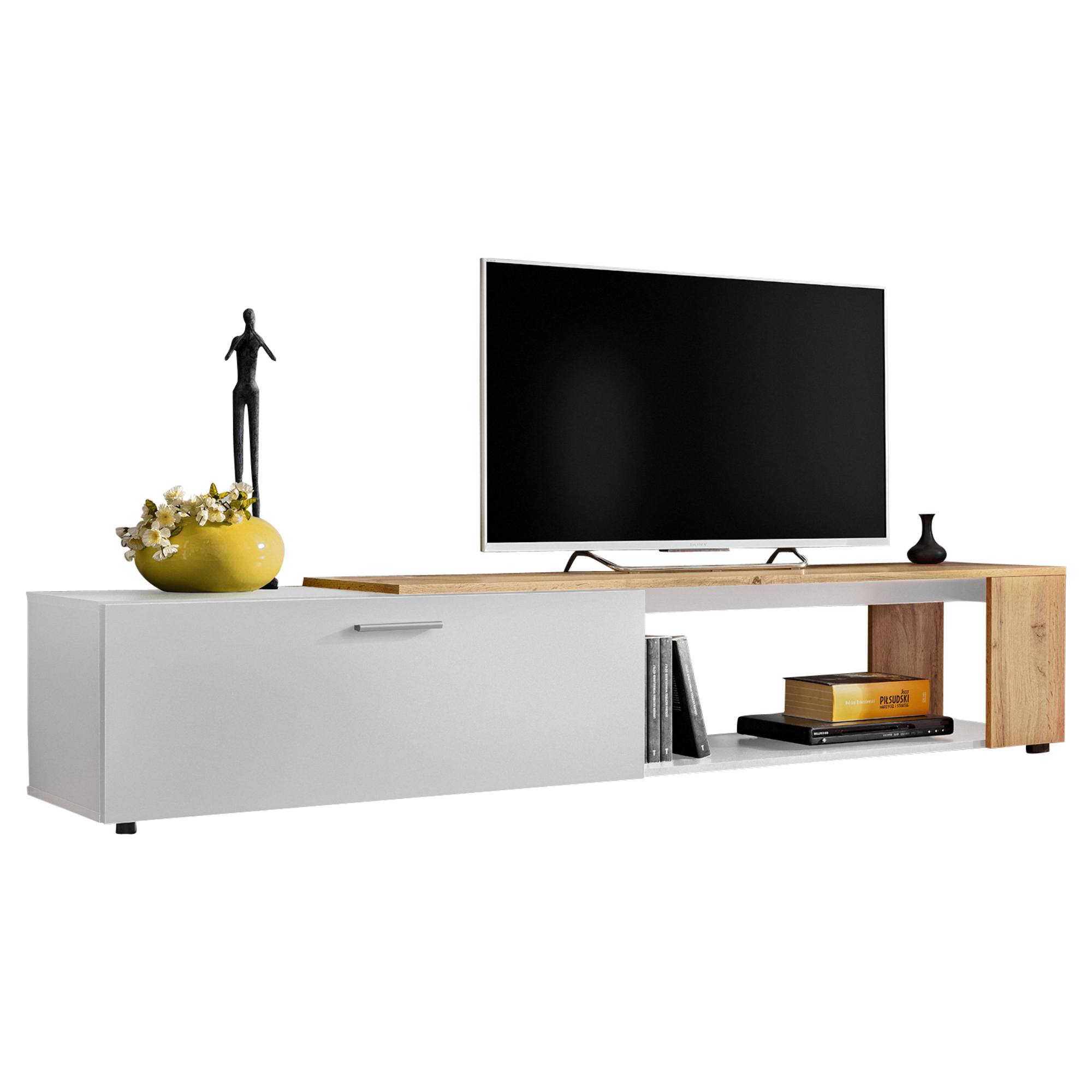 Obsahuje dostatočne veľký úložný priestor za výklopnými dvierkami, ktorý je rozdelený policou a priestor na multimediálne zariadenia v pravej časti komody. Na hornej doske sa okrem samotnej televízie budú vynímať aj rôzne dekorácie. Komoda je vyrobená z laminovaného dreveného materiálu, ktorý je nenáročný na údržbu.