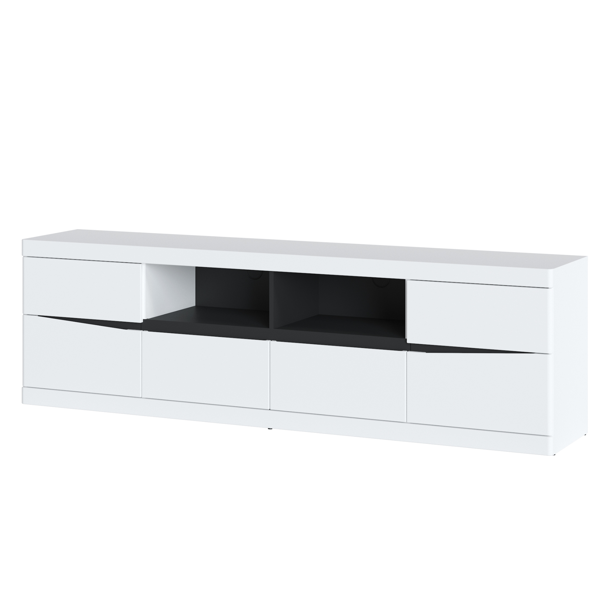 Táto komoda disponuje dvoma otočnými dvierkami, kedy za každými z nich sa nachádza priestor s jednou vloženou policou. Ďalší úložný priestor poskytnú dve priestranné zásuvky a dve otvorené police. Jednoduchú manipuláciu umožňuje bezrúčkové vyhotovenie.