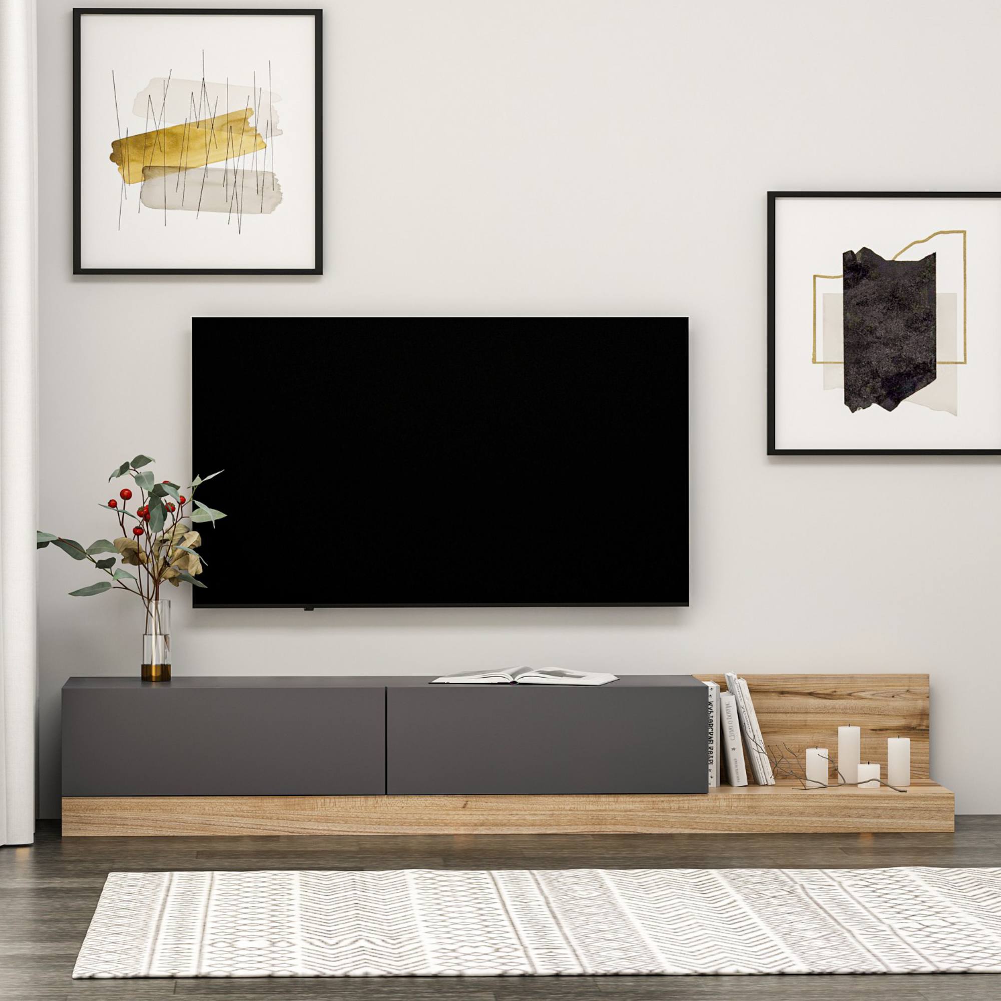 Disponuje 2 výklopnými dvierkami, ktoré odkrývajú 2 oddelené úložné priestory. Tie vytvárajú dostatok miesta na odloženie všetkého, čo potrebujete mať po ruke. Pravá strana ponúka priestor na umiestnenie ovládačov, kníh či dekorácií. Vyhotovenie bez úchytiek a nožičiek podčiarkuje jej jednoduchý vzhľad.