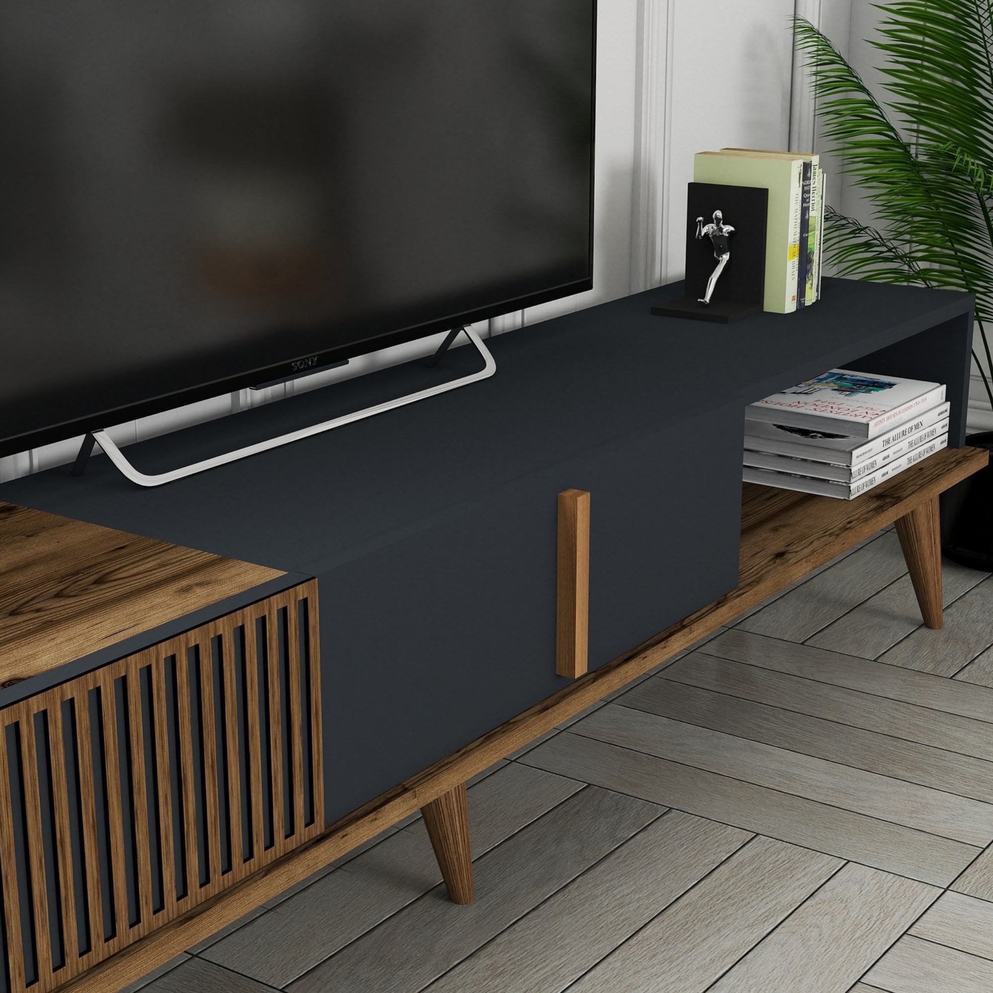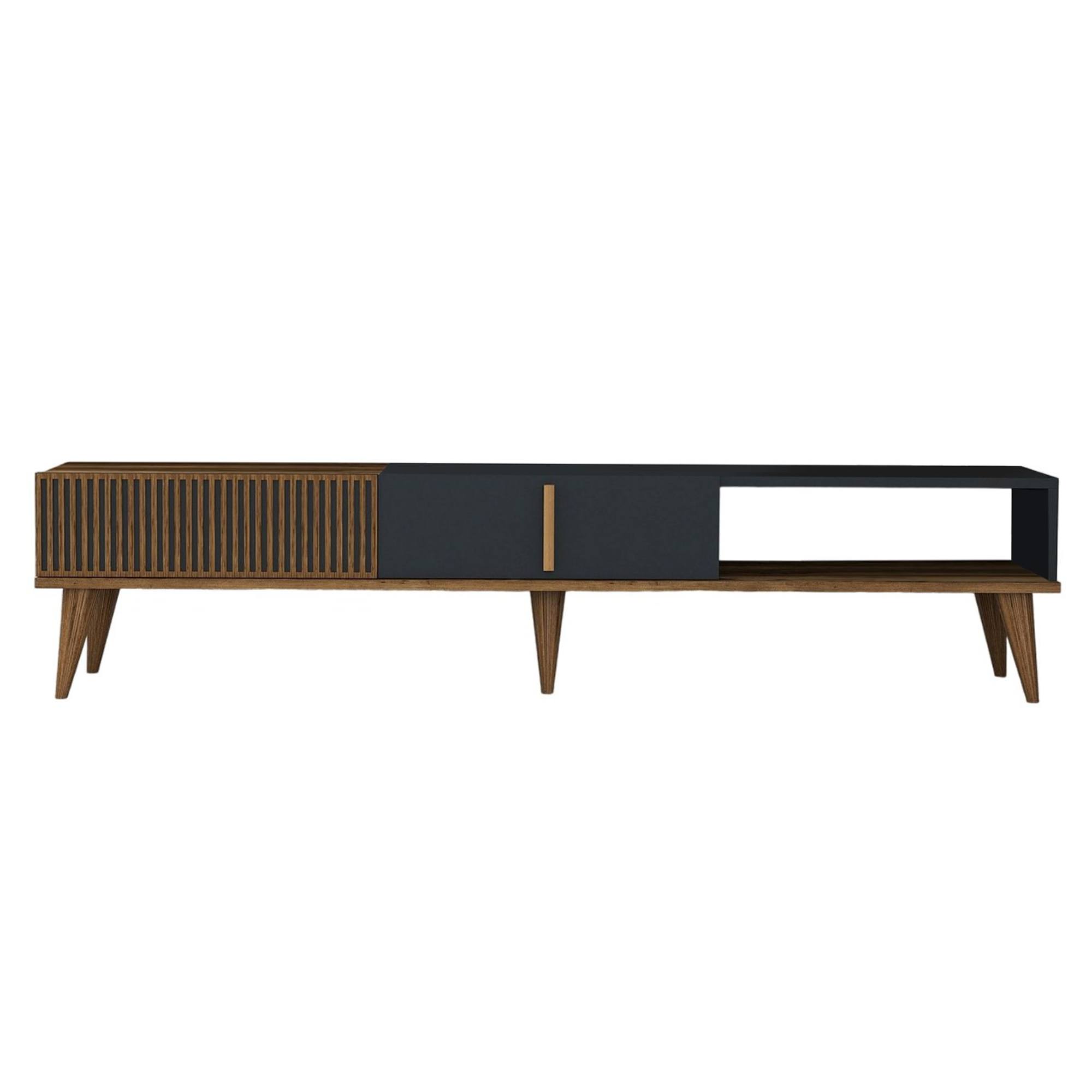 Vnútorný úložný priestor štýlovej komody uzatvárajú 2 výklopné dvere, ktoré umožňujú využiť vnútornú plochu na maximum. Posledná časť komody ponúka otvorený odkladací priestor. Vrchná doska je okrem iného ideálna na vystavenie rastlín, fotografií a ďalších dekorácií. TV komoda sa ako celok bez problémov postará o všetko TV príslušenstvo. 5 výrazných, kónických nôh zvýrazňuje jej celkový vzhľad a zároveň umožňuje ľahké upratovanie pod komodou.