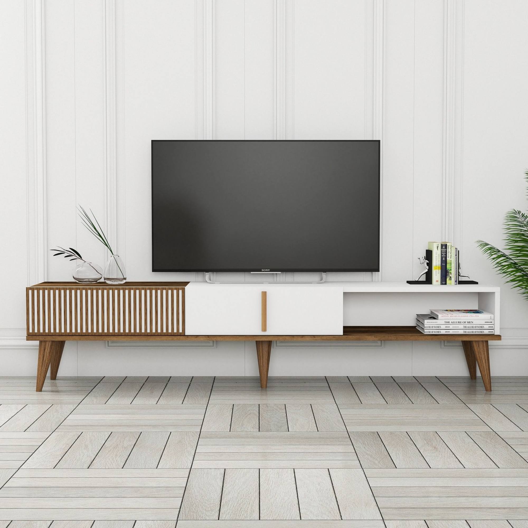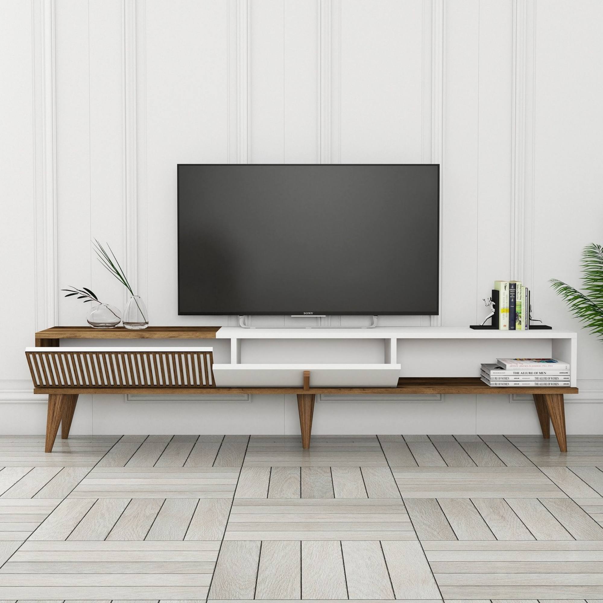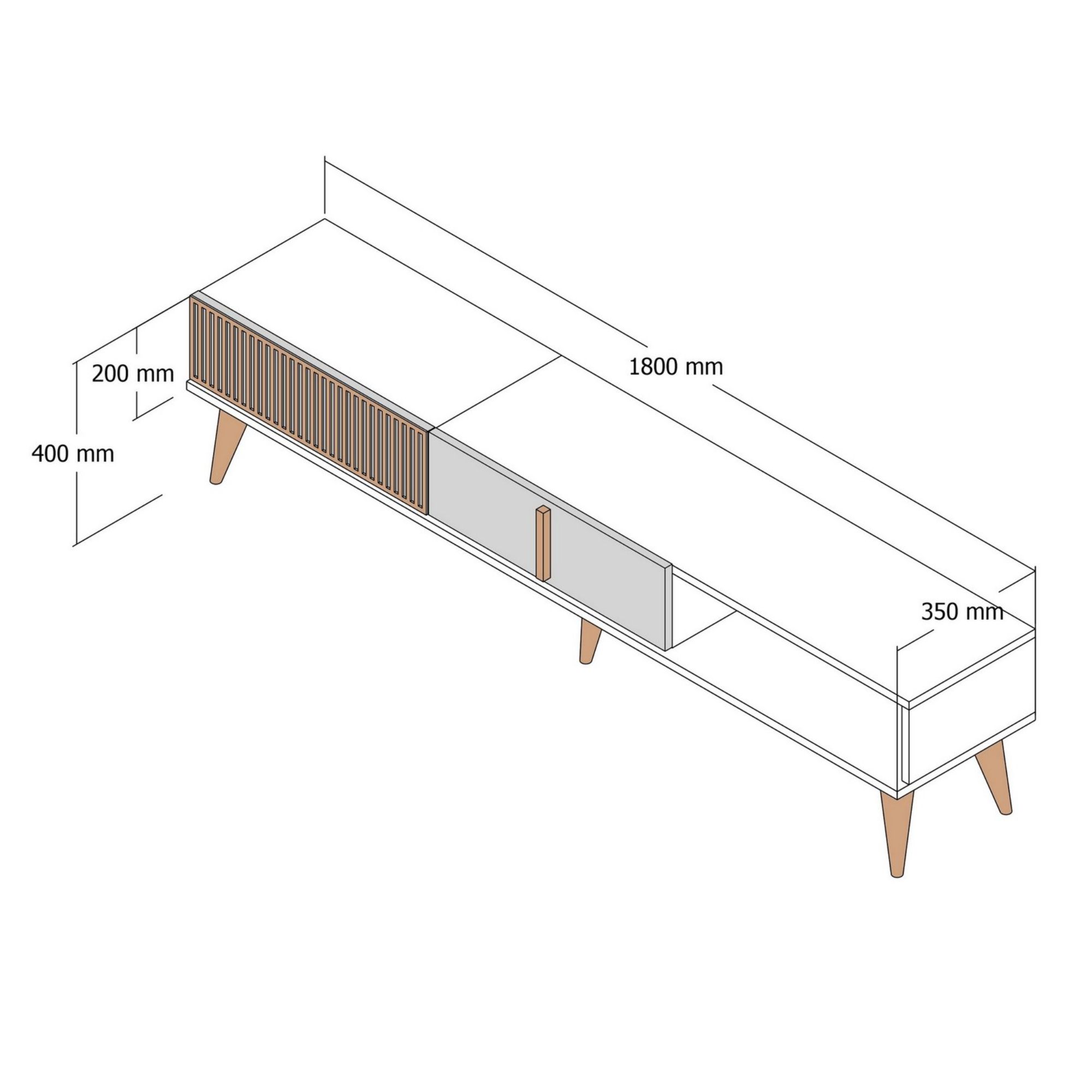 Vnútorný úložný priestor štýlovej komody uzatvárajú 2 výklopné dvere, ktoré umožňujú využiť vnútornú plochu na maximum. Posledná časť komody ponúka otvorený odkladací priestor. Vrchná doska je okrem iného ideálna na vystavenie rastlín, fotografií a ďalších dekorácií. TV komoda sa ako celok bez problémov postará o všetko TV príslušenstvo. 5 výrazných, kónických nôh zvýrazňuje jej celkový vzhľad a zároveň umožňuje ľahké upratovanie pod komodou.
