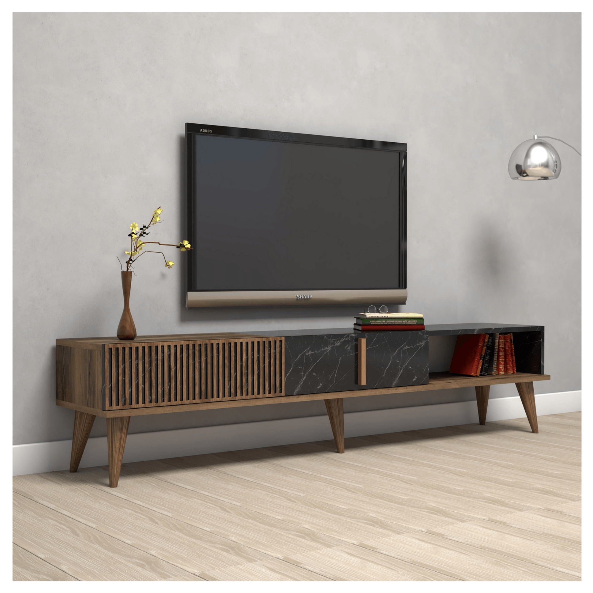 Vnútorný úložný priestor štýlovej komody uzatvárajú 2 výklopné dvere, ktoré umožňujú využiť vnútornú plochu na maximum. Posledná časť komody ponúka otvorený odkladací priestor. Vrchná doska je okrem iného ideálna na vystavenie rastlín, fotografií a ďalších dekorácií. TV komoda sa ako celok bez problémov postará o všetko TV príslušenstvo. 5 výrazných, kónických nôh zvýrazňuje jej celkový vzhľad a zároveň umožňuje ľahké upratovanie pod komodou.