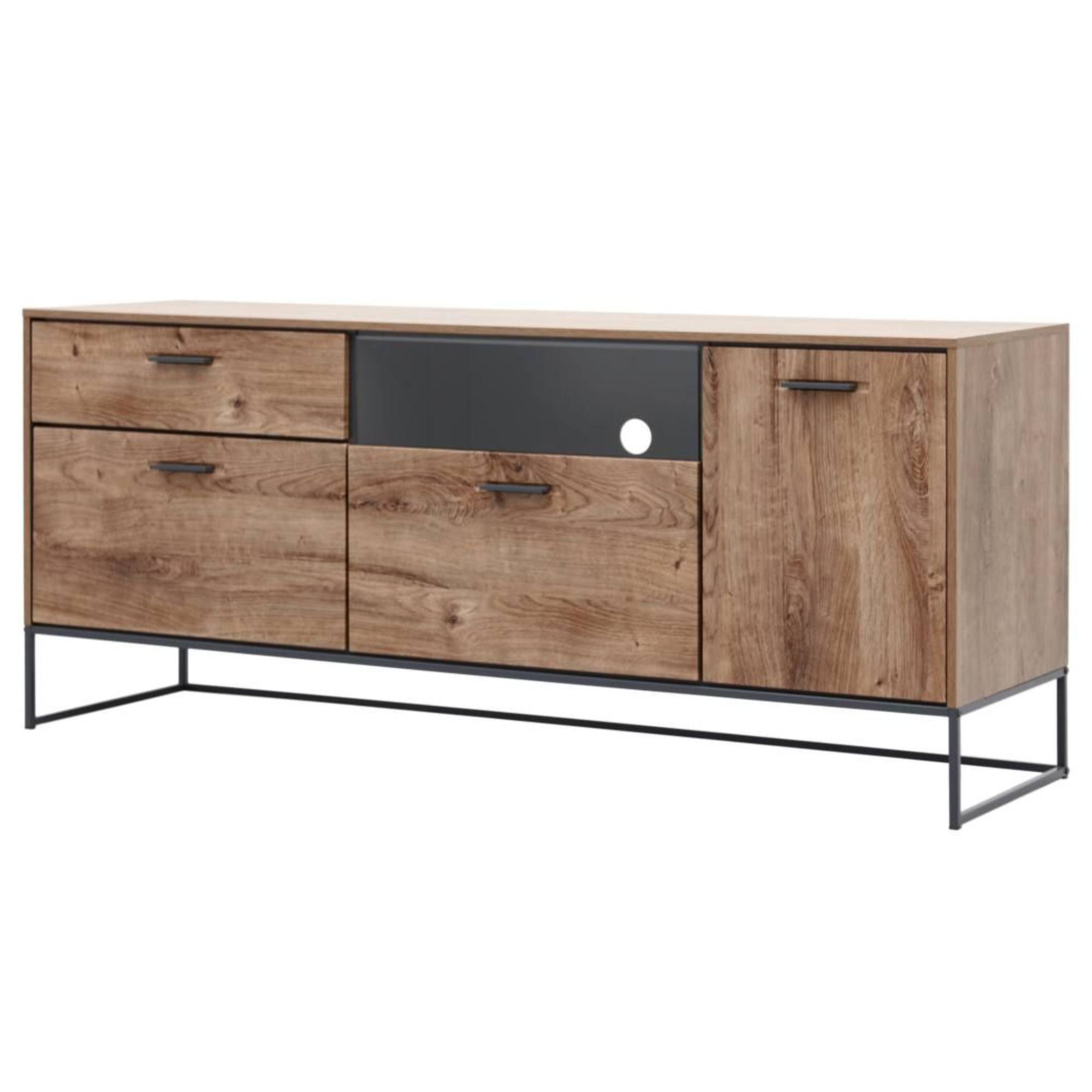 Moderná a praktická TV komoda, ktorá poskytuje dostatok úložného priestoru za kombináciou dvierok a zásuviek. Vyrobená je z odolného a ľahko udržiavateľného materiálu. Dodávané v zmontovanom stave, okrem úchytov a nožičiek, ktoré sú z prepravných dôvodov demontované.