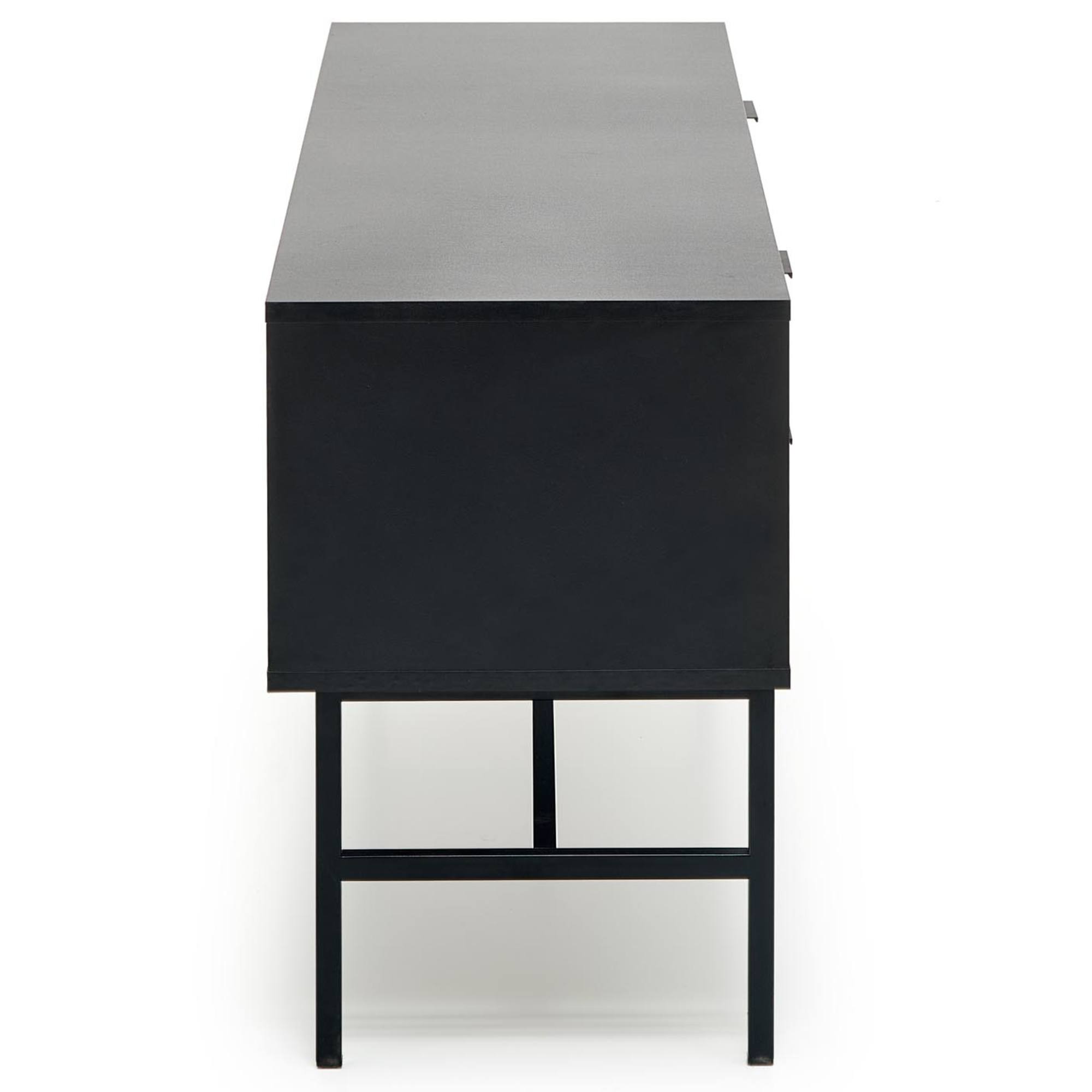 Obsahuje otvorenú priehradku, kam umiestnite všetko vaše TV príslušenstvo. Komoda ďalej obsahuje dve zásuvky a vnútorný priestor za dvierkami, kde budete mať všetky uložené predmety pohromade. Predná plocha komody je vyrobená z dyhovaného MDF materiálu. Stabilitu dodáva kovová konštrukcia.