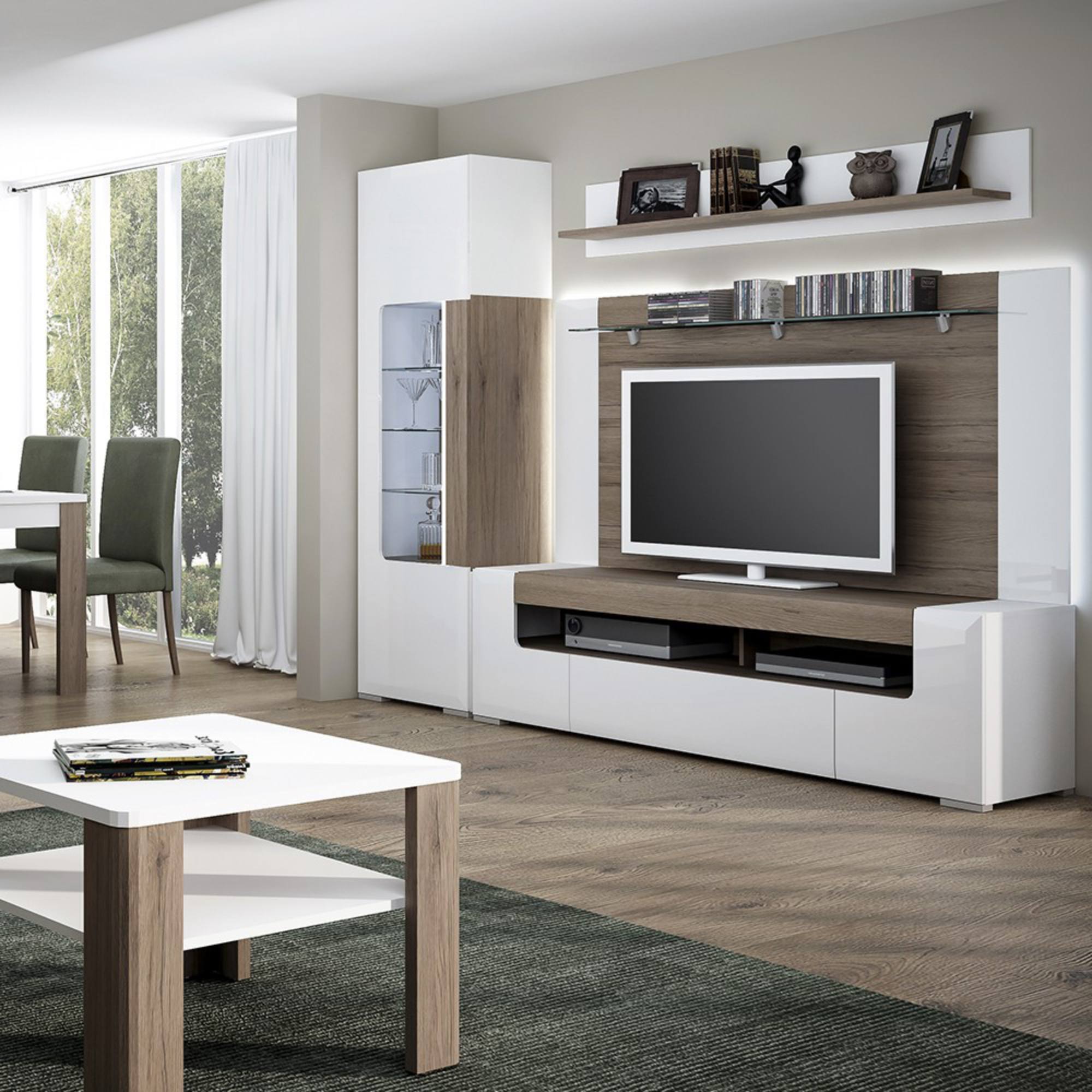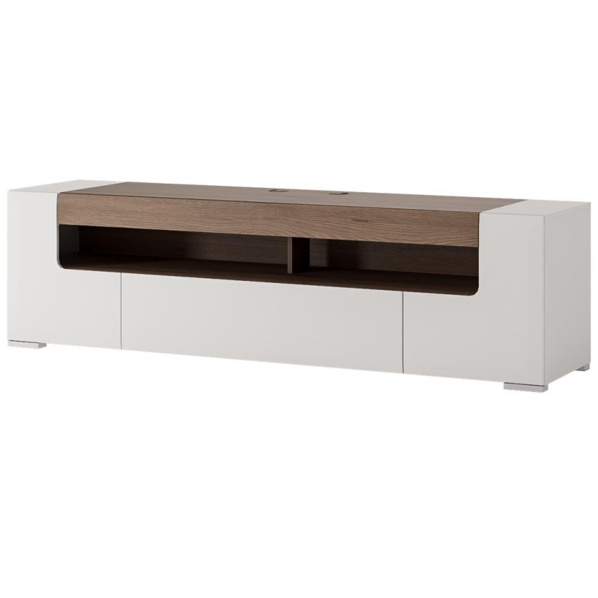 Dizajnová TV komoda MILANO dokáže zmeniť váš televízny kútik na reprezentatívnu časť domu. Je krásnou kombináciou bielej farby a dekora duba sanremo. Ponúka dostatok úložného priestoru v podobe zásuvky a dvoch otočných dvierok. Otvorená polica je vybavená ventilačnými otvormi, ktoré zaistia konštantnú cirkuláciu vzduchu okolo elektroniky a zároveň uľahčia nastavenie televízneho vybavenia. Telo komody je vyrobené z lamina a čelo z MDF dosky potiahnutej vysoko kvalitným PVC v bielej farbe s jemným leskom. Dvierka aj zásuvka sú v bezrúčkovom vyhotovení s pozvoľným uzatváraním vďaka systému soft-close. Nôžky komody sú z kvalitného plastu. Zároveň vám chceme odporučiť možnosť kombinácie s ďalšími prvkami z rovnomenného programu.