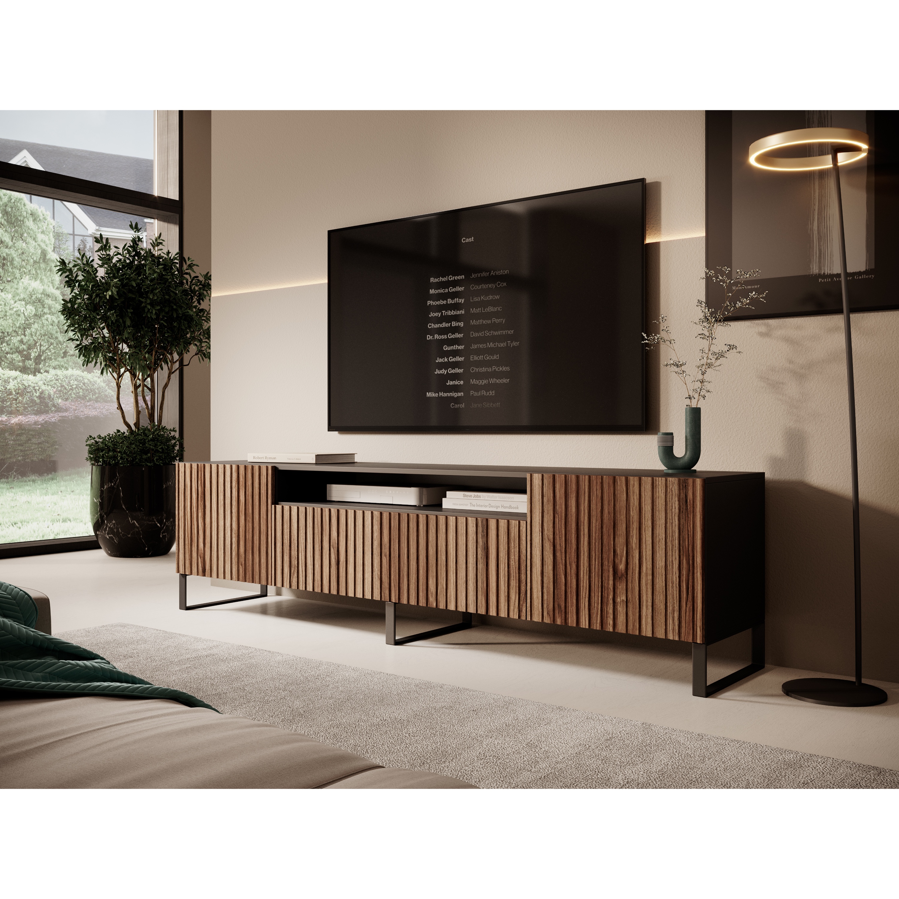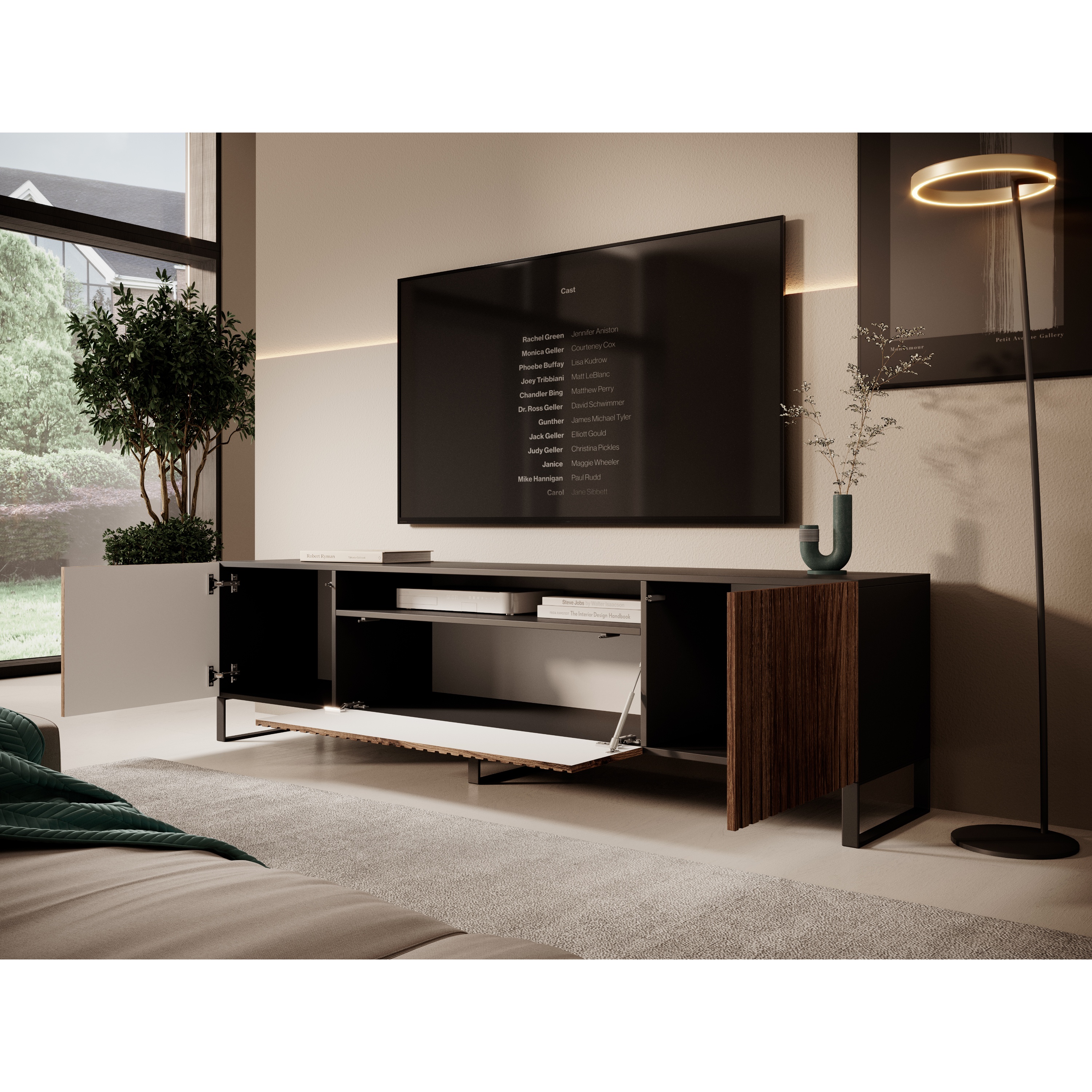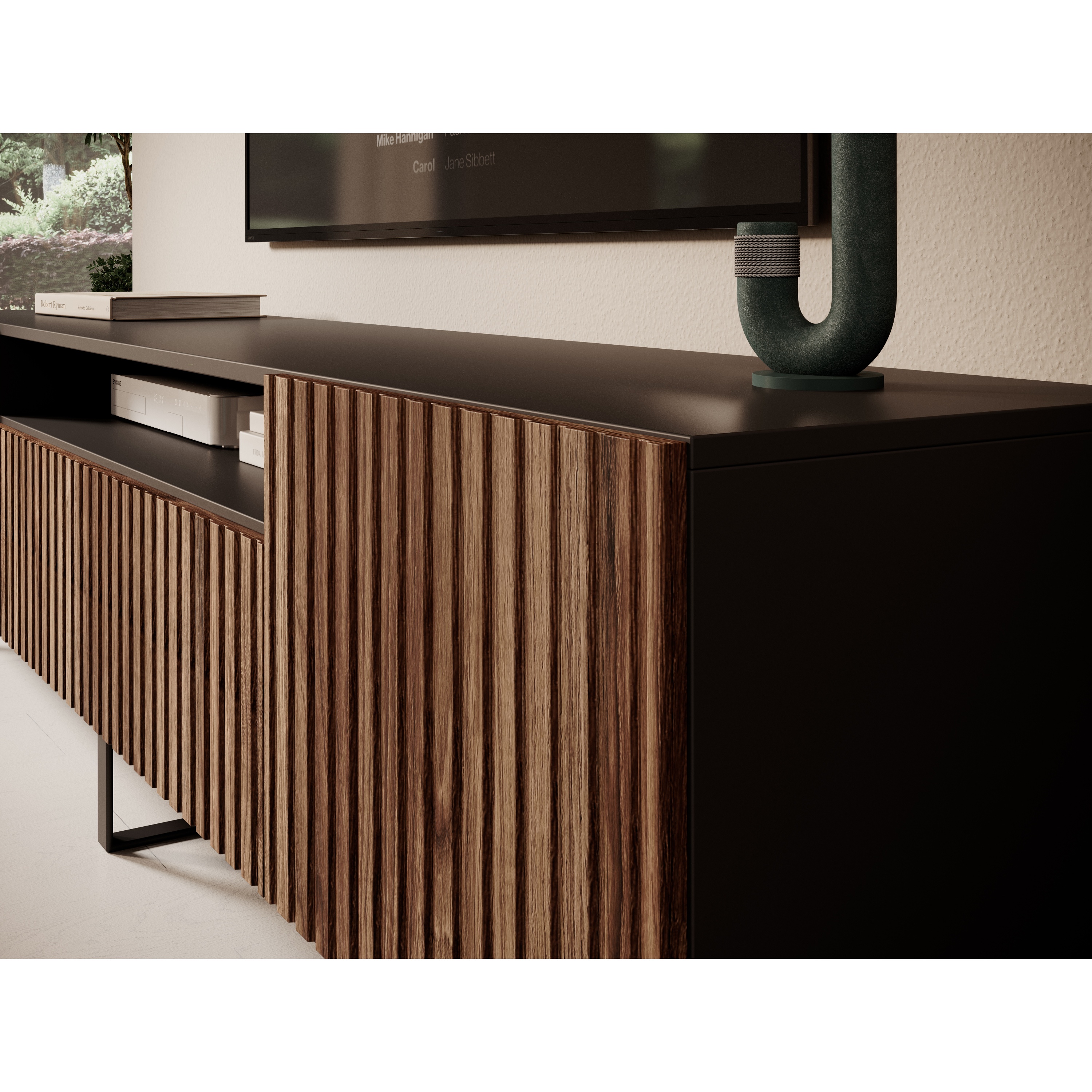 Komoda je vyrobená z laminovanej drevotrieskovej dosky v kombinácii s kvalitnou MDF a stojí na pevnej kovovej konštrukcii. Za dvierkami nájdete praktický úložný priestor, na ich otvorenie stačí na ne jemne zatlačiť. Prostredná časť obsahuje otvorený priestor, kam uložíte TV príslušenstvo.