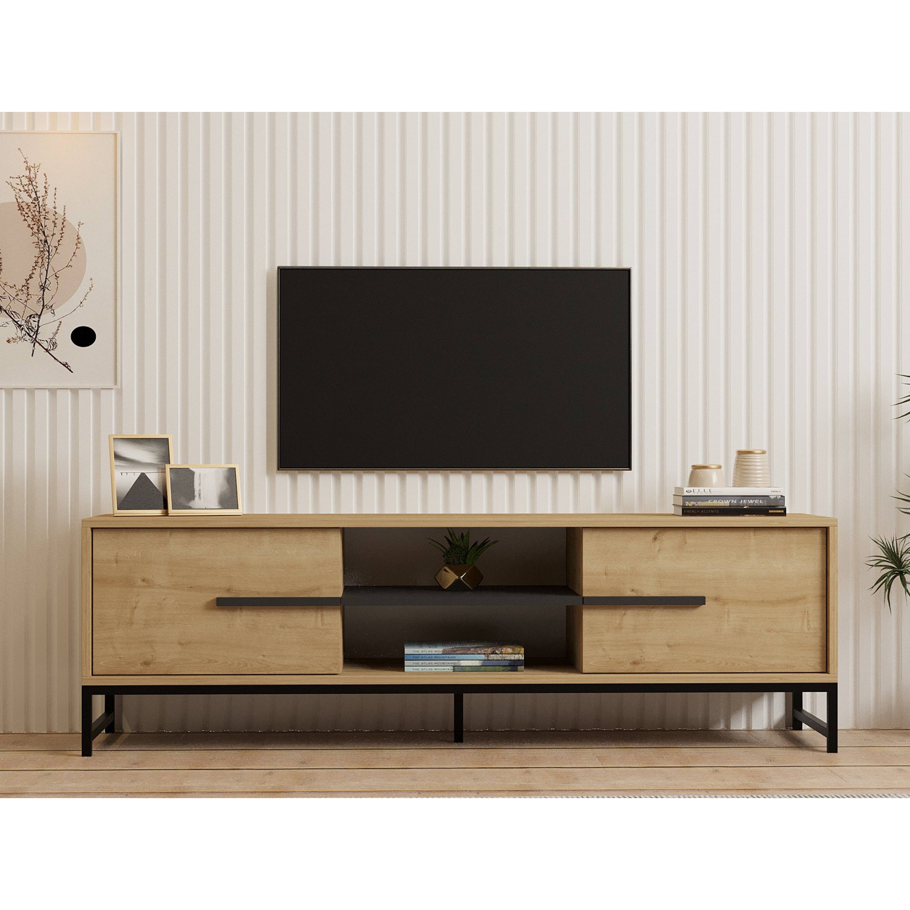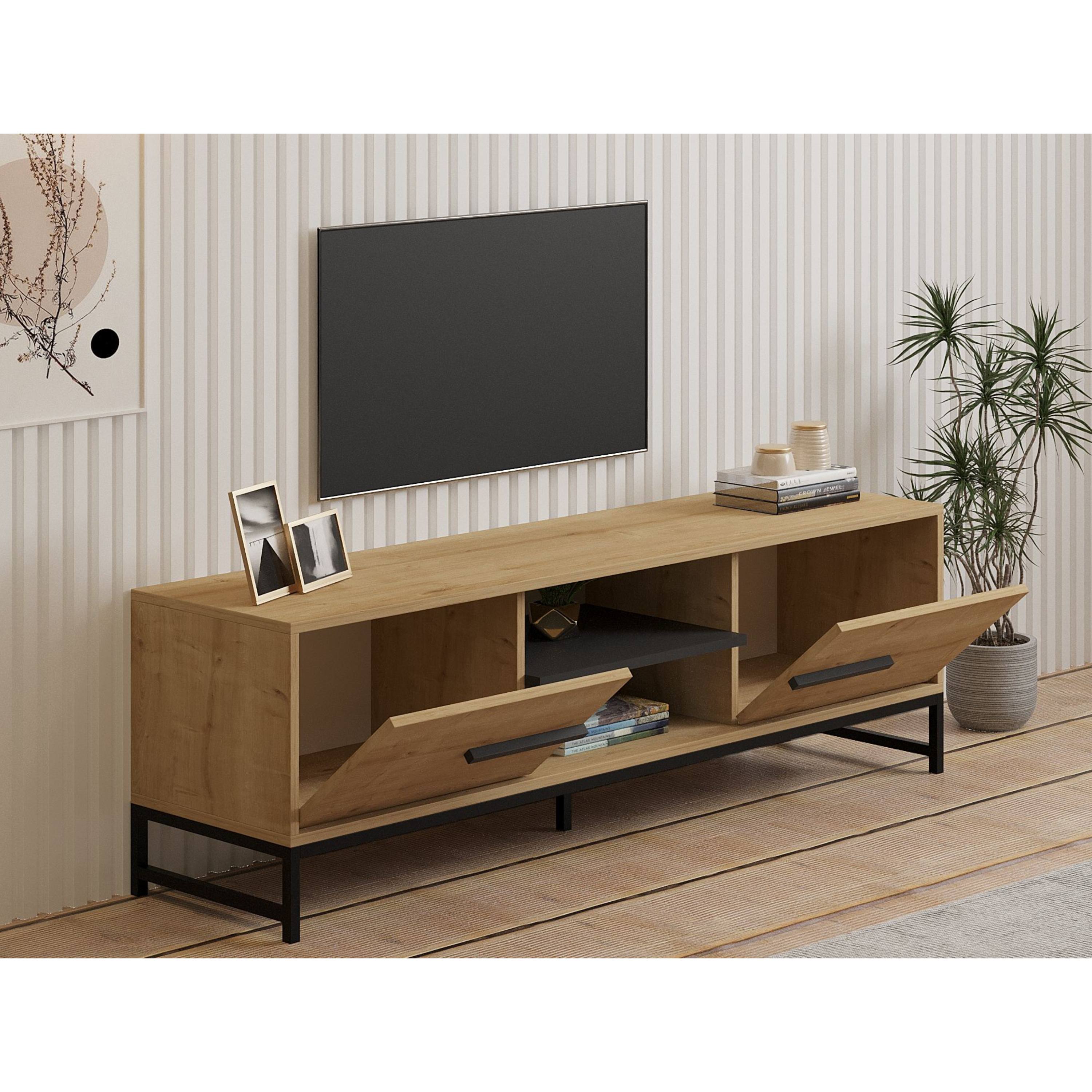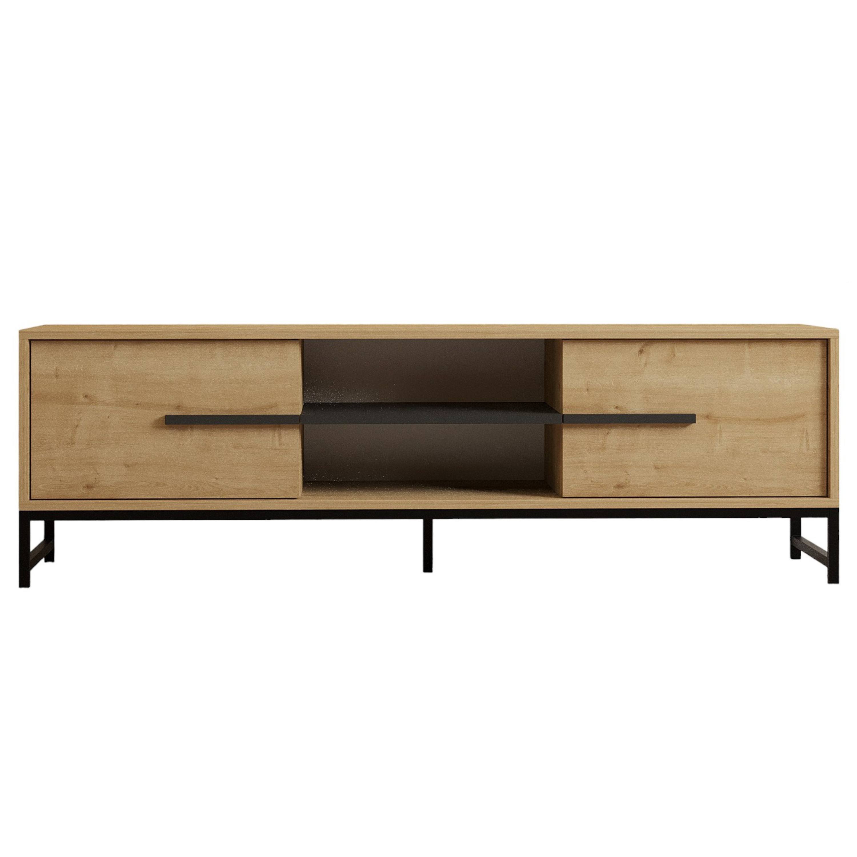Za výklopnými dvierkami komody sa nachádza dostatok úložného priestoru. Otvorená priehradka pojme nielen TV príslušenstvo, ale aj ďalšie drobnosti, ktoré budete chcieť mať neustále poruke. Stabilitu komody zabezpečujú pevné kovové nožičky.