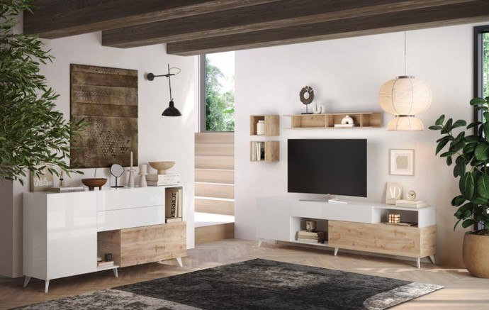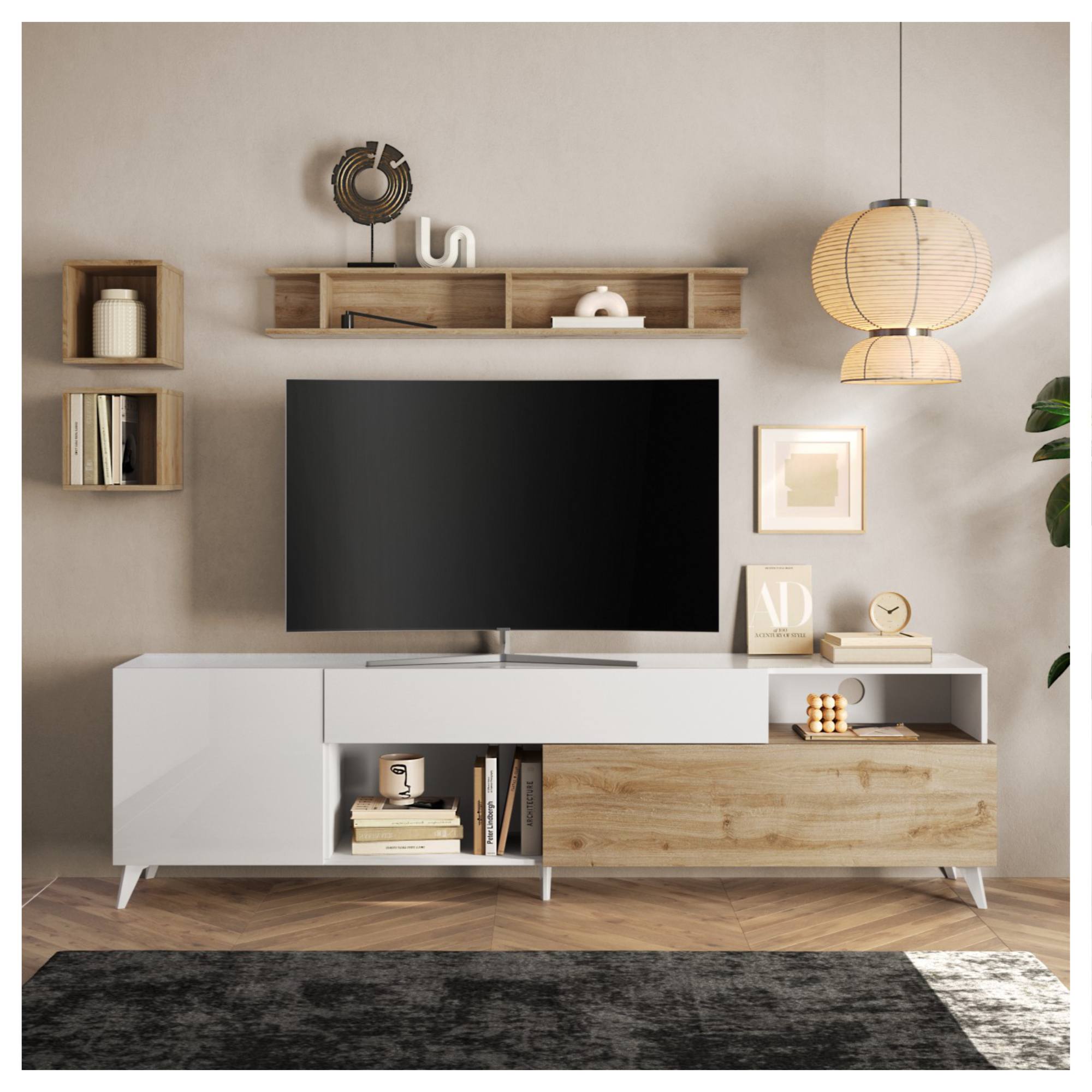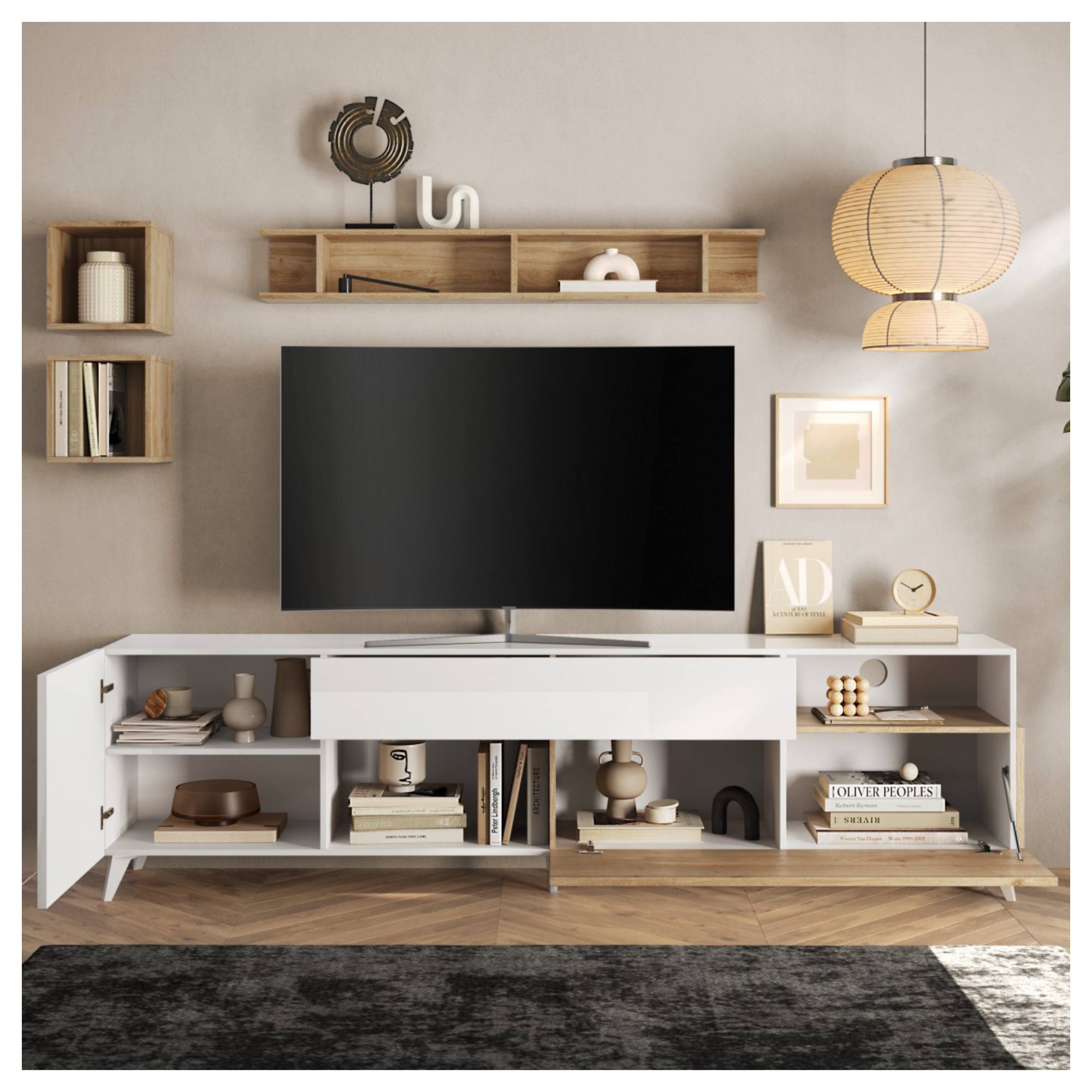 Ľavá strana je osadená otočnými dverami, za ktorými nájdete 1 vloženú policu. Komoda ponúka aj ďalšie uzatvárateľné úložné priestory v podobe extra širokej zásuvky a deleného priestoru za výklopnými dverami. Každodennú manipuláciu so všetkými uvedenými prvkami spríjemňuje systém tichého dovierania soft close. TV komoda ponúka tiež 2 otvorené odkladacie okná ideálne na vystavenie dekorácií. Celkový vzhľad zvýrazňujú kónické nohy. Konštrukcia je vyrobená z kvalitnej laminovanej drevotriesky nenáročnej na údržbu.