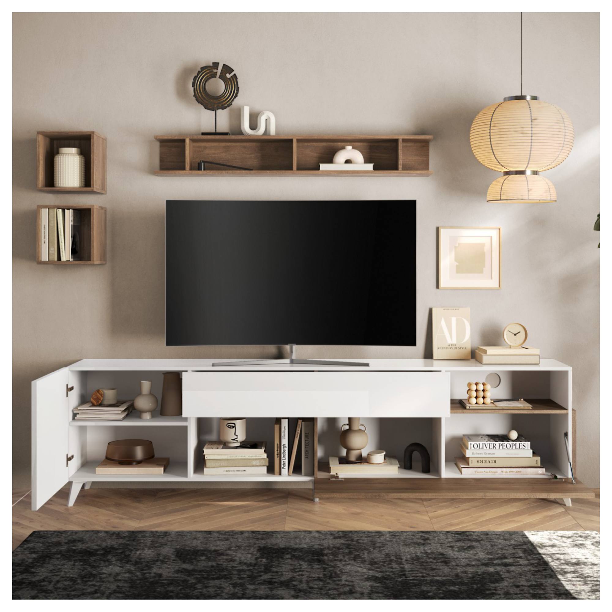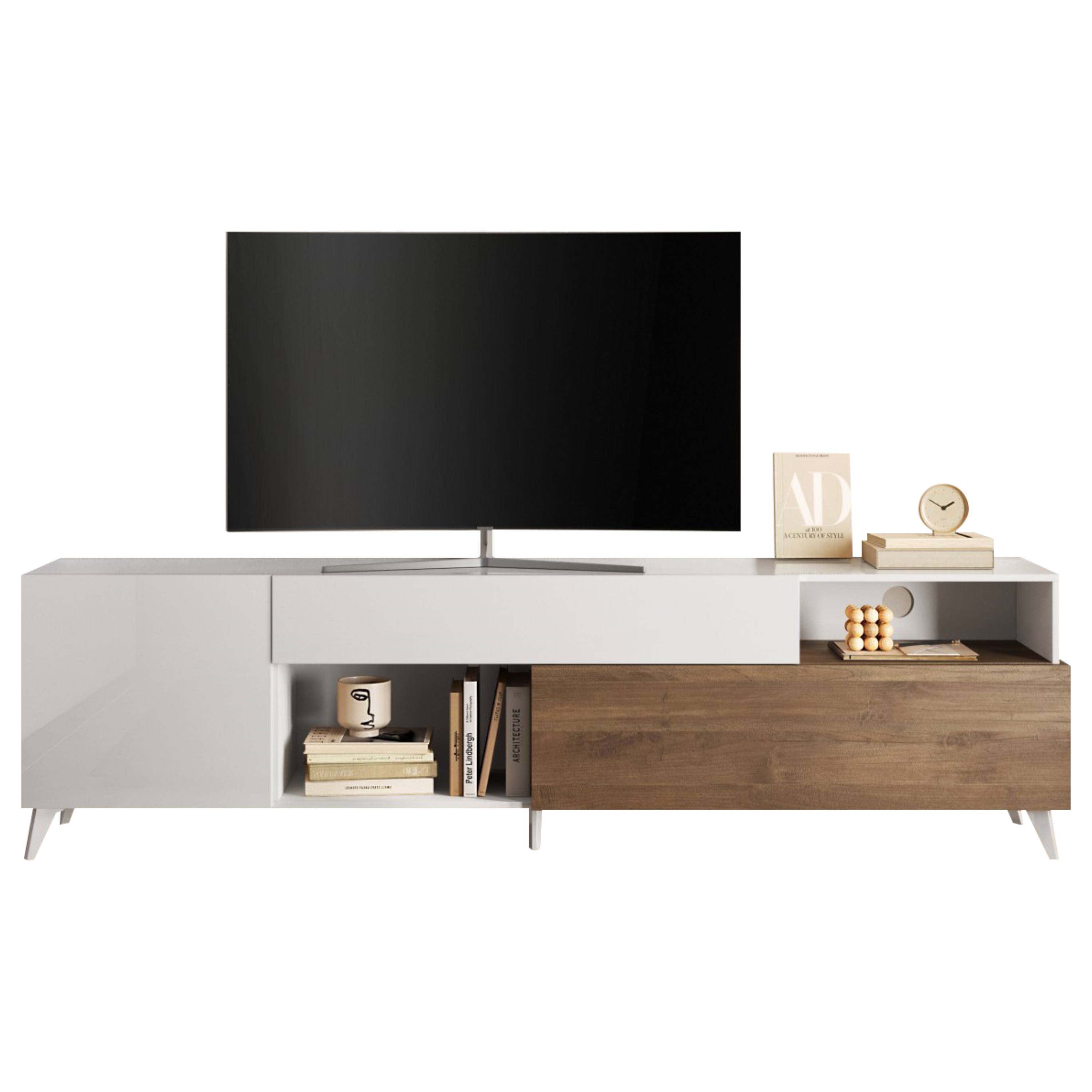Ľavá strana je osadená otočnými dverami, za ktorými nájdete 1 vloženú policu. Komoda ponúka aj ďalšie uzatvárateľné úložné priestory v podobe extra širokej zásuvky a deleného priestoru za výklopnými dverami. Každodennú manipuláciu so všetkými uvedenými prvkami spríjemňuje systém tichého dovierania soft close. TV komoda ponúka tiež 2 otvorené odkladacie okná ideálne na vystavenie dekorácií. Celkový vzhľad zvýrazňujú kónické nohy. Konštrukcia je vyrobená z kvalitnej laminovanej drevotriesky nenáročnej na údržbu.