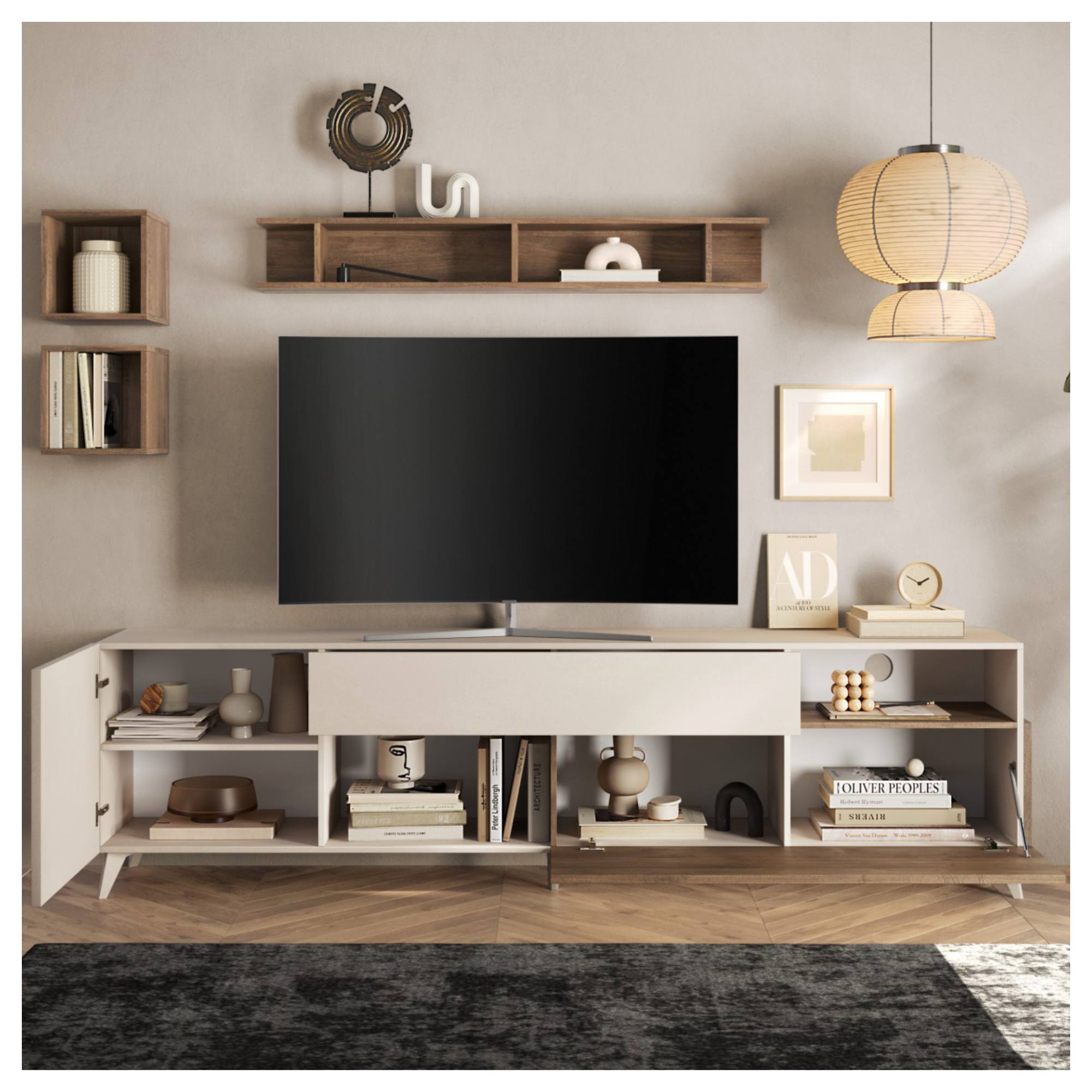 Ľavá strana je osadená otočnými dverami, za ktorými nájdete 1 vloženú policu. Komoda ponúka aj ďalšie uzatvárateľné úložné priestory v podobe extra širokej zásuvky a deleného priestoru za výklopnými dverami. Každodennú manipuláciu so všetkými uvedenými prvkami spríjemňuje systém tichého dovierania soft close. TV komoda ponúka tiež 2 otvorené odkladacie okná ideálne na vystavenie dekorácií. Celkový vzhľad zvýrazňujú kónické nohy. Konštrukcia je vyrobená z kvalitnej laminovanej drevotriesky nenáročnej na údržbu.