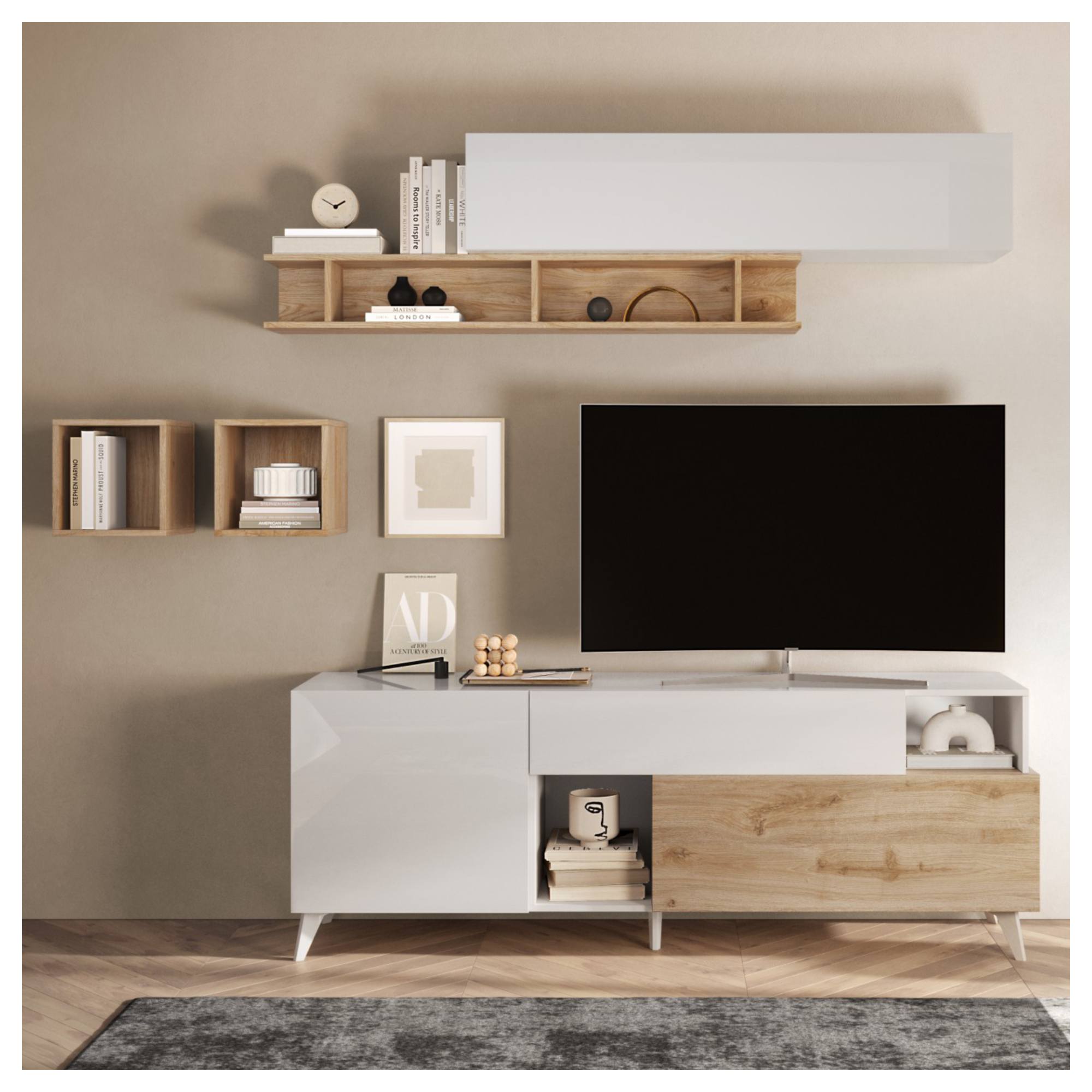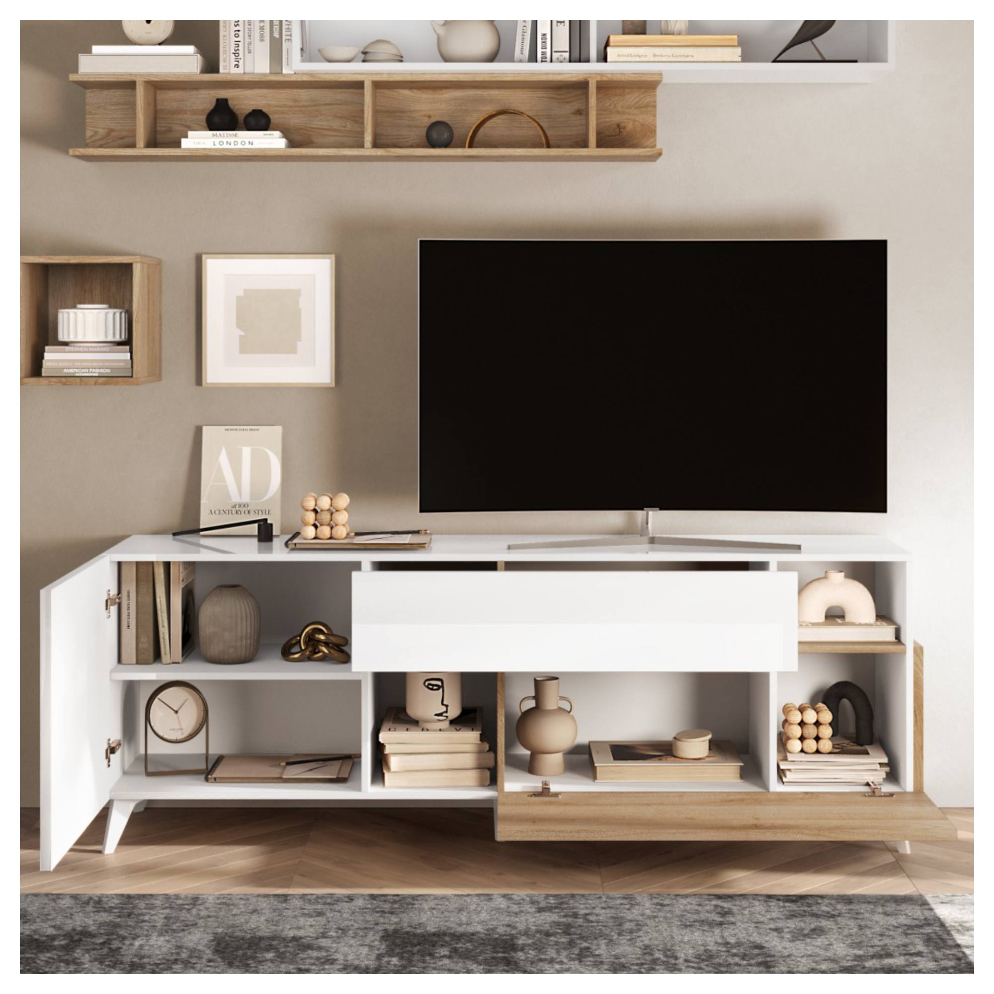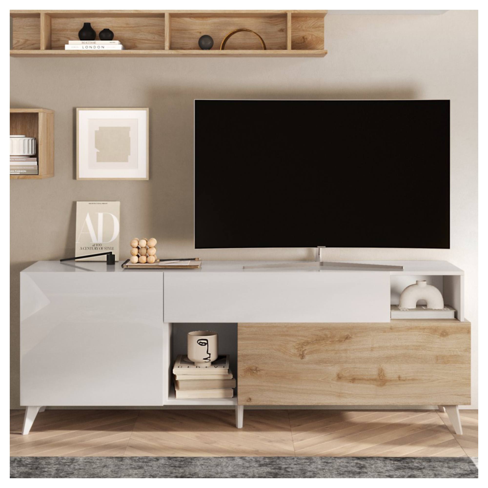 Ľavá strana je vybavená otočnými dverami, ktoré za sebou ukrývajú 1 vloženú policu. Komoda obsahuje aj ďalšie uzatvárateľné úložné priestory v podobe dostatočne hlbokej zásuvky a priestoru za výklopnými dverami. Každodennú manipuláciu so všetkými uvedenými prvkami spríjemňuje systém tichého dovierania soft close. TV komoda ponúka aj 2 otvorené odkladacie okná ideálne na vystavenie dekorácií. Celkový vzhľad zvýrazňujú kónické nohy. Konštrukcia je vyrobená z kvalitnej laminovanej drevotriesky nenáročnej na údržbu.