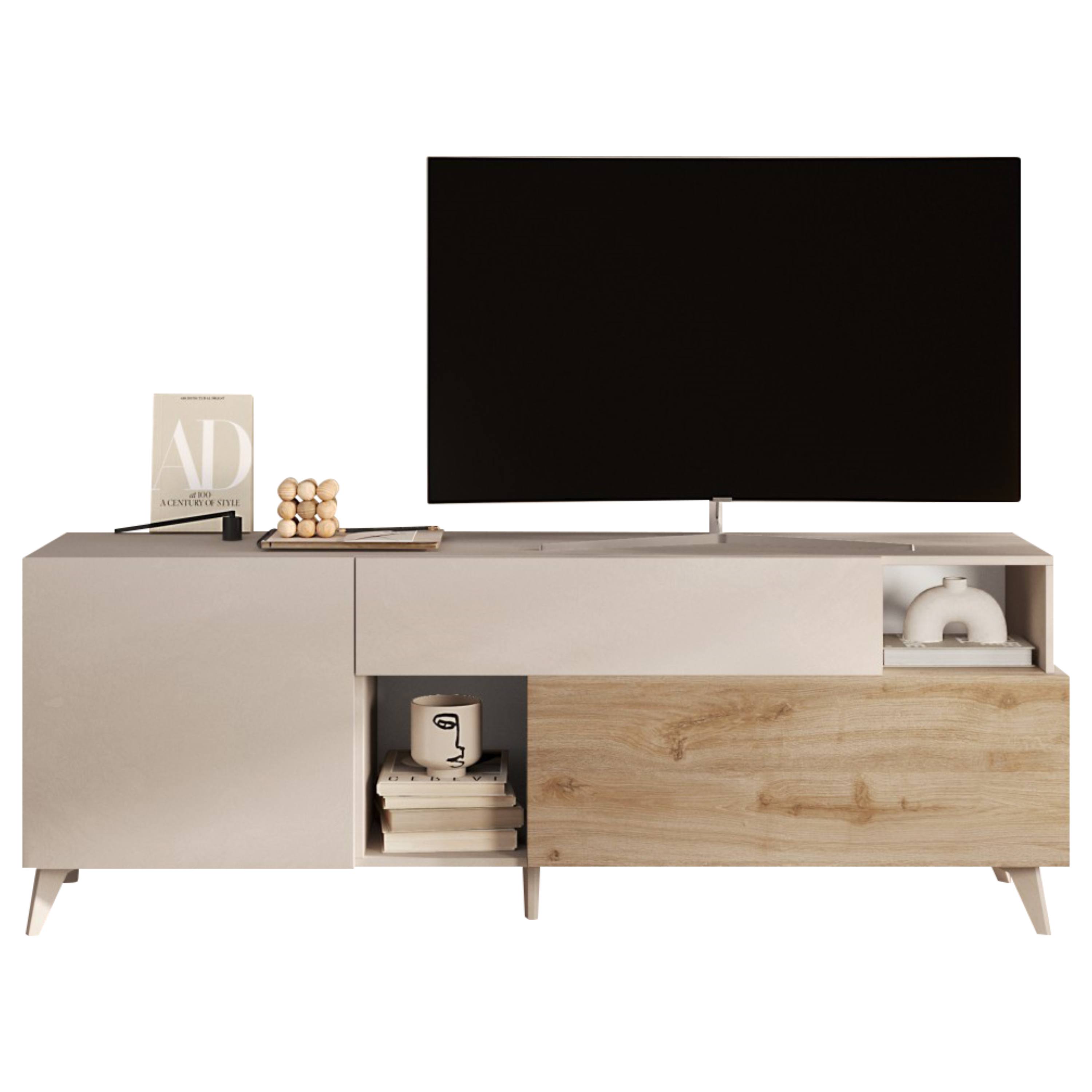 Ľavá strana je vybavená otočnými dverami, ktoré za sebou ukrývajú 1 vloženú policu. Komoda obsahuje aj ďalšie uzatvárateľné úložné priestory v podobe dostatočne hlbokej zásuvky a priestoru za výklopnými dverami. Každodennú manipuláciu so všetkými uvedenými prvkami spríjemňuje systém tichého dovierania soft close. TV komoda ponúka aj 2 otvorené odkladacie okná ideálne na vystavenie dekorácií. Celkový vzhľad zvýrazňujú kónické nohy. Konštrukcia je vyrobená z kvalitnej laminovanej drevotriesky nenáročnej na údržbu.