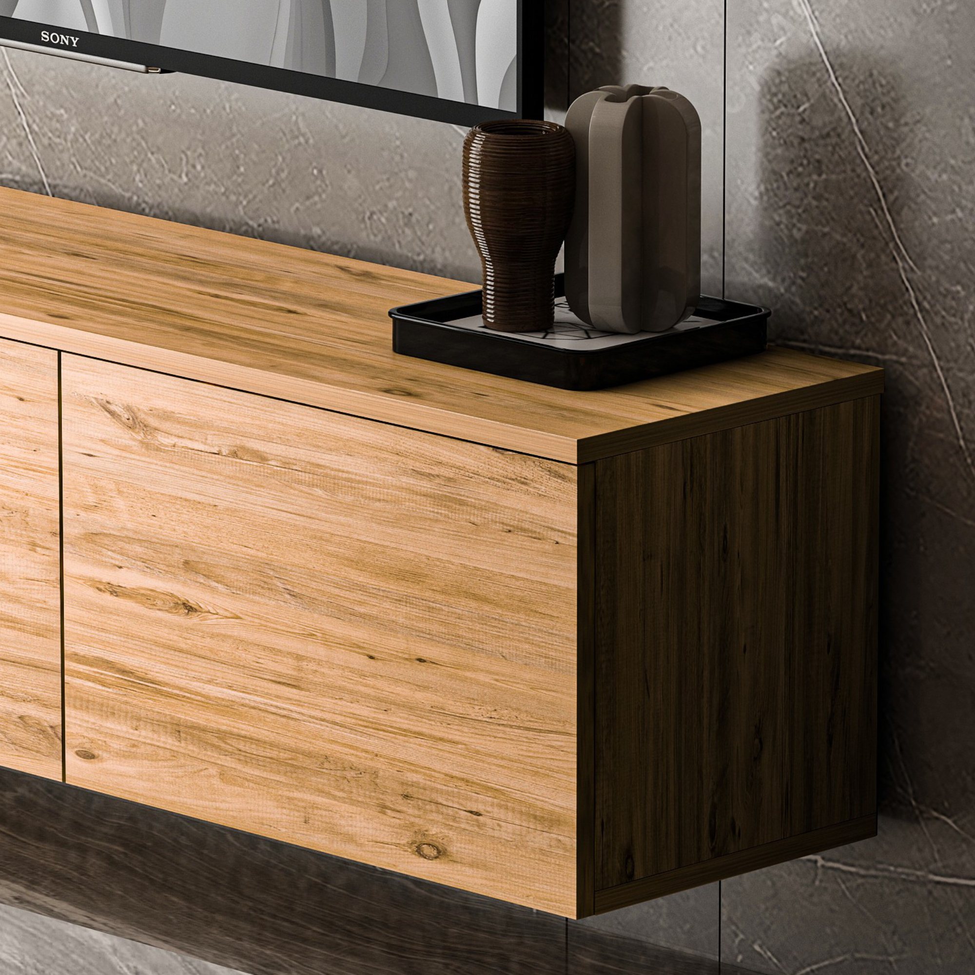 Na výrobu TV komody NEON 2 bola využitá laminovaná drevotriesková doska, ktorá je nenáročná na údržbu.