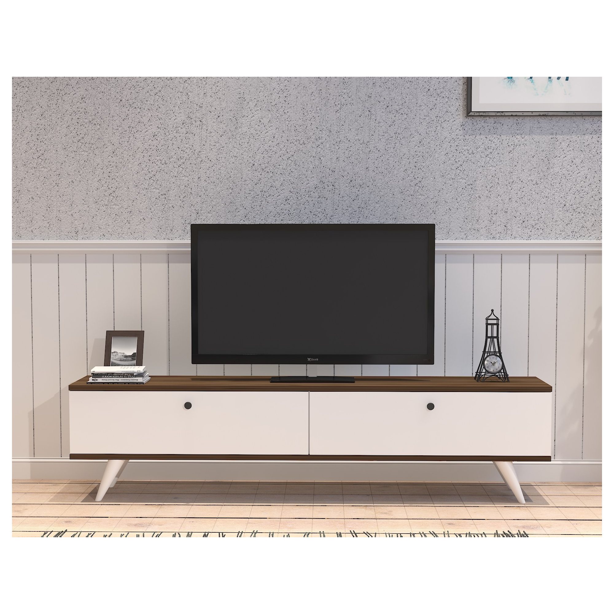 Disponuje 2 výklopnými dvierkami, ktoré odkrývajú 2 oddelené úložné priestory. Tie vytvárajú dostatok miesta na odloženie všetkého, čo potrebujete mať po ruke. Vrchná doska so šírkou 160 cm ponúka priestor pre televíziu, elektroniku, ovládače aj dekorácie. Dvierka sú doplnené jemnými úchytkami pre pohodlnú manipuláciu. Štýlovou bodkou sú 4 kónické nohy.
