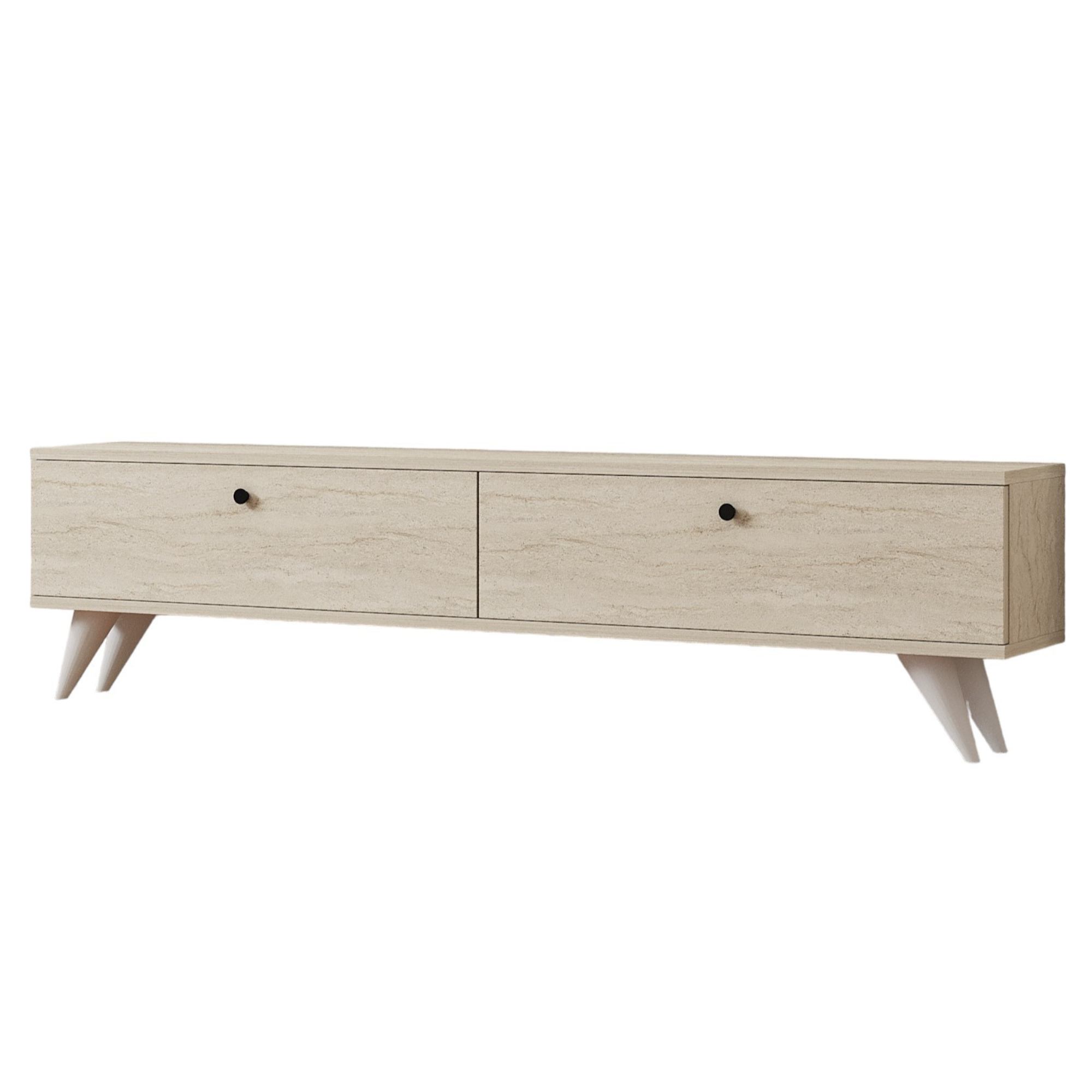 Disponuje 2 výklopnými dvierkami, ktoré odkrývajú 2 oddelené úložné priestory. Tie vytvárajú dostatok miesta na odloženie všetkého, čo potrebujete mať po ruke. Vrchná doska so šírkou 160 cm ponúka priestor pre televíziu, elektroniku, ovládače aj dekorácie. Dvierka sú doplnené jemnými úchytkami pre pohodlnú manipuláciu. Štýlovou bodkou sú 4 kónické nohy.