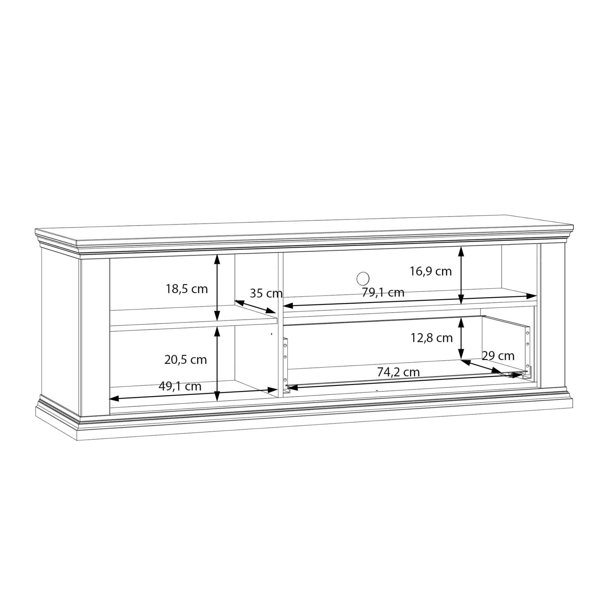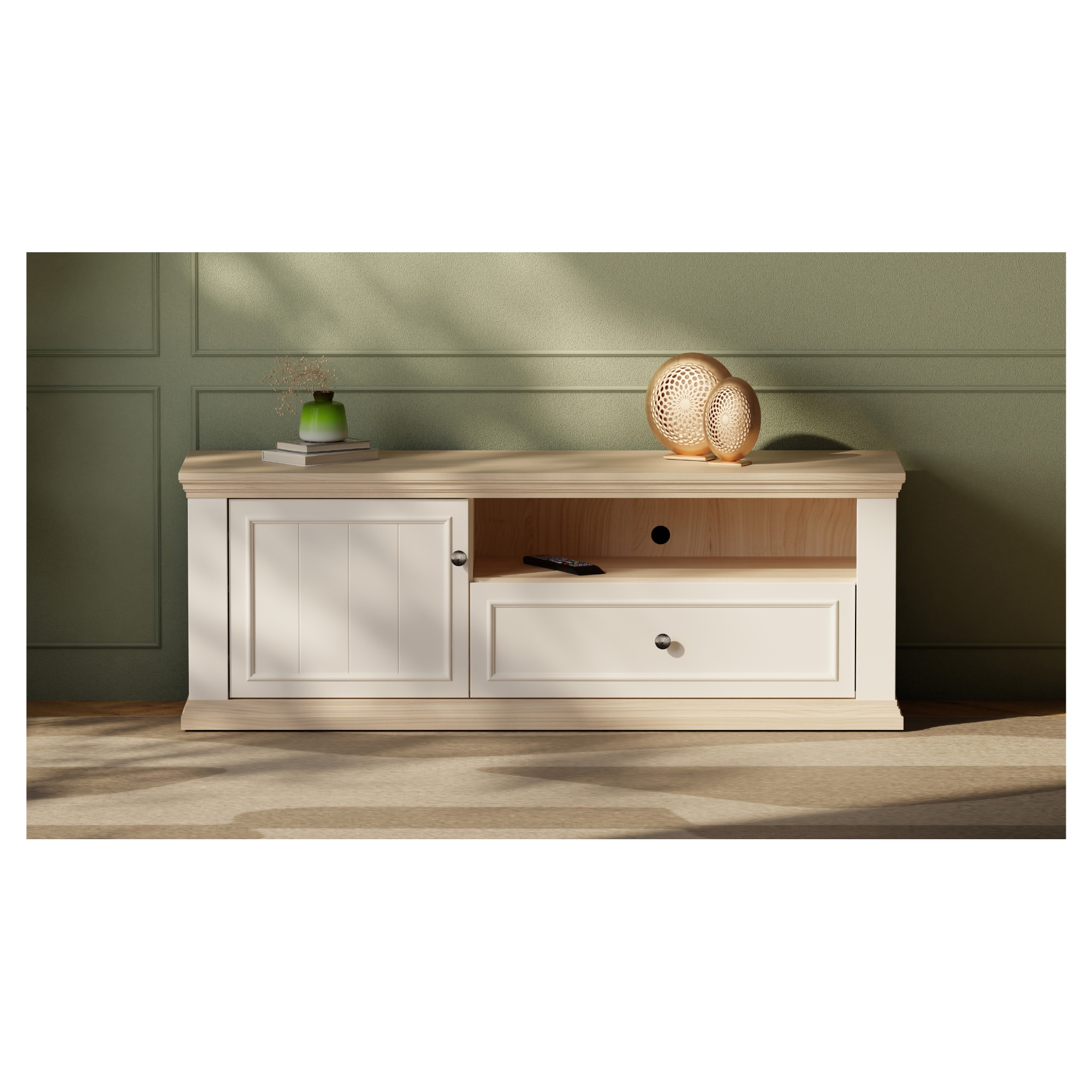 Za jej dvierkami nájdete 1 vloženú policu. Okrem nej je súčasťou TV komody aj 1 zásuvka, ktorá je ako stvorená na uloženie rôznych drobností. Aby sa s dvierkami a zásuvkou lepšie manipulovalo, sú vybavené rúčkami. Nechýba ani otvor na kabeláž.