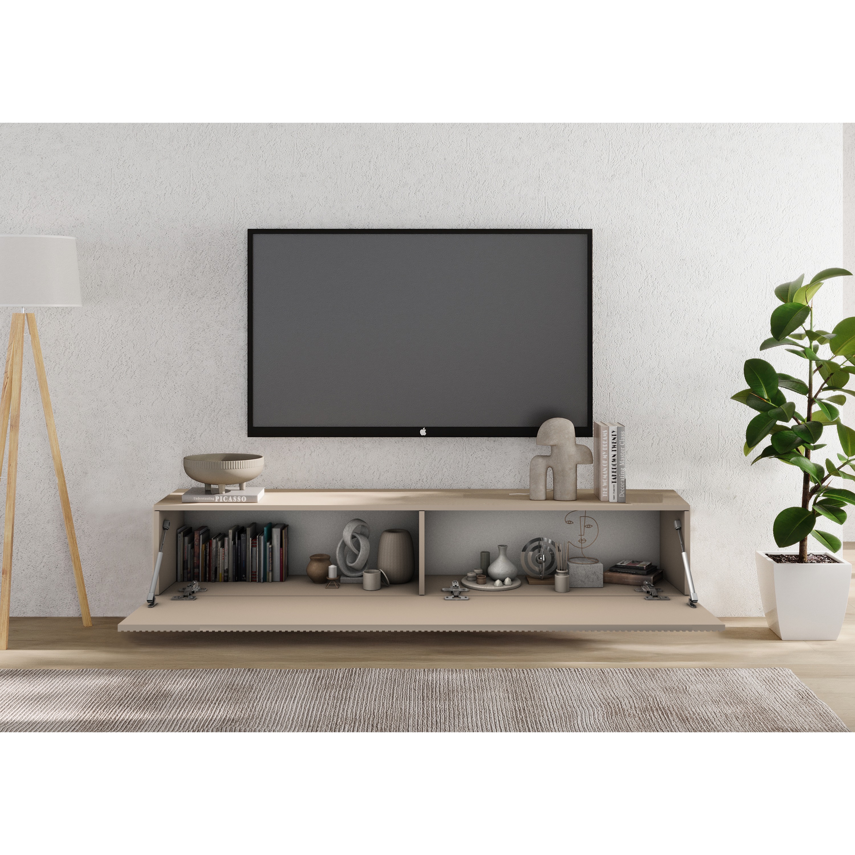 Vďaka tomu sa bude vynímať v každom moderne zariadenom interiéri. Dostatočne široká vrchná doska vám okrem samotnej televízie ponúkne priestor aj na TV príslušenstvo a iné predmety. Vnútro komody je chránené tromi výklopnými dvierkami v bezúchytovom prevedení.