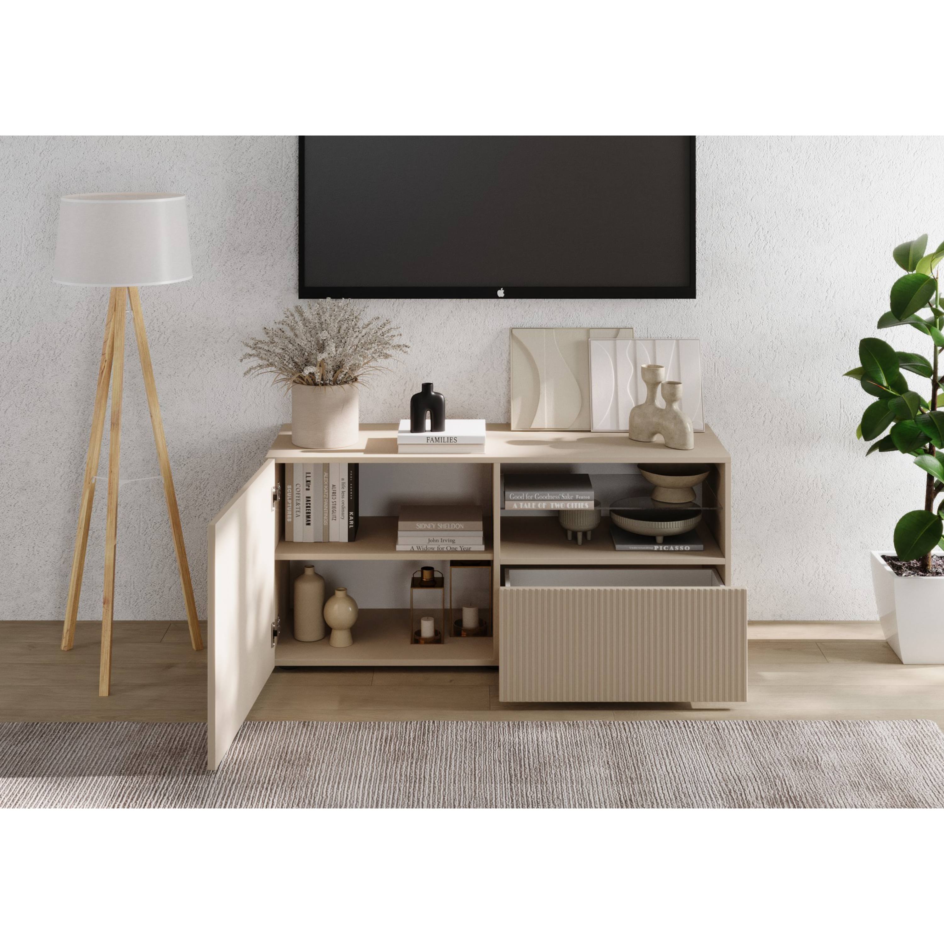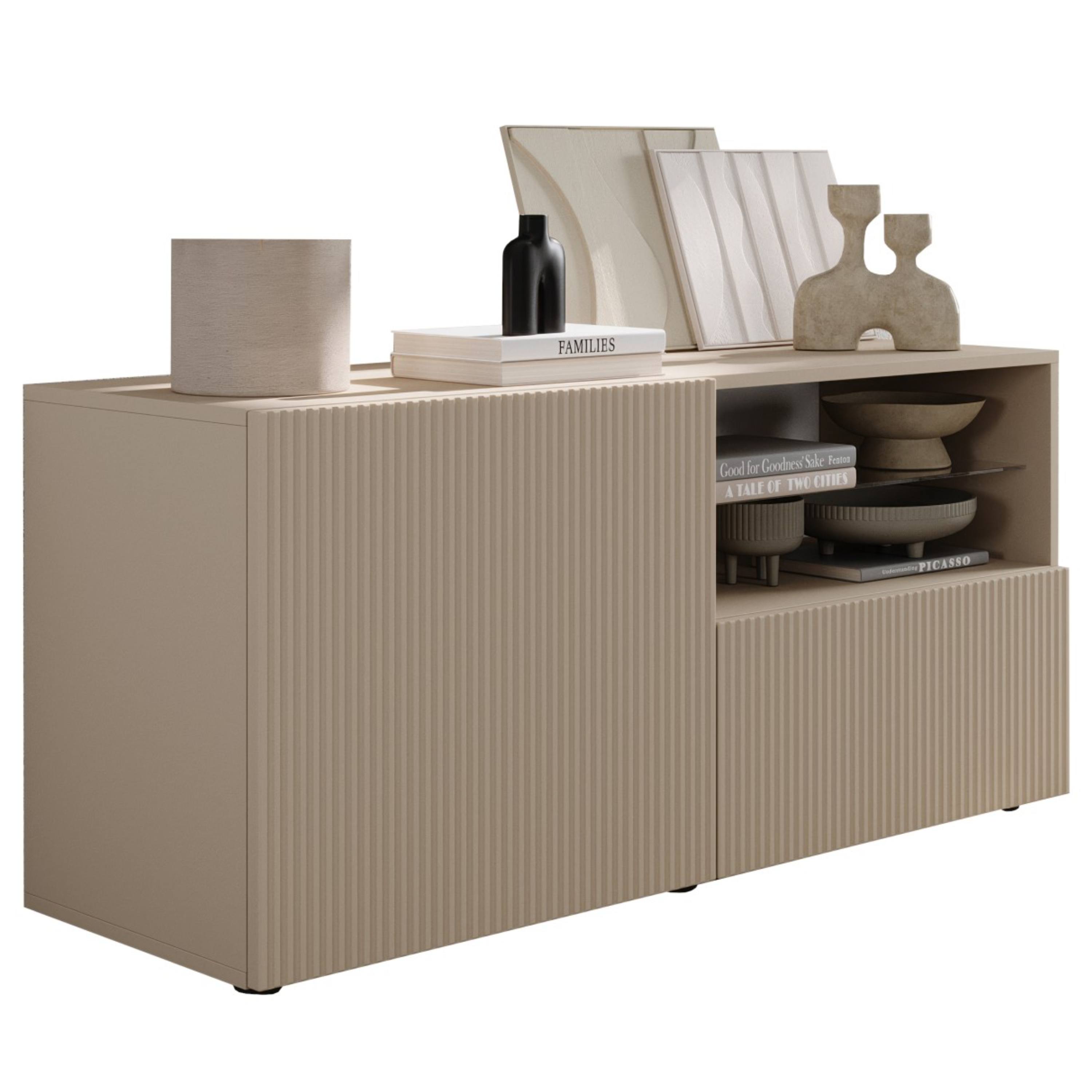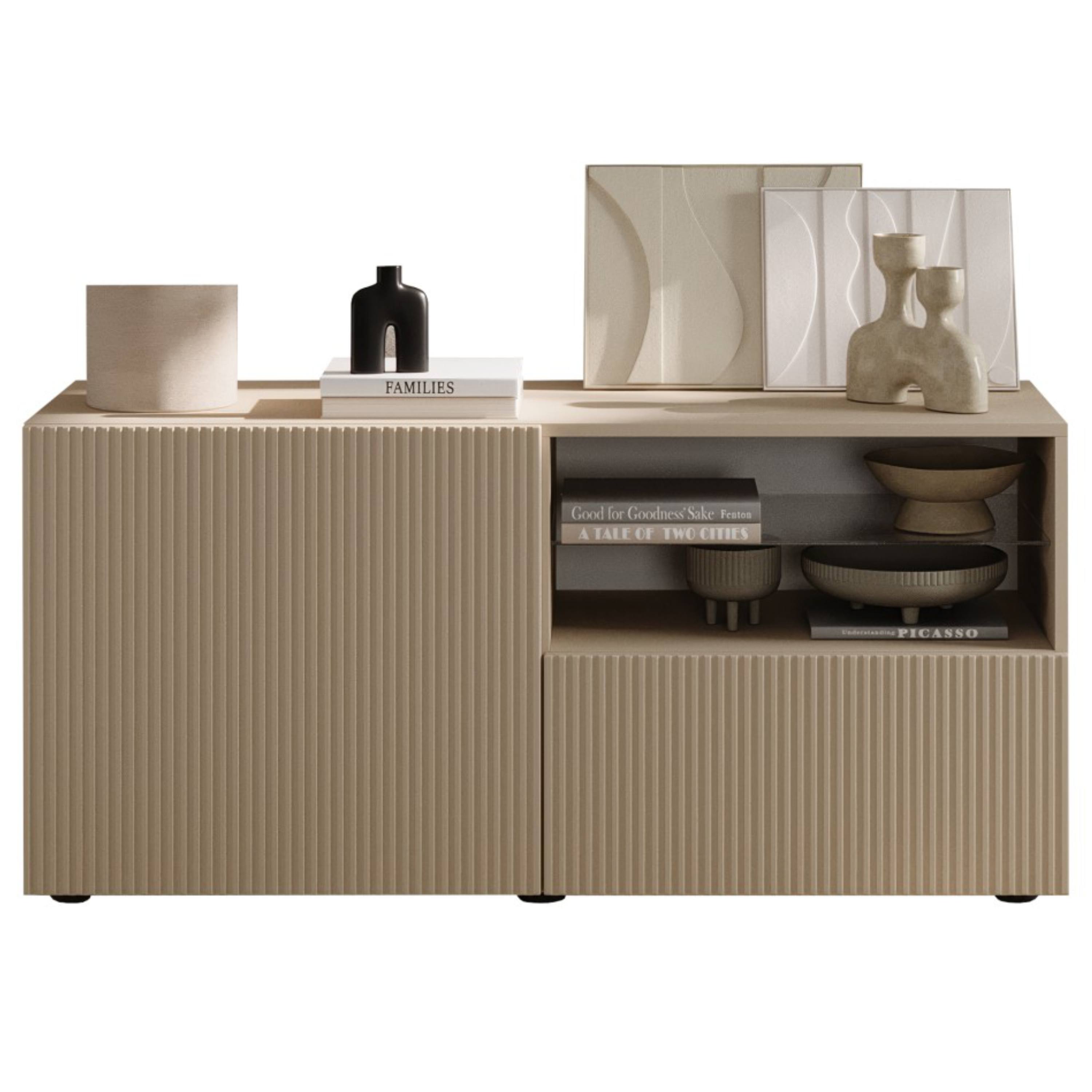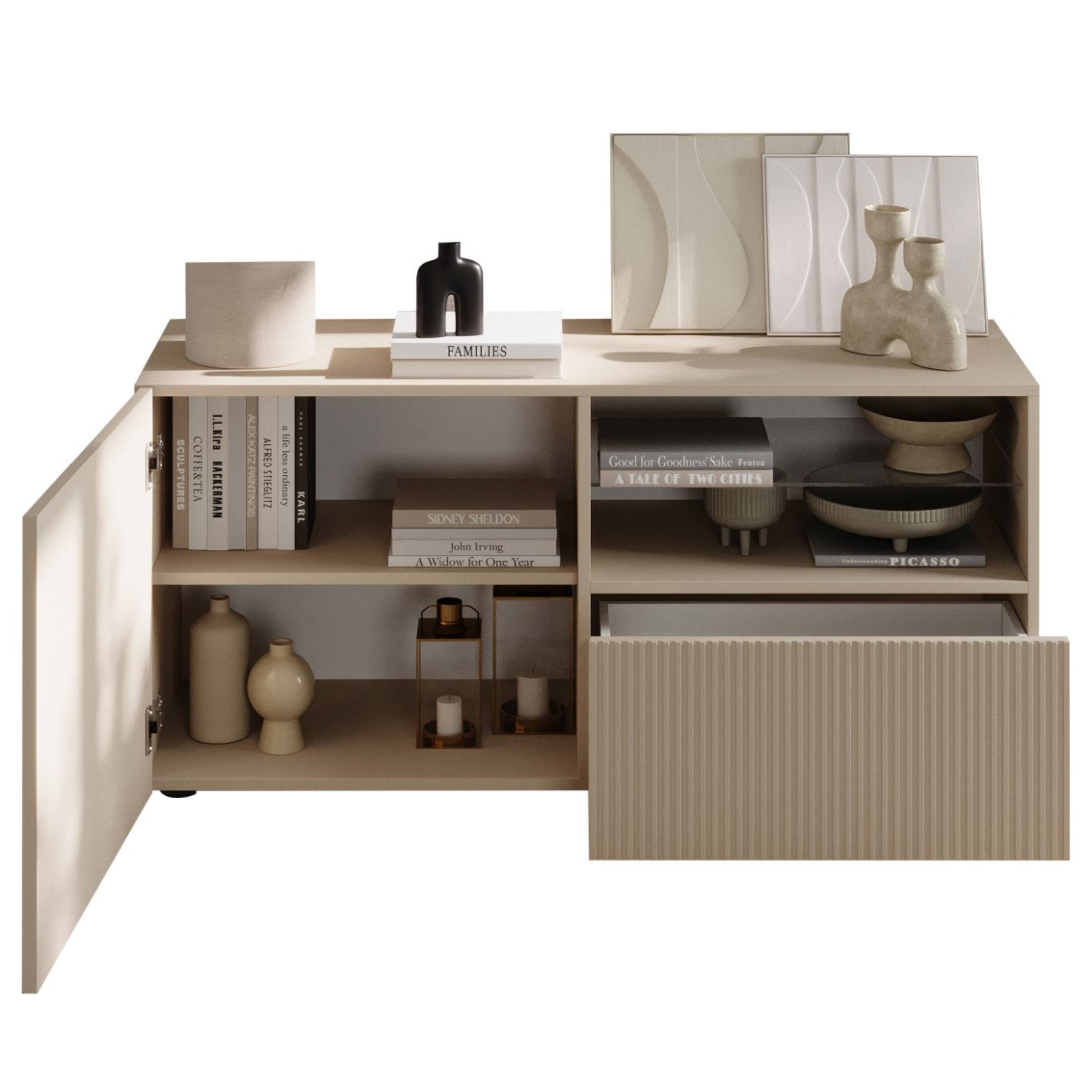 Komoda je vybavená zásuvkou a vloženými policami, ktoré sa ukrývajú za dvierkami. Otvorenú priehradku využijete na TV príslušenstvo. Vďaka tomu poskytuje dostatok úložného priestoru, ktorý nepochybne využijete vo vašej domácnosti. Komoda sa vyznačuje jednoduchou údržbou.