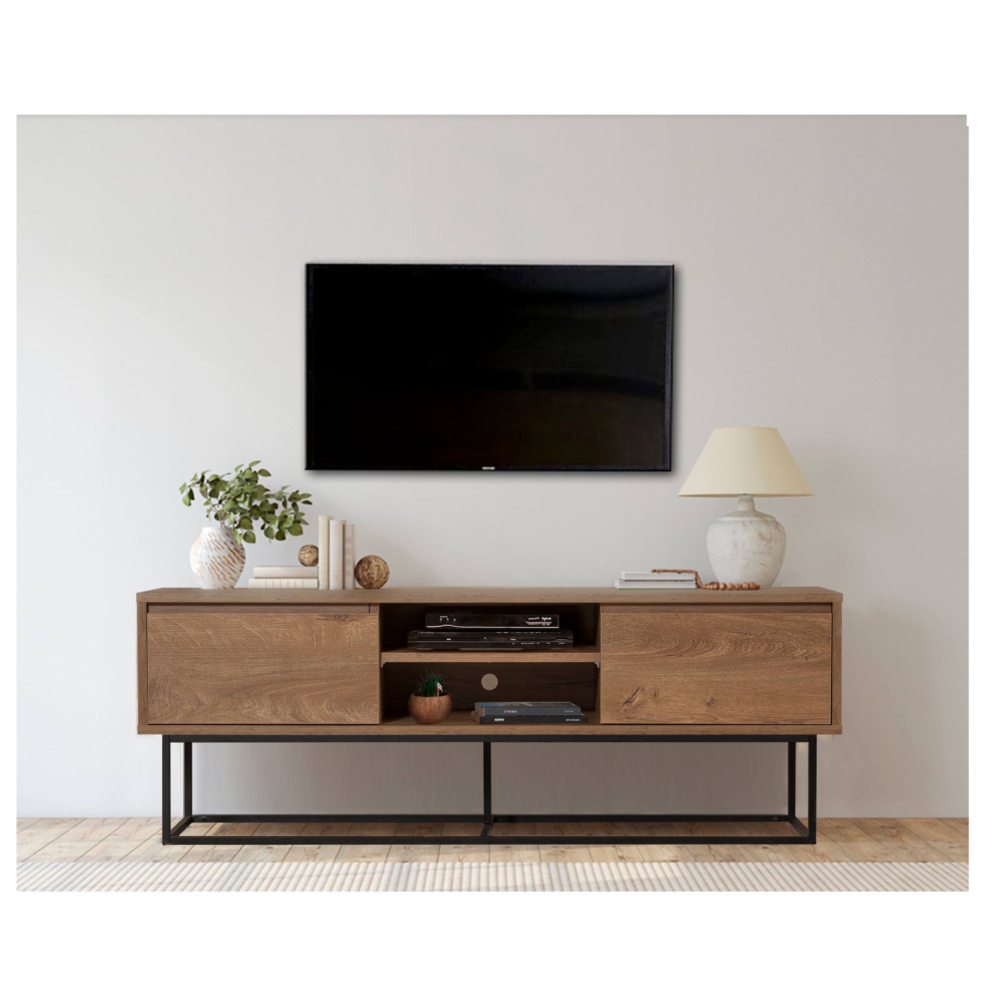 Komoda je vyrobená z laminovanej drevotrieskovej dosky a stojí na pevnej kovovej konštrukcii. Pretože je výška konštrukcie 23 cm, nepredstavuje upratovanie pod komodou žiadny problém. Na ľavej aj pravej strane komody sa nachádza praktická zásuvka a medzi nimi nájdete otvorený priestor s jednou vloženou policou. Komoda tak poskytuje dostatok úložného priestoru nielen na príslušenstvo k televízii.