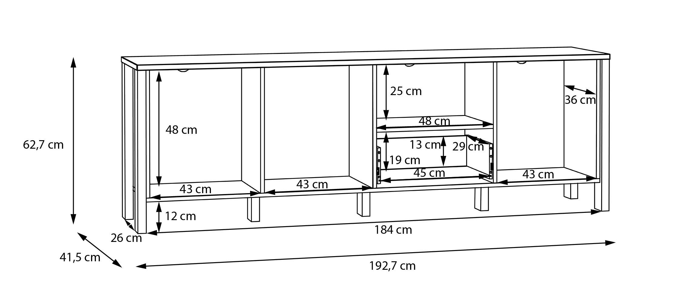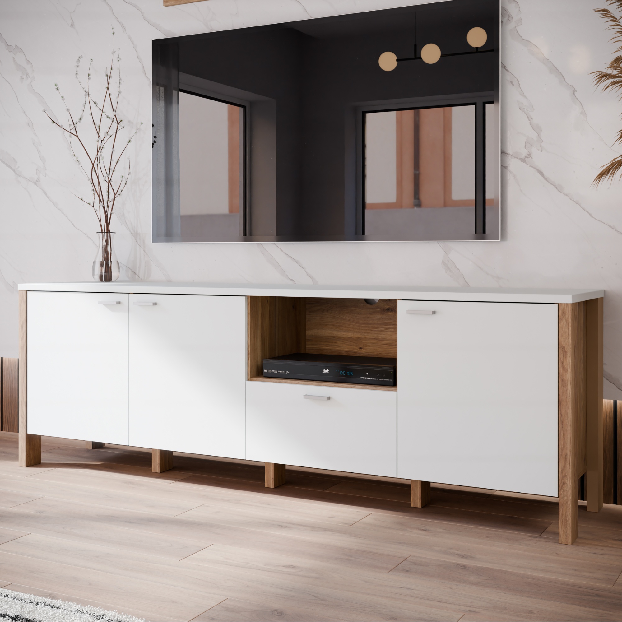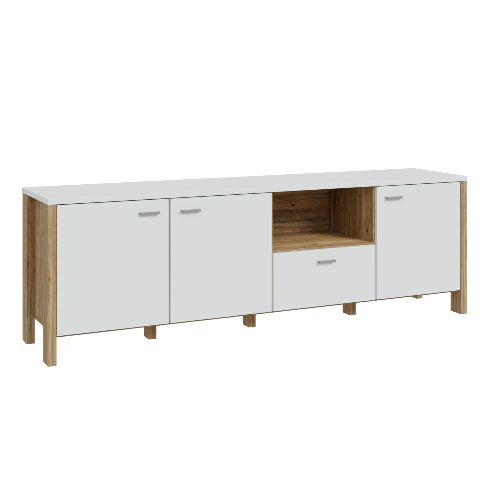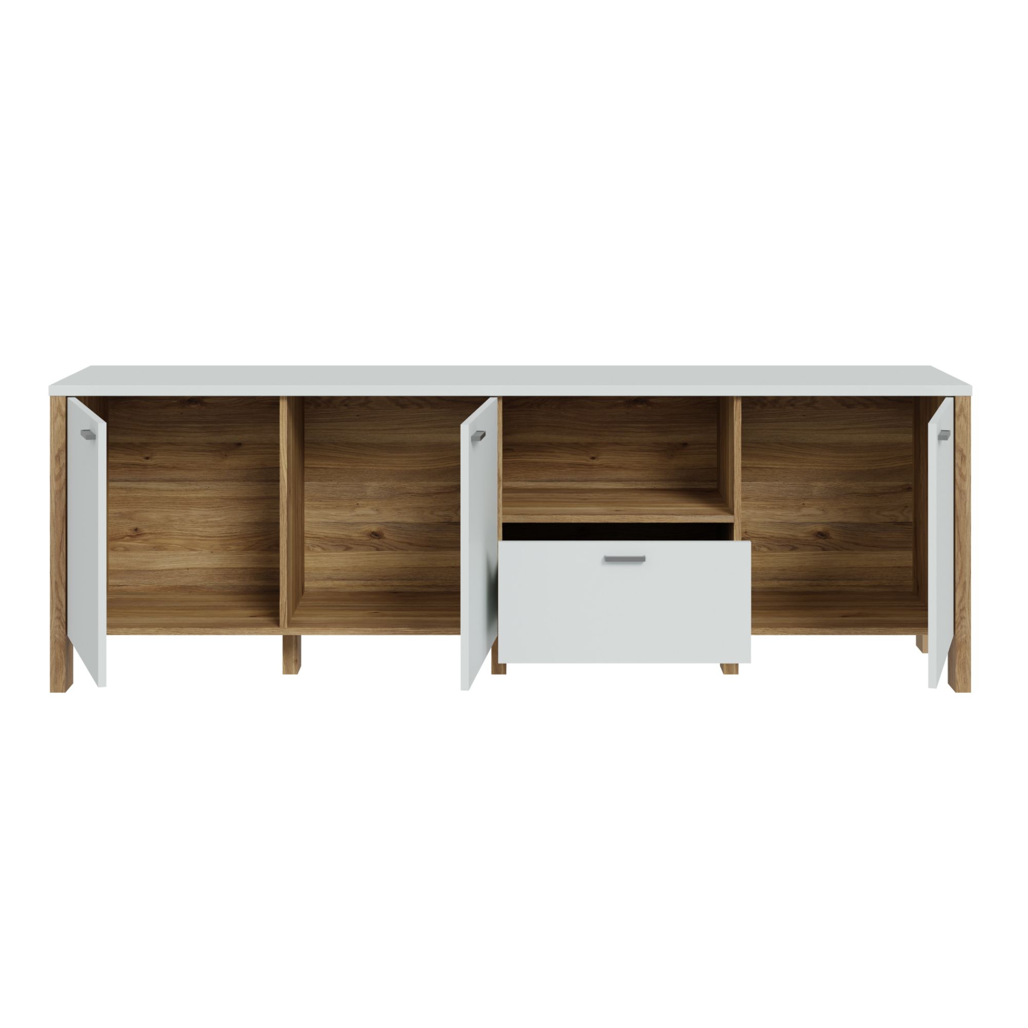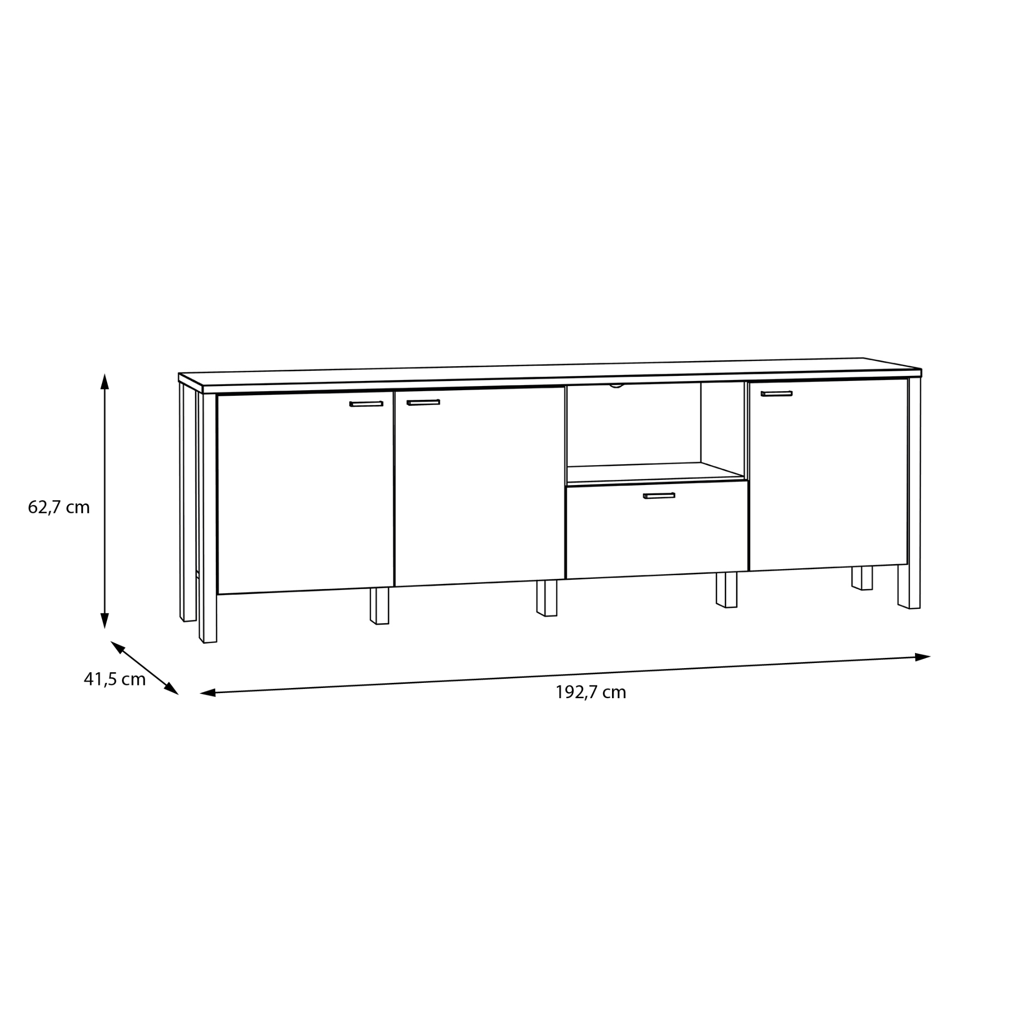 Komoda disponuje tromi priestrannými dvierkami, za ktorými sa skrýva úložný priestor vhodný na uloženie väčších predmetov alebo elektroniky. Uprostred je praktická otvorená časť, ideálna na umiestnenie dekorácií alebo elektroniky, ako je herná konzola či set-top box, s možnosťou rýchleho prístupu a dobrého odvetrávania. Pod touto otvorenou časťou sa nachádza zásuvka, ktorá je vhodná na uloženie menších predmetov, ako sú ovládače alebo ďalšie príslušenstvo.