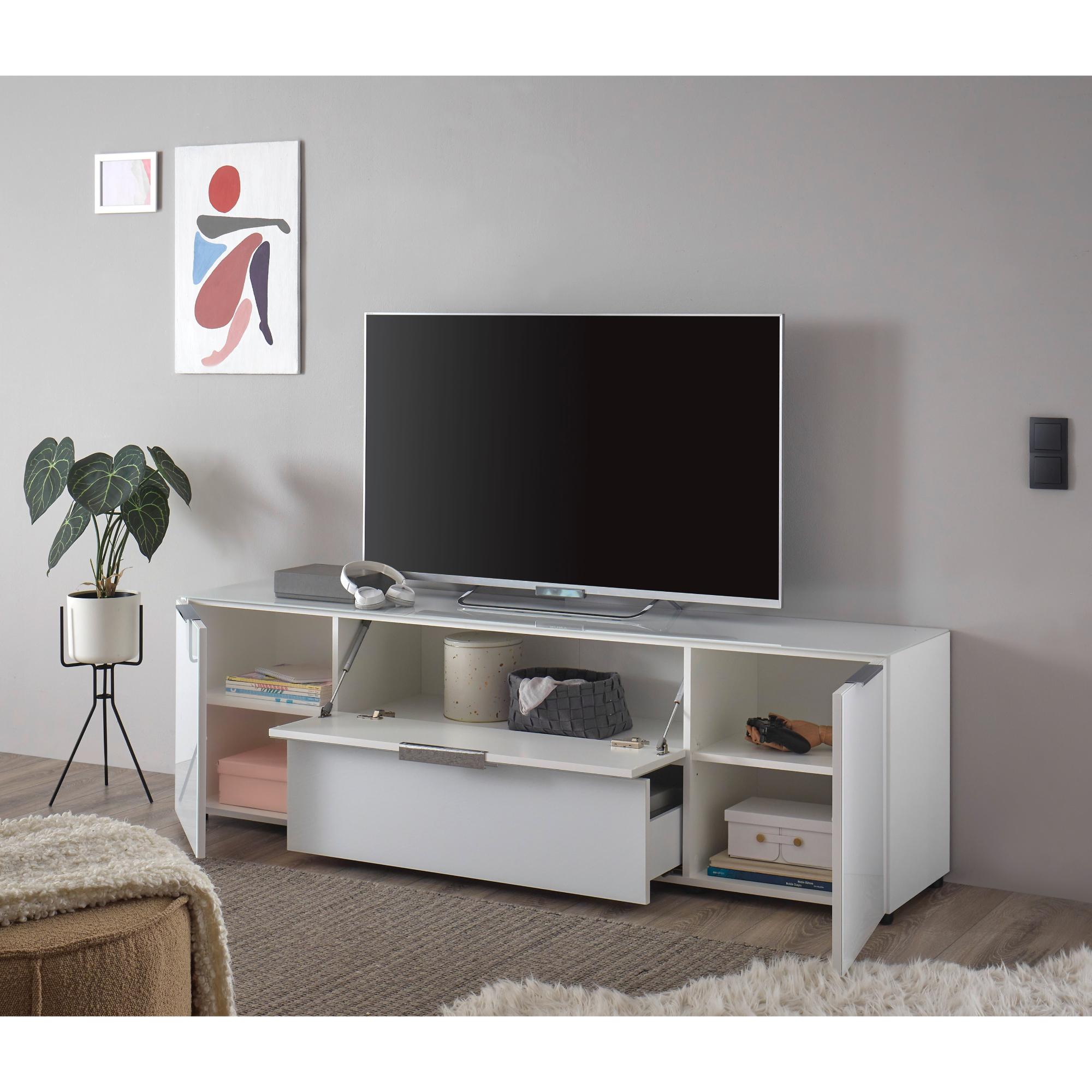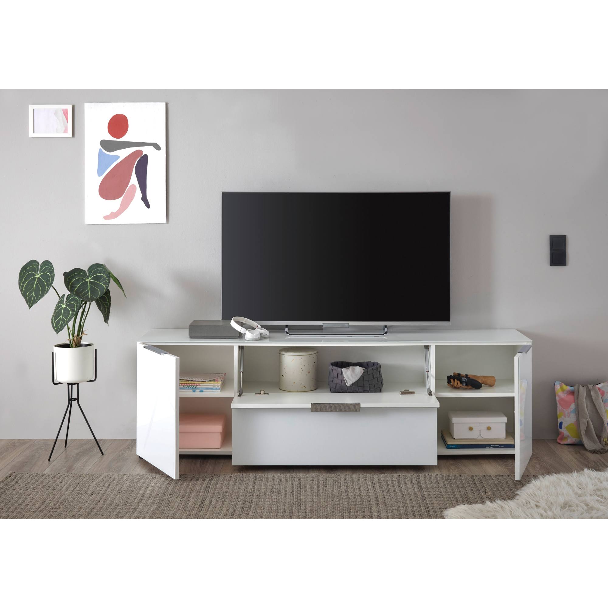 TV komoda SANTORIN 6 kombinuje moderný dizajn a praktickosť. Sklenené vyhotovenie predných častí a hornej dosky ozvláštni vašu domácnosť a dodá jej atraktívny nádych. Je ideálnym kusom nábytku do moderne ladených interiérov.