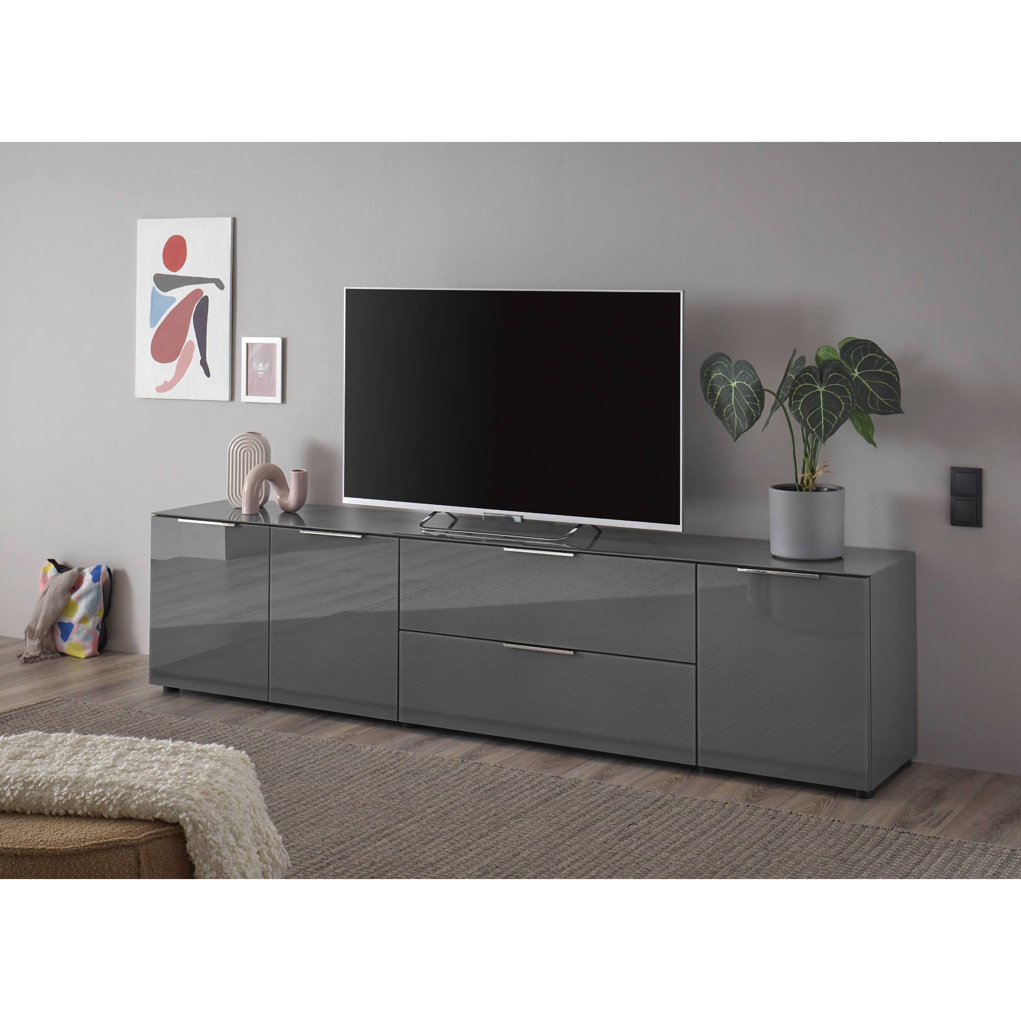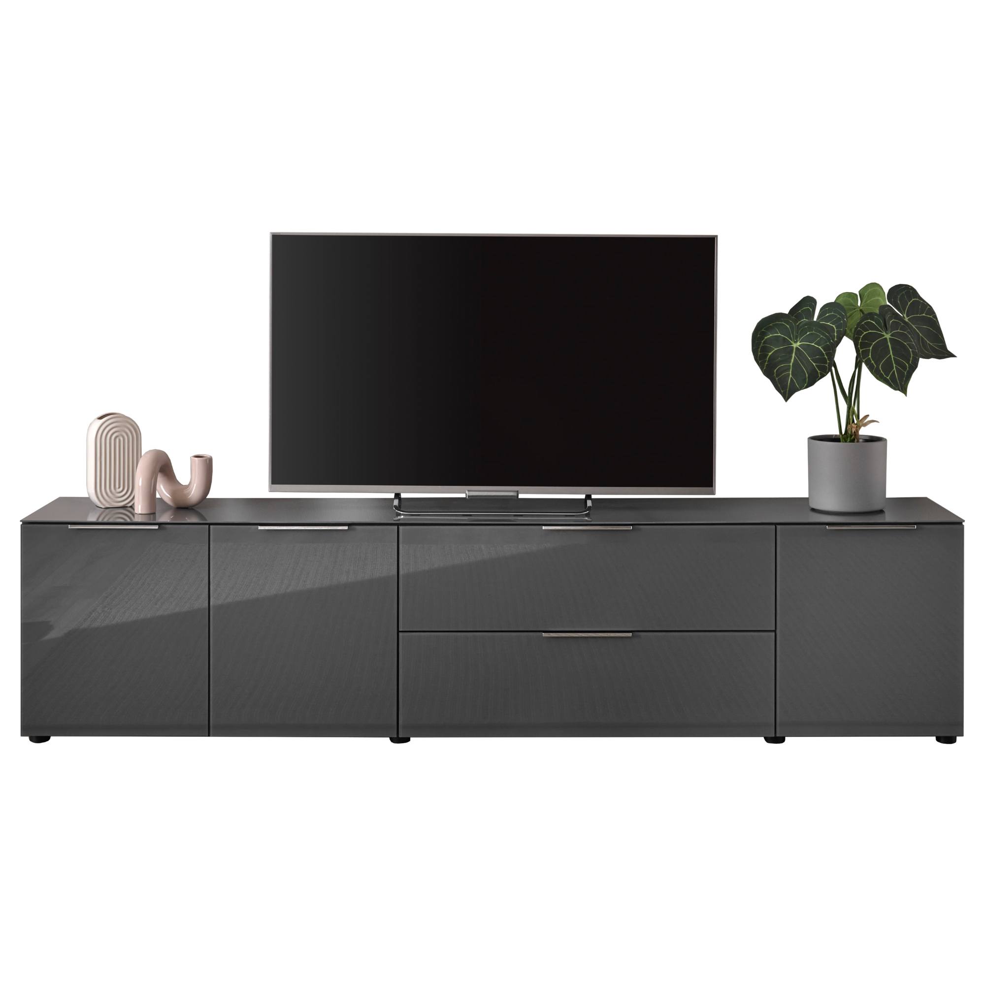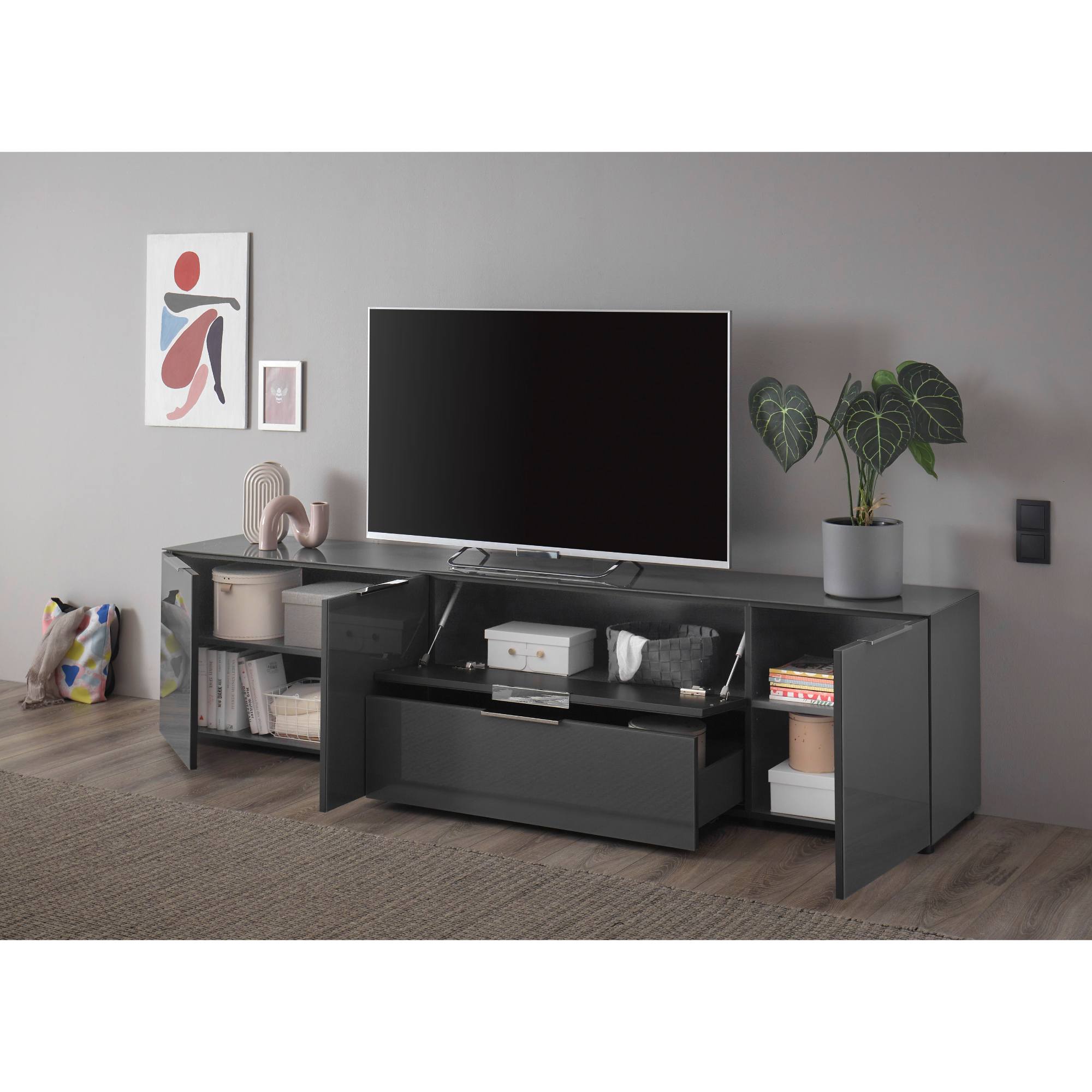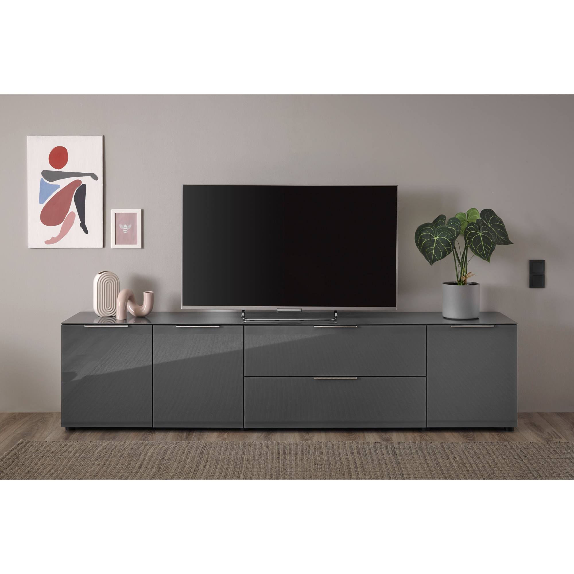 TV komoda SANTORIN 7 kombinuje moderný dizajn a praktickosť. Sklenené vyhotovenie predných častí a hornej dosky ozvláštni vašu domácnosť a dodá jej atraktívny nádych. Je ideálnym kusom nábytku do moderne ladených interiérov.
