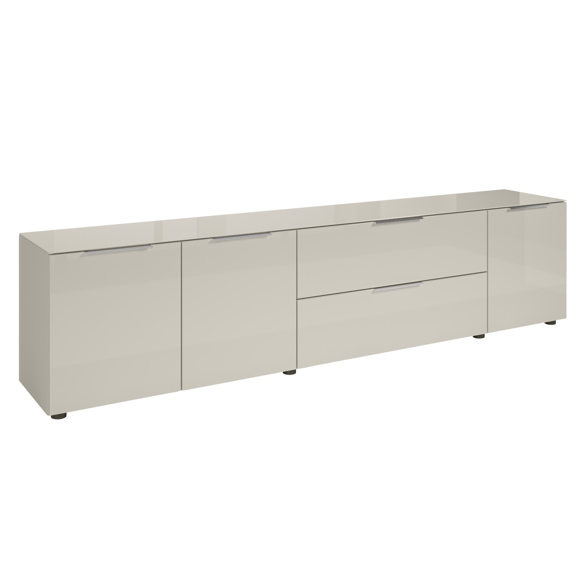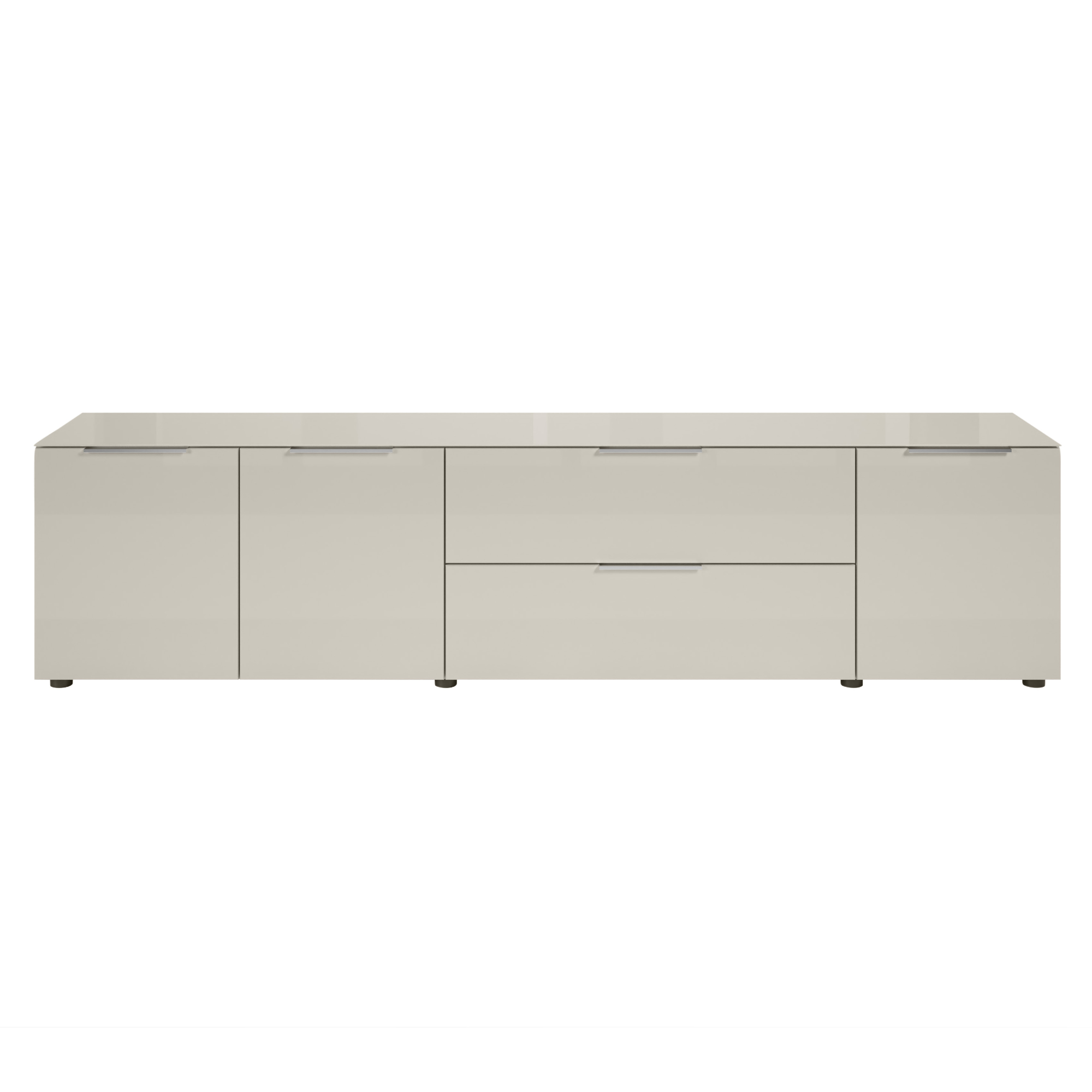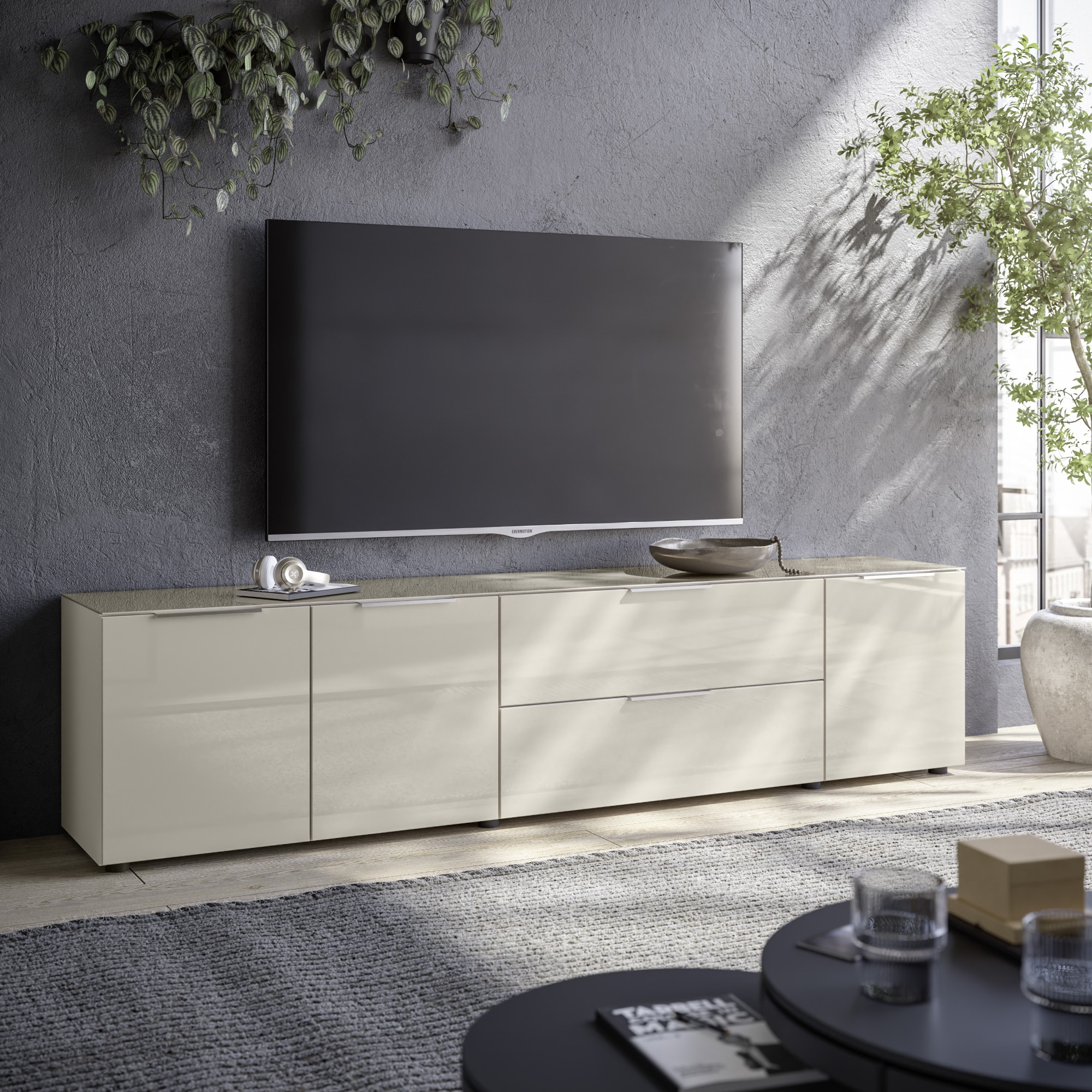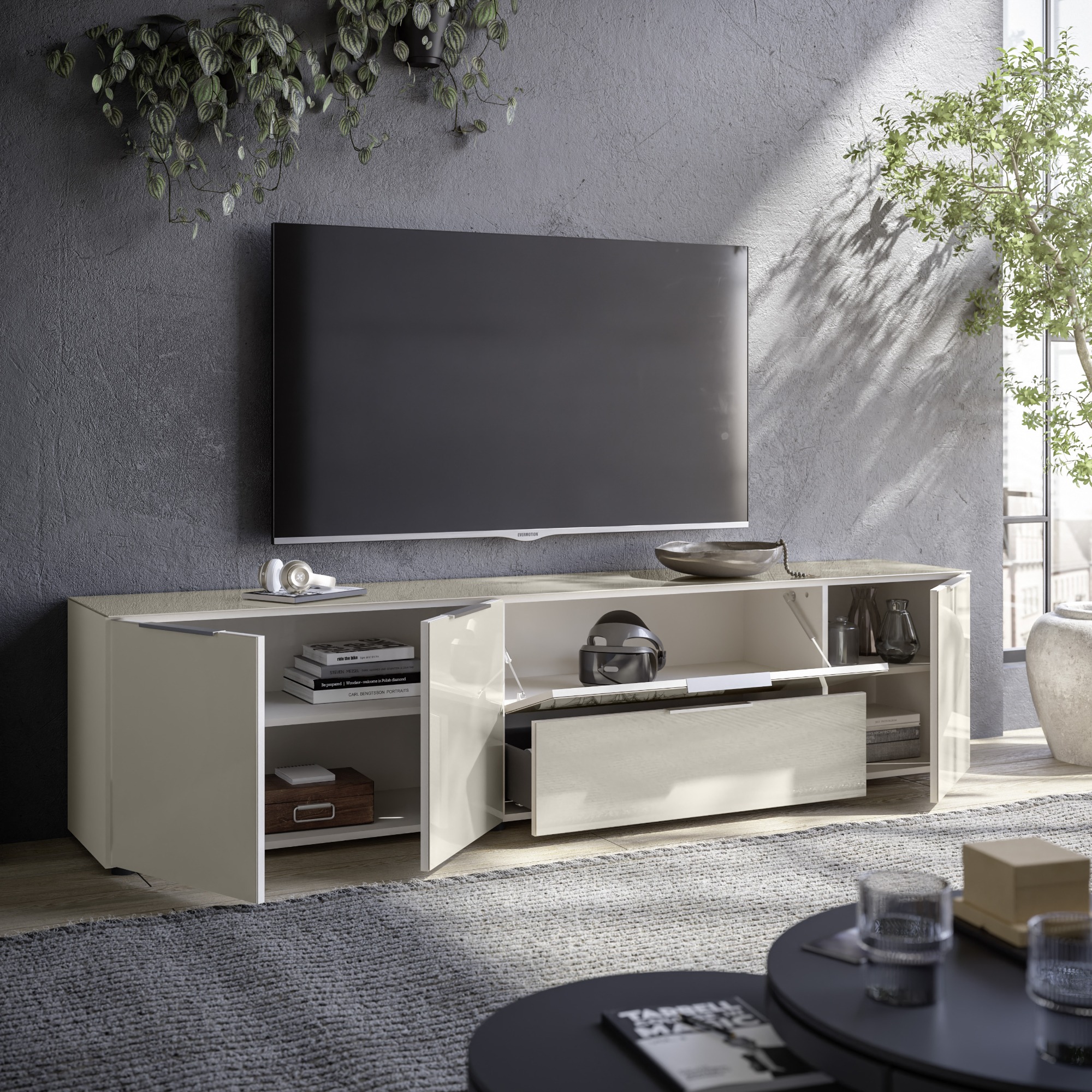 TV komoda SANTORIN 7 kombinuje moderný dizajn a praktickosť. Sklenené vyhotovenie predných častí a hornej dosky ozvláštni vašu domácnosť a dodá jej atraktívny nádych. Je ideálnym kusom nábytku do moderne ladených interiérov.