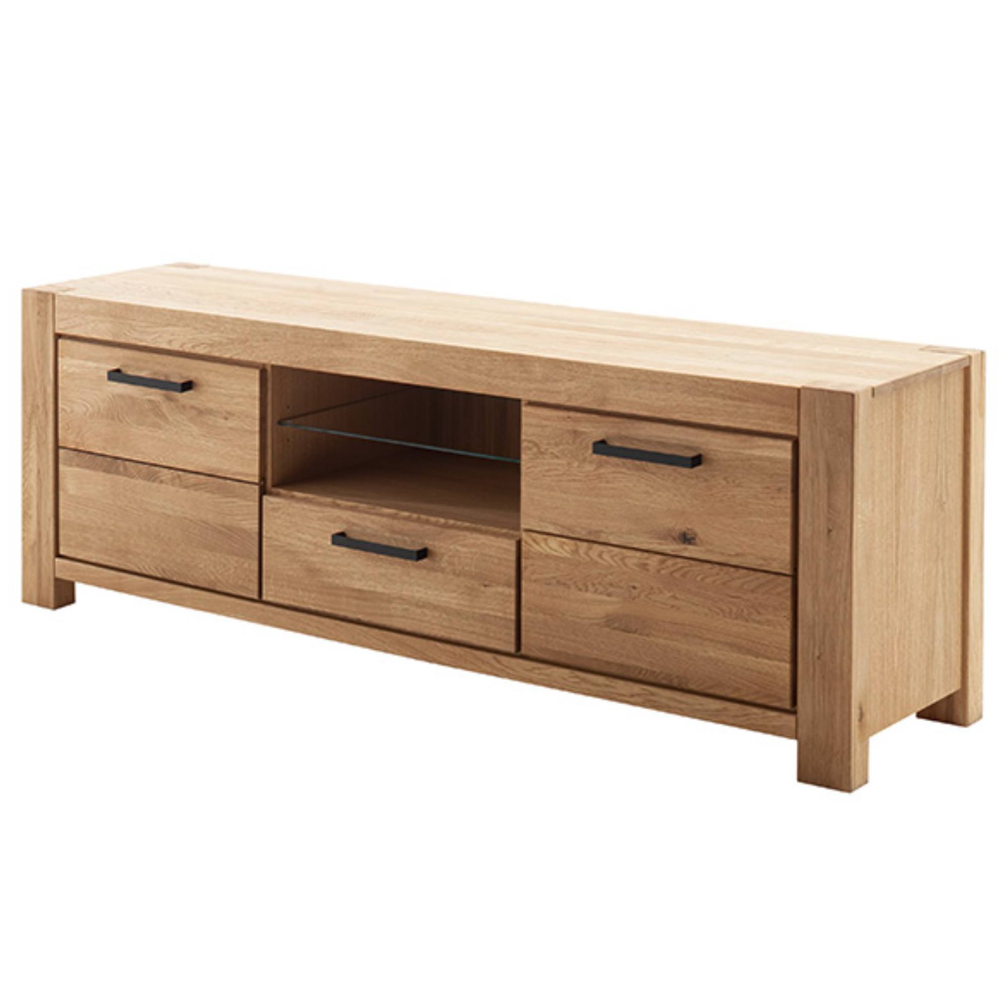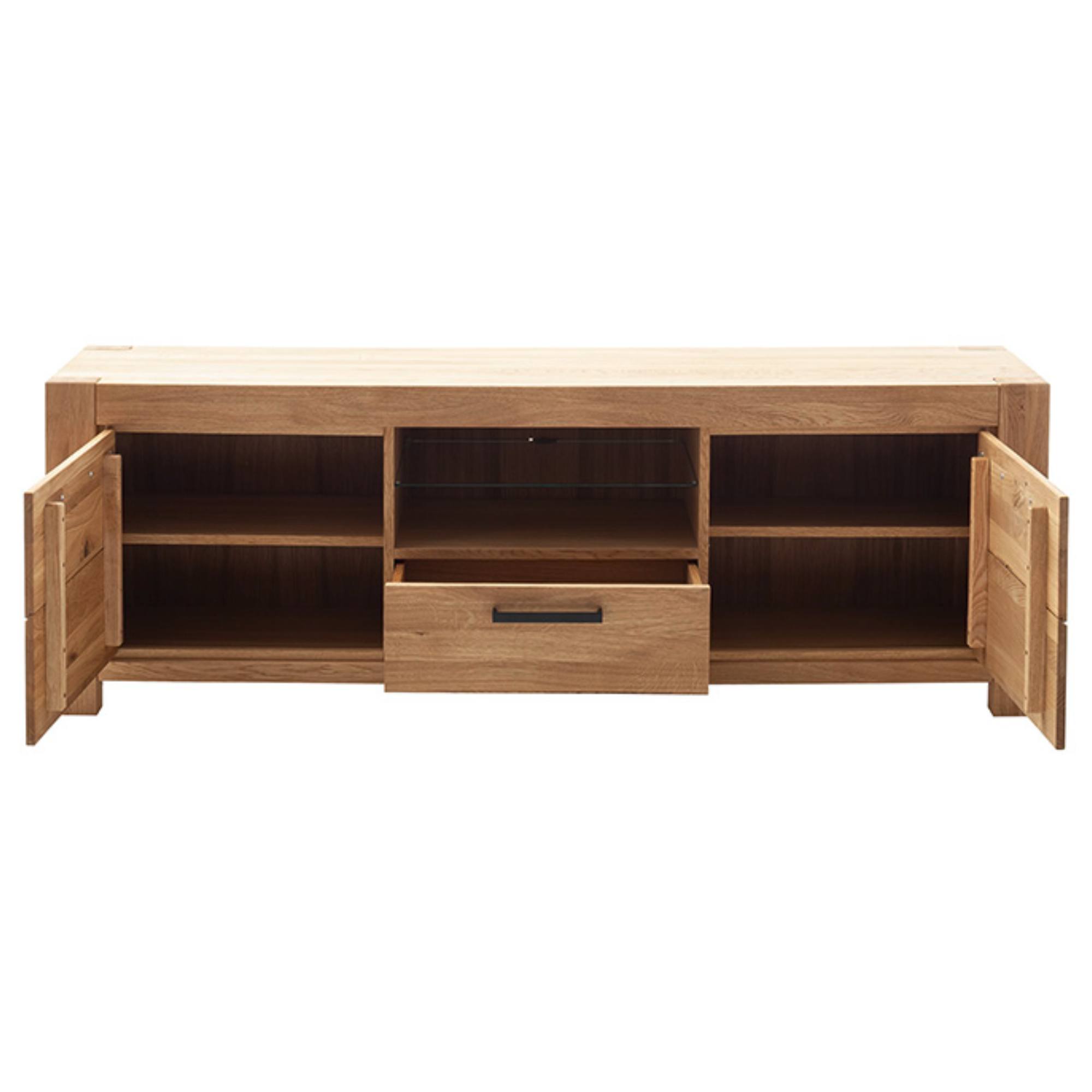TV komoda SILIAS necháva vyniknúť výraznú kresbu dreva z masívneho dubu s olejovou povrchovou úpravou. Masívna štruktúra zásuviek a dvierok v kombinácii s kovovými rúčkami pôsobí elegantným dojmom. Komoda poskytuje dostatok krytého úložného priestoru aj miesto na vystavenie dekorácií či TV príslušenstva vďaka otvorenej priehradke.