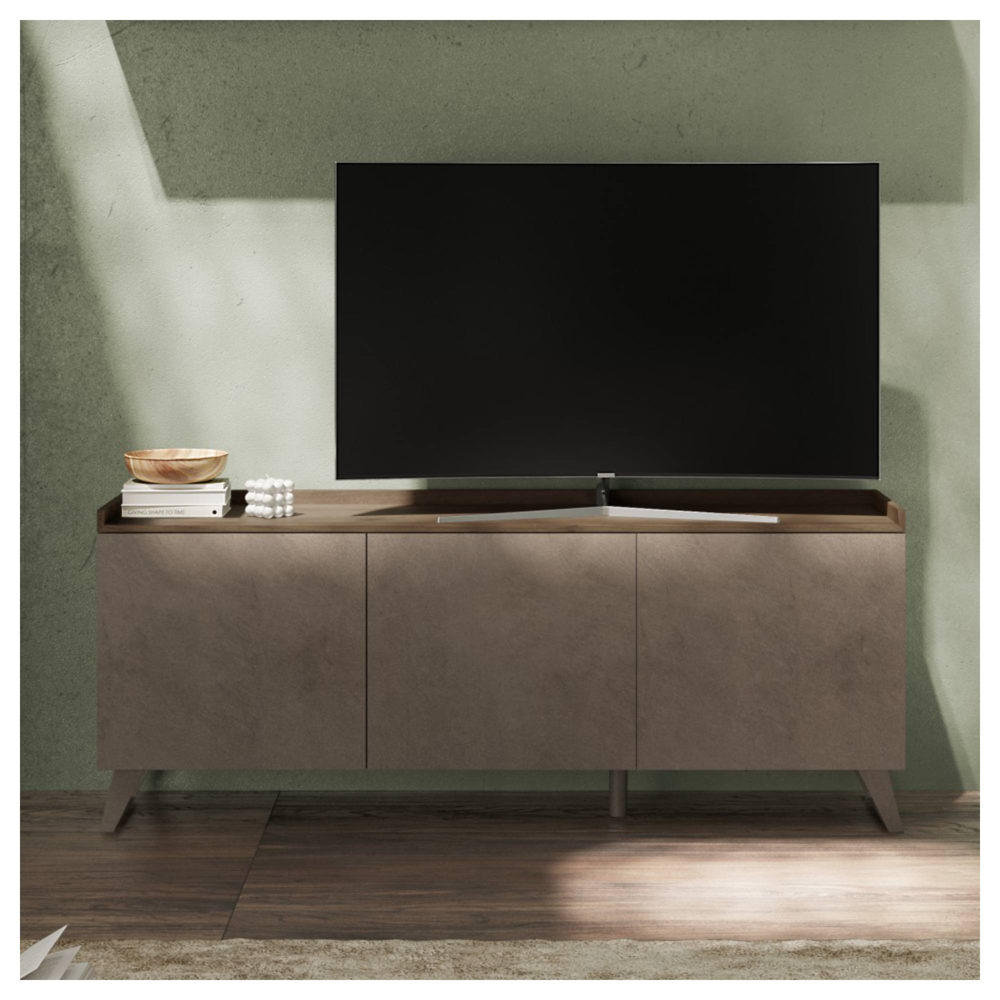 Komoda je vybavená 3 otočnými dverami ktorých otváranie a zatváranie spríjemňuje systém tichého dovierania soft close. Priestor za dverami neobsahuje žiadne vnútorné vybavenie, takže ho môžete využívať neobmedzene podľa svojich potrieb. TV komoda je vyrobená z laminovanej drevotriesky umožňujúcej ľahkú údržbu.