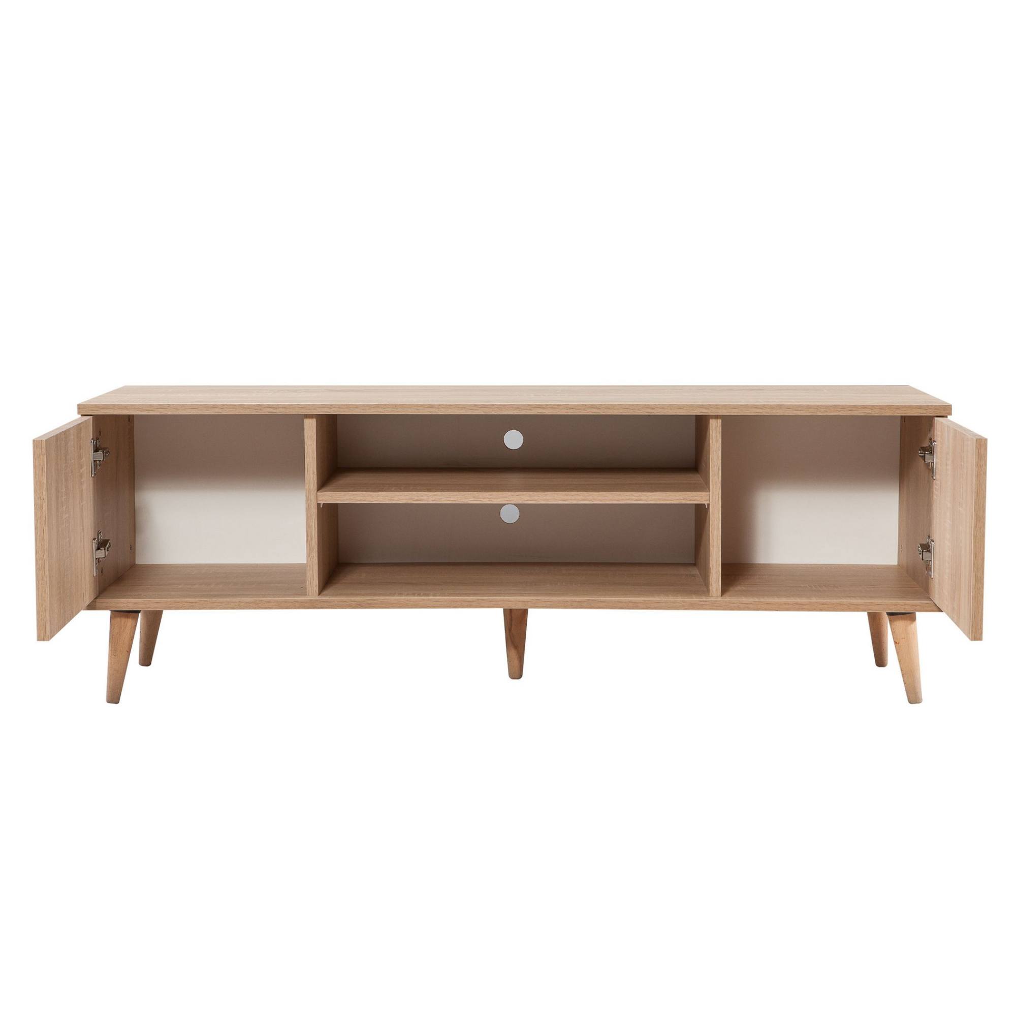 Uprostred komody je otvorený úložný priestor s 1 policou a otvormi na kabeláž. Je ideálnym miestom na umiestnenie set-top boxov, DVD prehrávačov a inej elektroniky. Ďalej disponuje 2 otočnými dvierkami, za ktorými nájdete ďalší úložný priestor. Ten poskytuje dostatok miesta na odloženie všetkého, čo potrebujete mať poruke. Vrchná doska so šírkou 140 cm ponúka priestor pre televízor aj dekorácie. Vďaka prevedeniu bez úchytiek jej dizajn pekne vyniká.