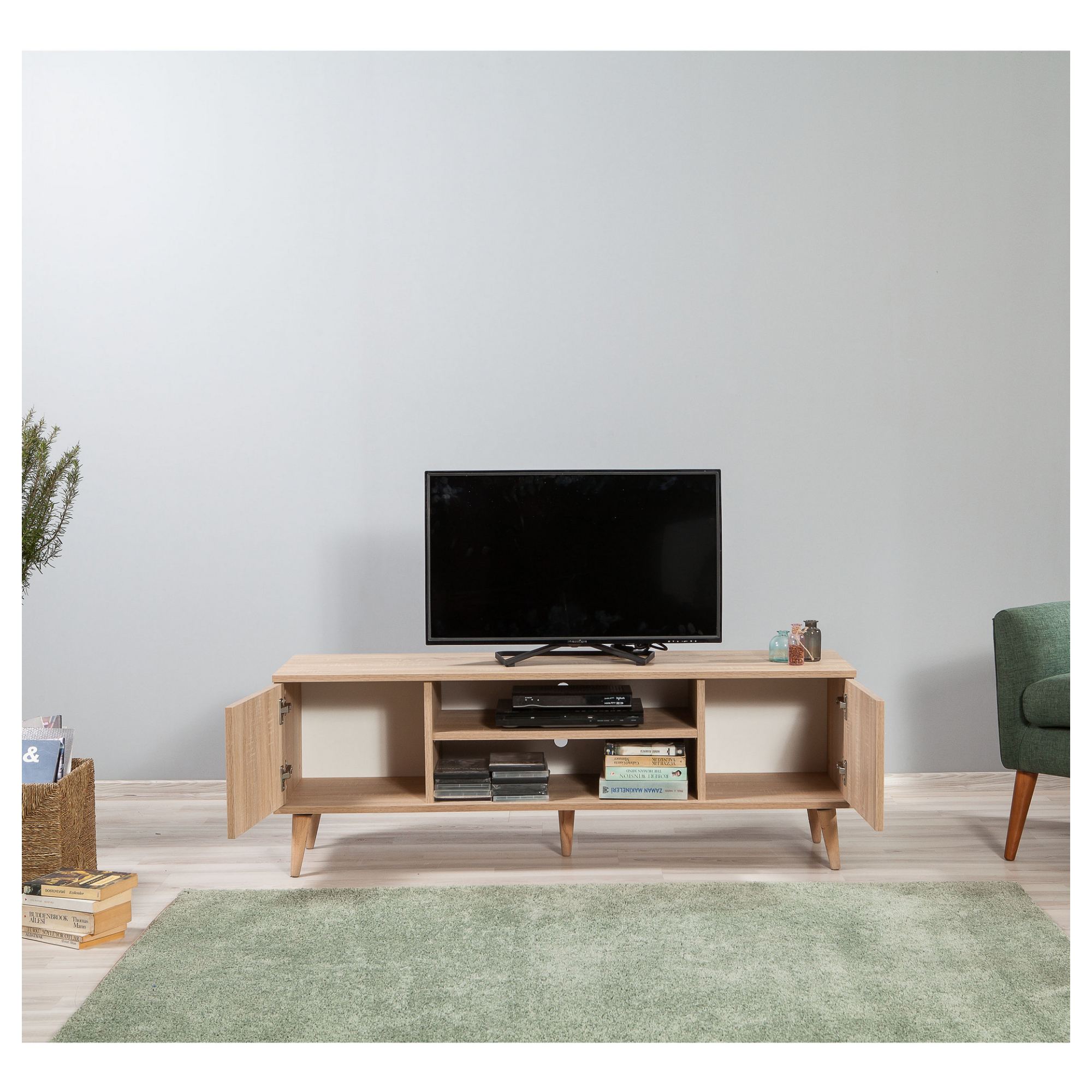Uprostred komody je otvorený úložný priestor s 1 policou a otvormi na kabeláž. Je ideálnym miestom na umiestnenie set-top boxov, DVD prehrávačov a inej elektroniky. Ďalej disponuje 2 otočnými dvierkami, za ktorými nájdete ďalší úložný priestor. Ten poskytuje dostatok miesta na odloženie všetkého, čo potrebujete mať poruke. Vrchná doska so šírkou 140 cm ponúka priestor pre televízor aj dekorácie. Vďaka prevedeniu bez úchytiek jej dizajn pekne vyniká.