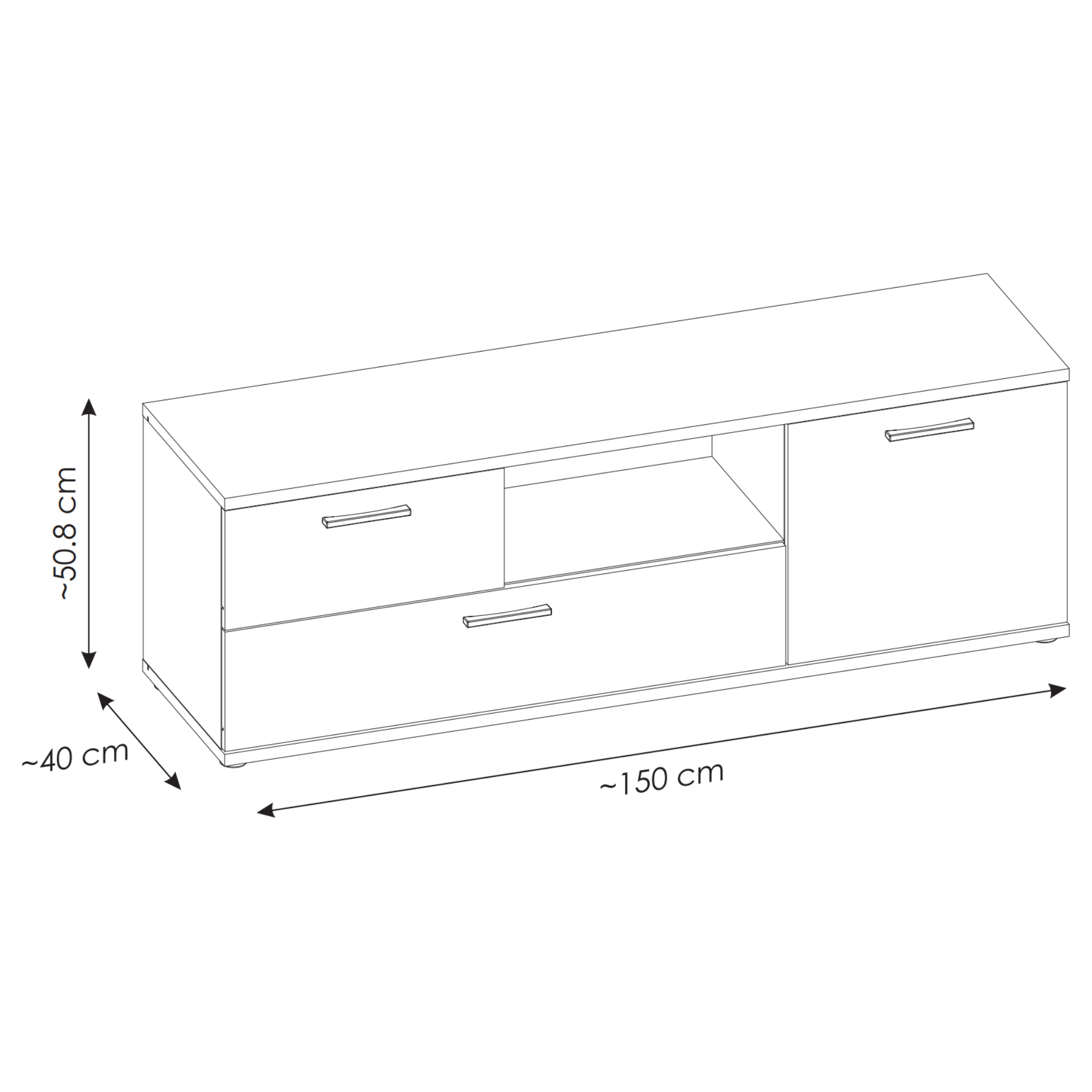 Úložný priestor zahŕňa otvorenú priehradku s otvorom na kabeláž, jednu vnútornú policu za dvierkami a dve zásuvky. Manipulovať s dvierkami a zásuvkami vám navyše uľahčí mechanizmus tichého zatvárania SOFT CLOSE. Povrch TV komody sa vyznačuje jednoduchou údržbou.