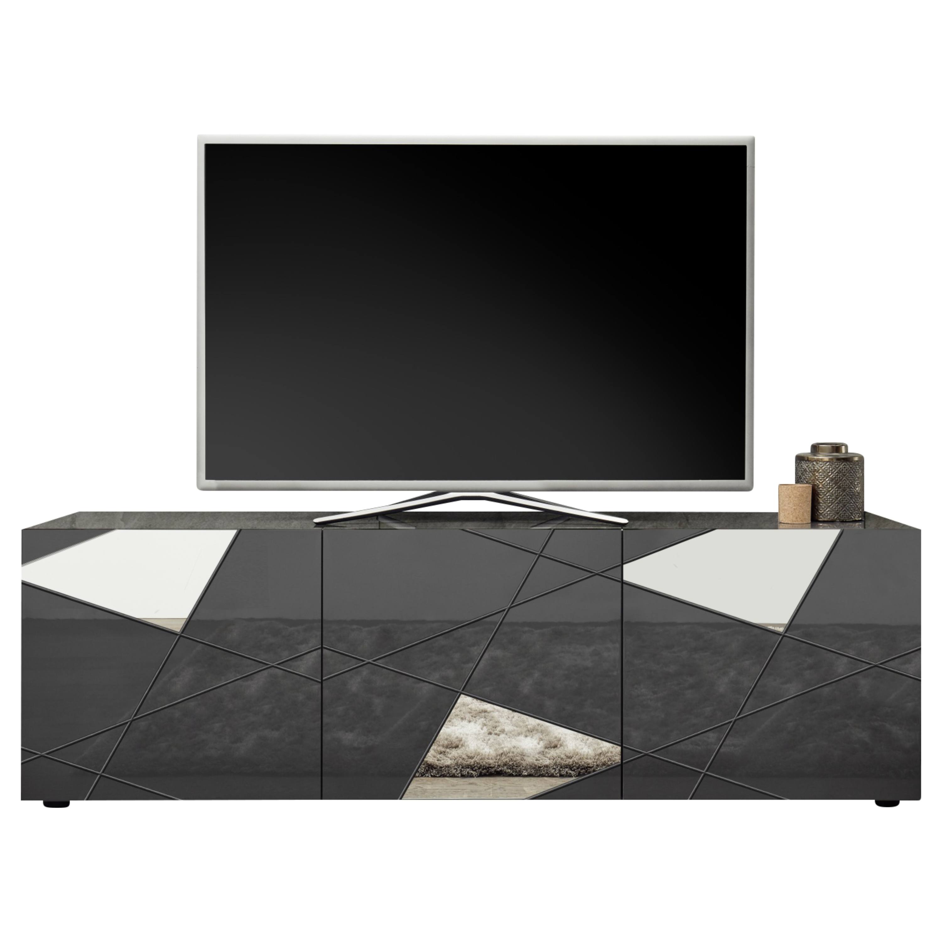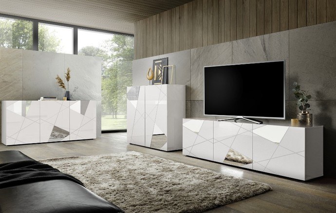 TV komoda VITTORIA 2 v elegantnom poňatí disponuje dekorovanou prednou časťou s lesklým povrchom a zrkadlovou aplikáciou bude dokonalým doplnkom všetkých moderných interiérov.