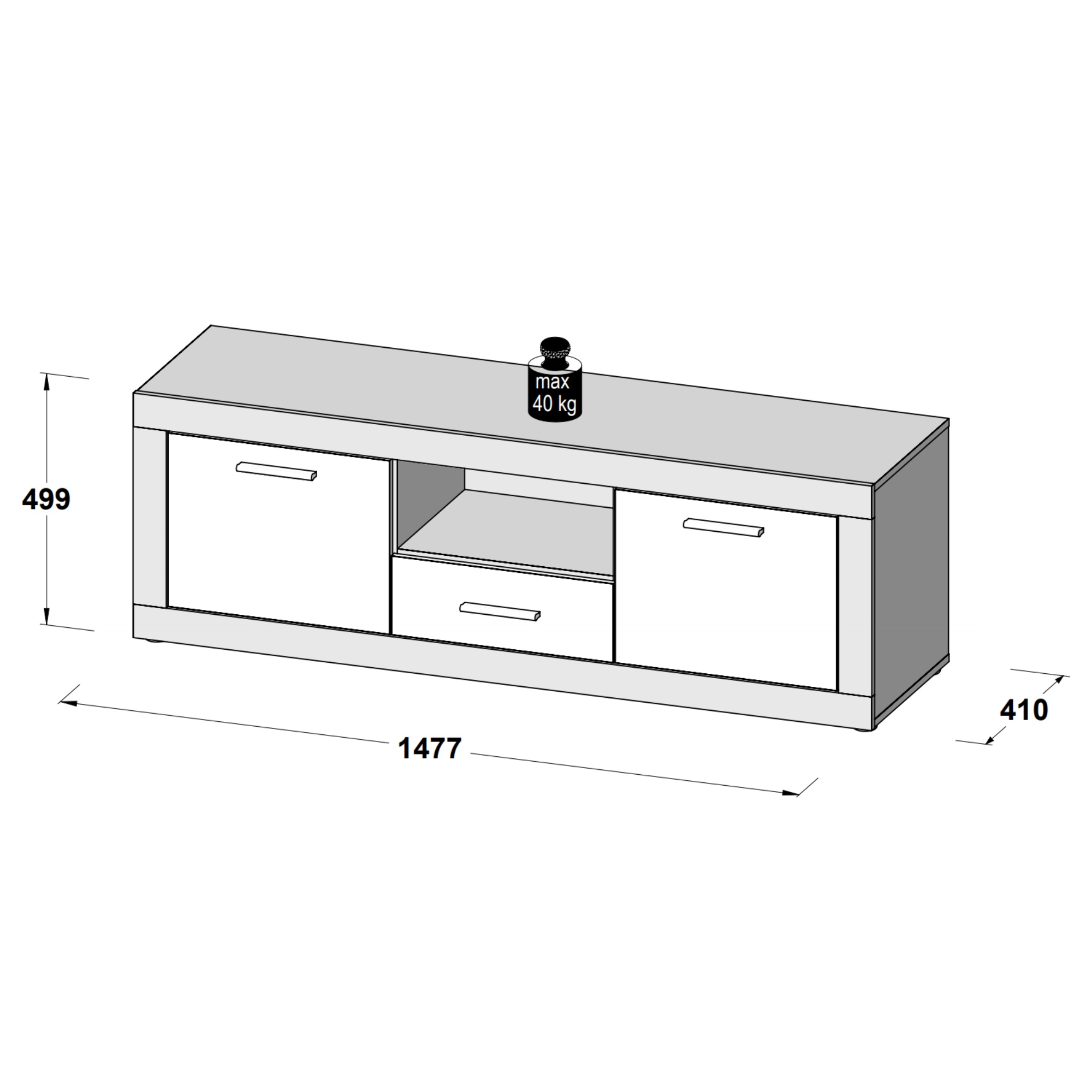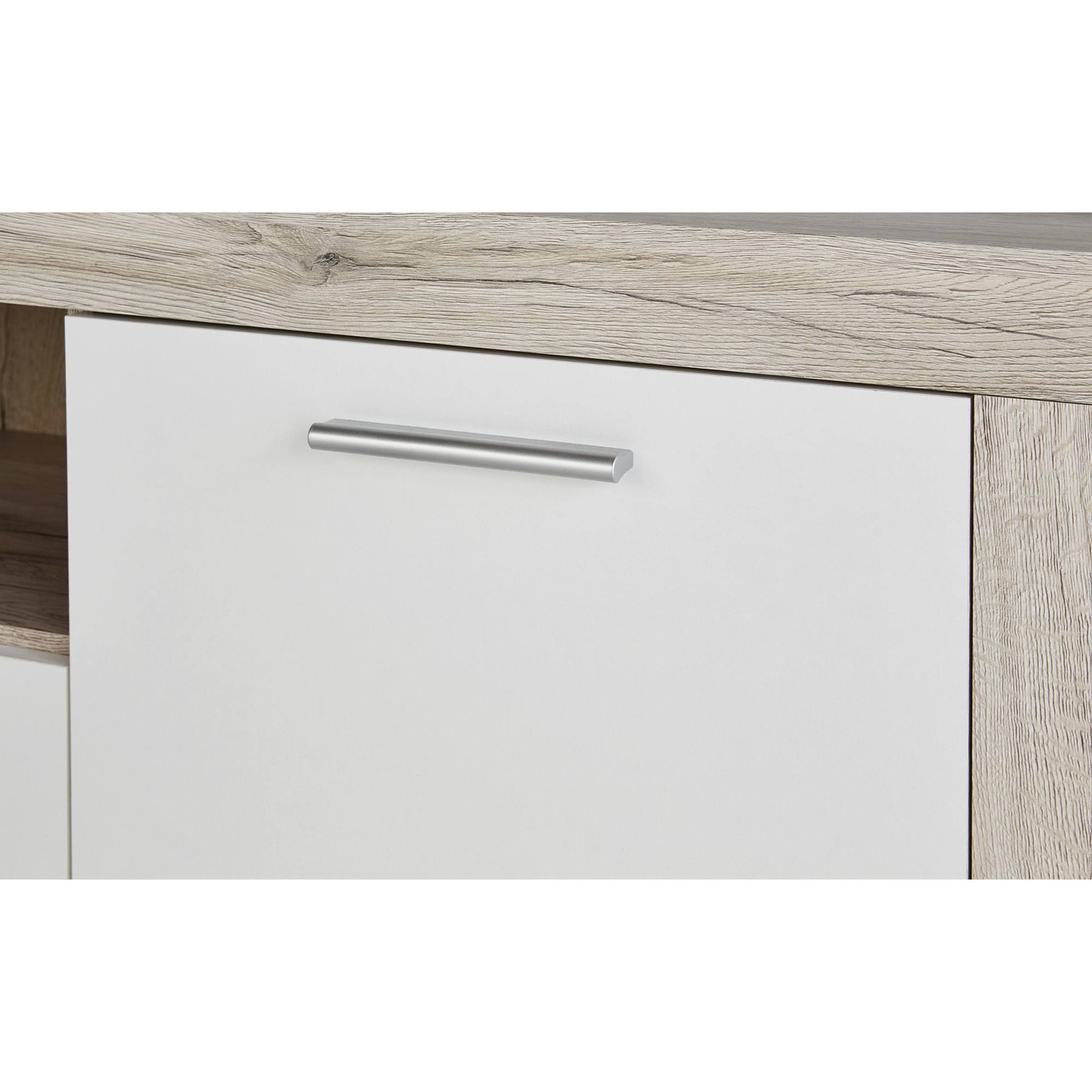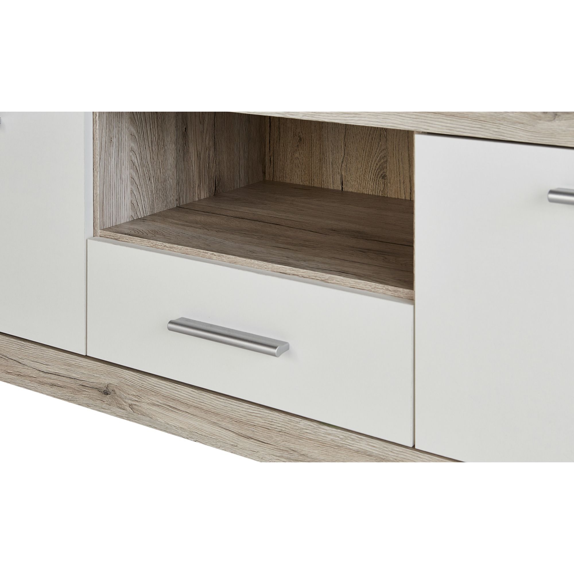 TV komoda BACCIO sa stane praktickou súčasťou vašej obývacej izby, ktorá vám dopraje nerušené sledovanie vašich obľúbených programov. Kombinácia dekora dreva a bielej farby dodáva komode moderný vzhľad. K dispozícii budete mať úložný priestor, ktorý je rozdelený na dve uzatvárateľné skrinky, jednu samostatnú zásuvku a otvorenú policu. Povrch komody sa vyznačuje jednoduchou údržbou.